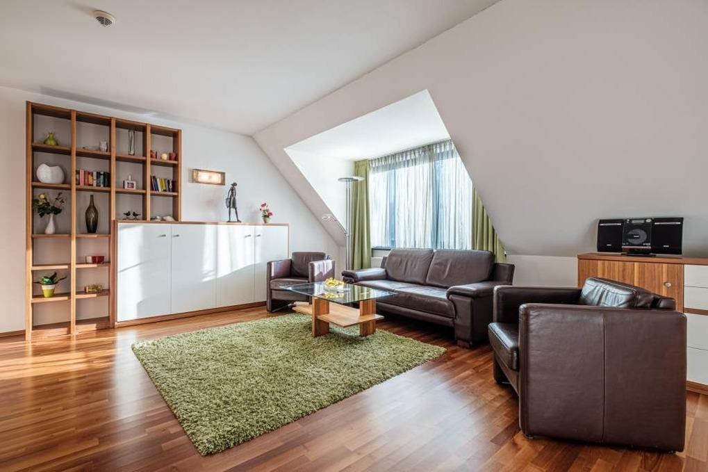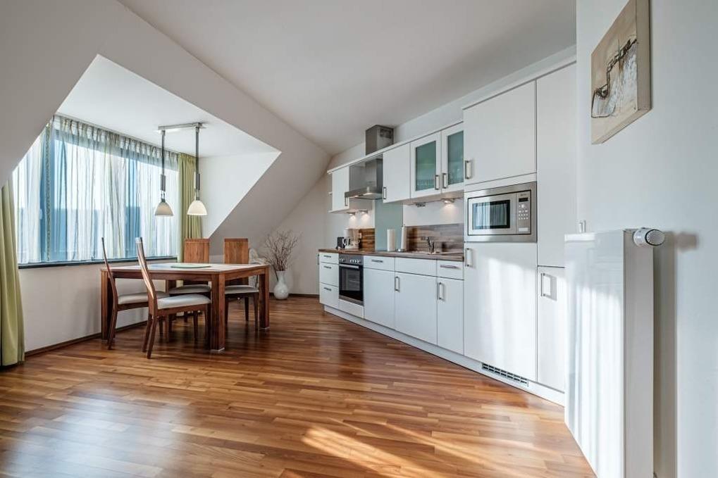 Das große Wohnzimmer verfügt über eine moderne Leder-Couchgarnitur, ein Wandklappbett für 1 Person, Flachbild-TV und Stereo-Anlage. Die offene, in den Wohnraum integrierte Einbauküche ist mit Ceranfeld, Backofen, Mikrowelle und Geschirrspüler sowie einer gemütlichen Essecke ausgestattet.