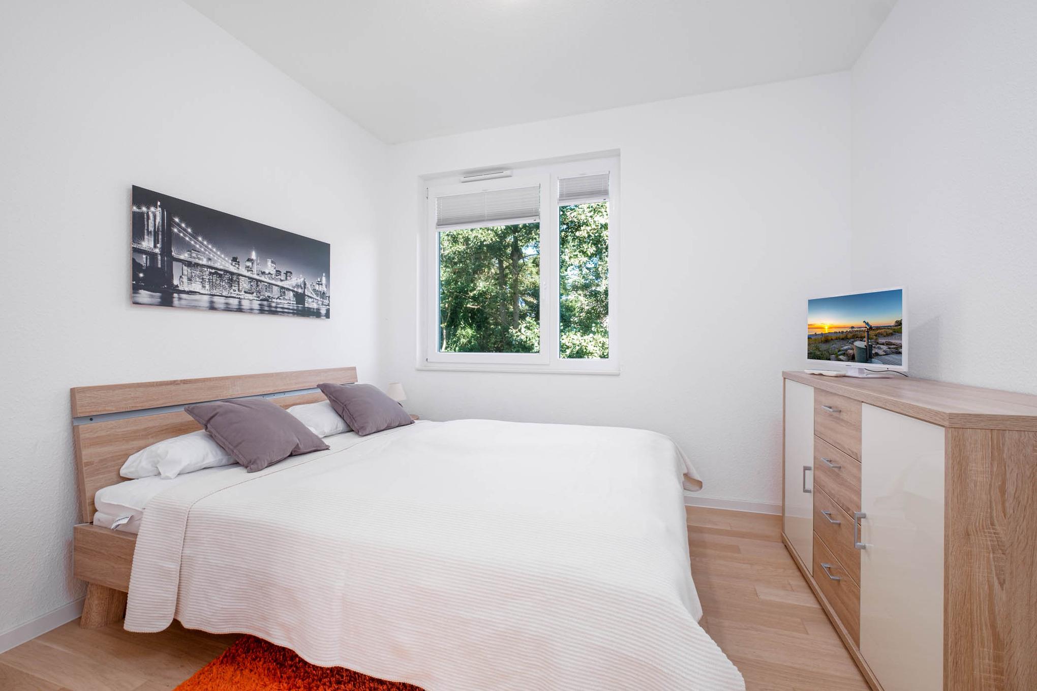 Das Elternschlafzimmer dieser Ferienwohnung ist mit einem Doppelbett (180x200cm) und einem großen Kleiderschrank ausgestattet. Das zweite separate Schlafzimmer verfügt ebenfalls über ein Doppelbett (160x200cm) zusätzlich gibt es in diesem Schlafzimmer einen kleineren Flachbild[-]-TV. Um Ihnen einen erholsamen Schlaf zu garantieren, lassen sich die Schlafräume der Ferienwohnung verdunkeln.