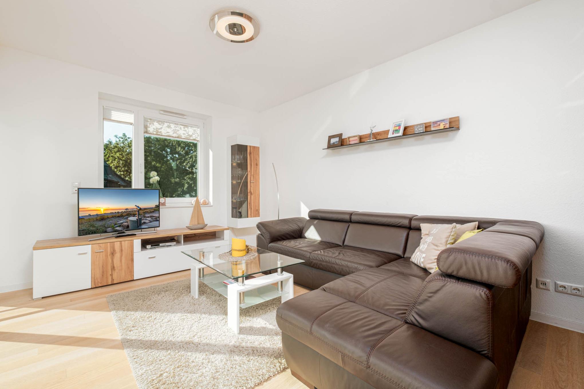 Das große Wohnzimmer ist mit einer Couchgarnitur, Flatscreen-TV, einer Musikanlage und Essecke ausgestattet. Die separate Küche ist gut ausgestattet u.a. mit Backofen, Ceranfeld, Geschirrspüler Kaffeemaschine und Wasserkocher .