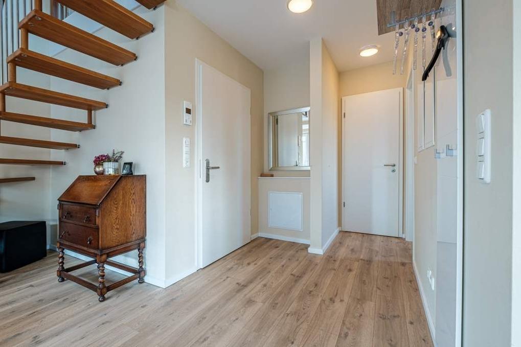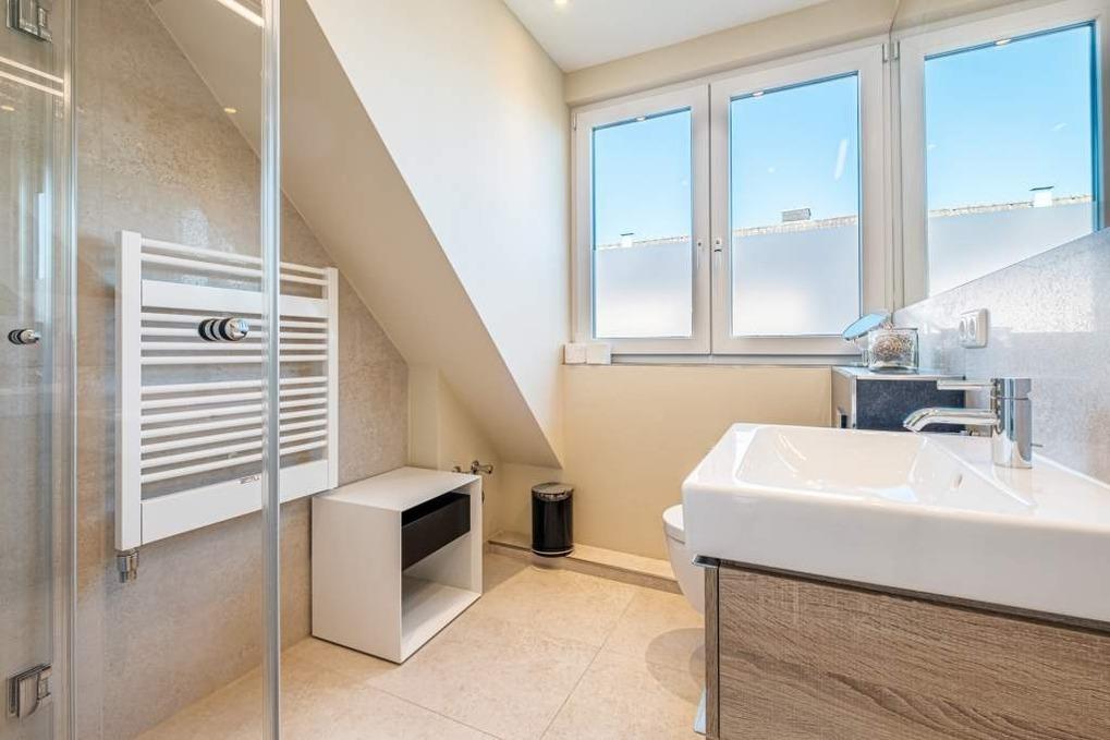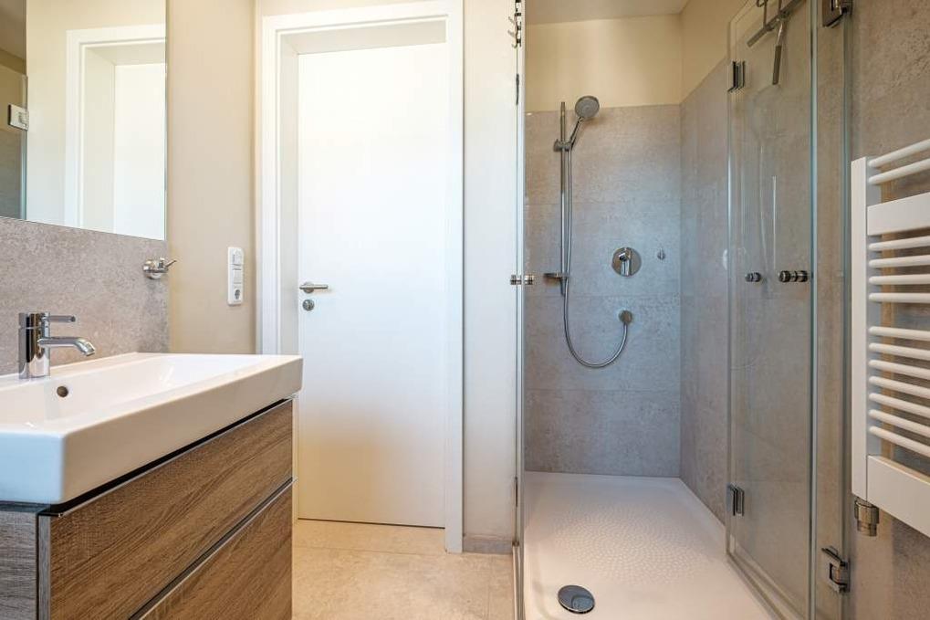 Ein Badezimmer mit großer bodengleicher Dusche, Waschtisch, WC, Handtuchwärmer, Föhn und Schminkspiegel ist vorhanden. Das gesamte untere Geschoss wird über eine Fußbodenheizung beheizt.