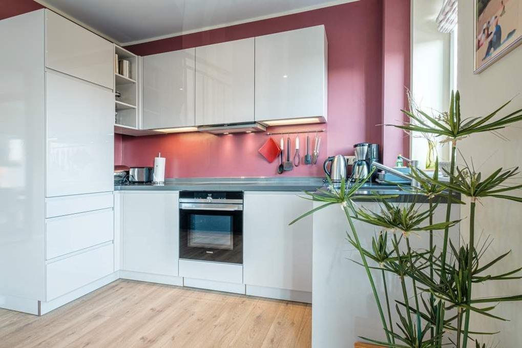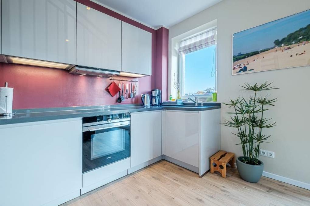 Der Wohn-Essbereich der Timmendorfer Strand Ferienwohnung verfügt über eine moderne Couchgarnitur, einen Flatscreen-TV, Blu-Ray-Player und Bose Soundbox. Die offene Küche ist mit einem Induktionskochfeld, Backofen mit Mikrowellenfunktion, Geschirrspüler und Kühlschrank mit Gefrierfach ausgestattet. Alle weiteren notwendigen Küchenutensilien wie Wasserkocher, Toaster und Kaffeemaschine sind selbstverständlich auch vorhanden.