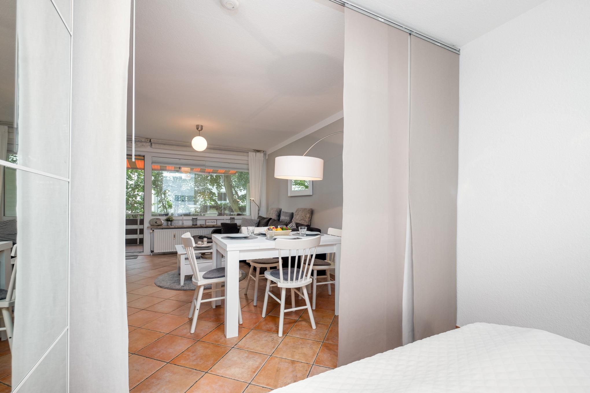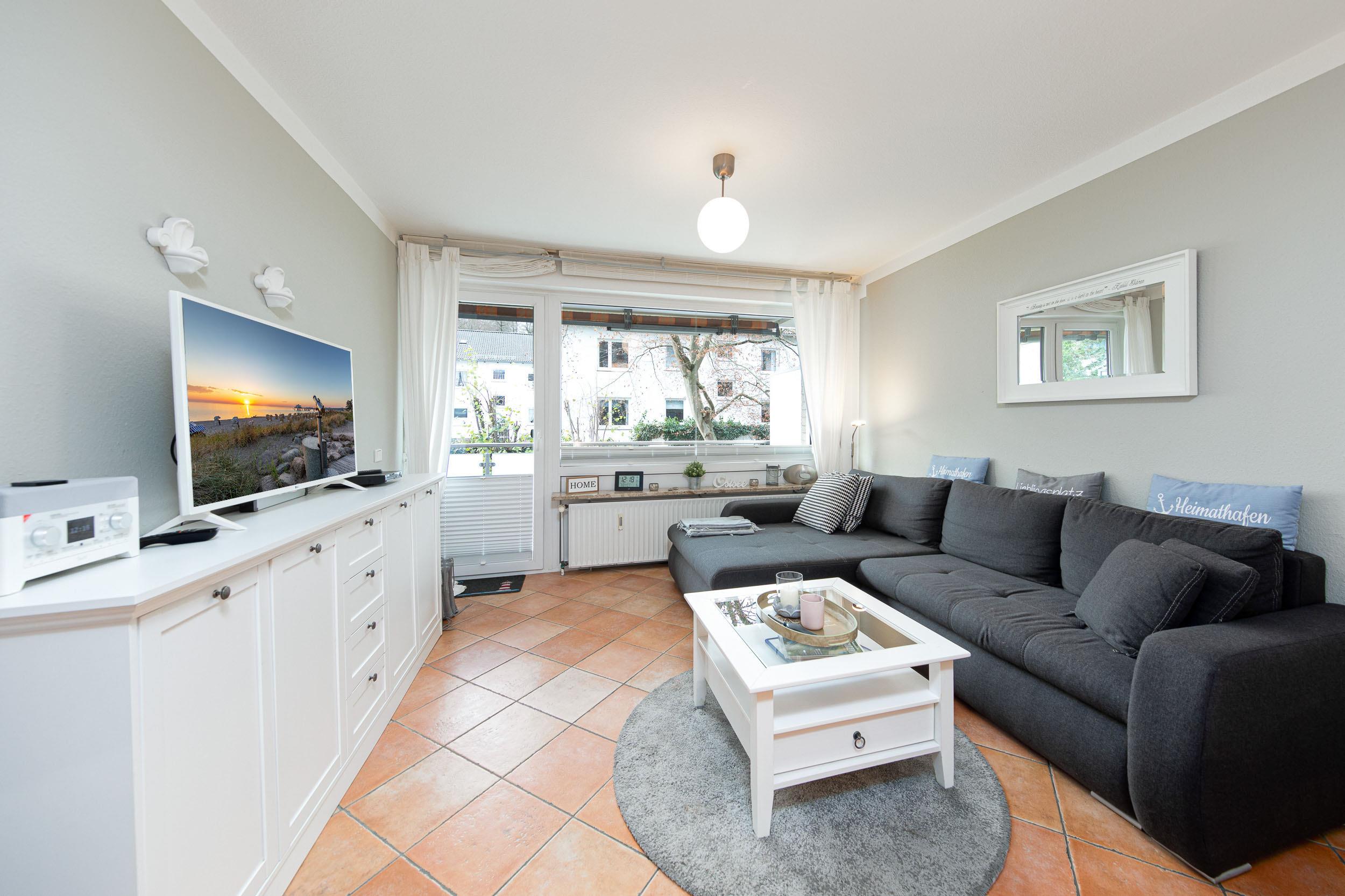 Es empfängt Sie ein gemütliches 2-Zimmer-Appartement in Hochparterre mit möbliertem Balkon, ausgestattet für 4 Personen. Das Wohnzimmer der Timmendorfer Strand Ferienwohnung ist mit einer hochwertigen Couchgarnitur, Flatscreen-TV, DVD-Player und Stereo-Anlage eingerichtet. Des Weiteren befindet sich im Wohnzimmer eine 'Schlafnische', in der sich ein Doppelbett sowie eine Schrankwand befinden. Durch eine Stoffpaneele kann die Schlafnische vom Wohnraum abgetrennt werden.