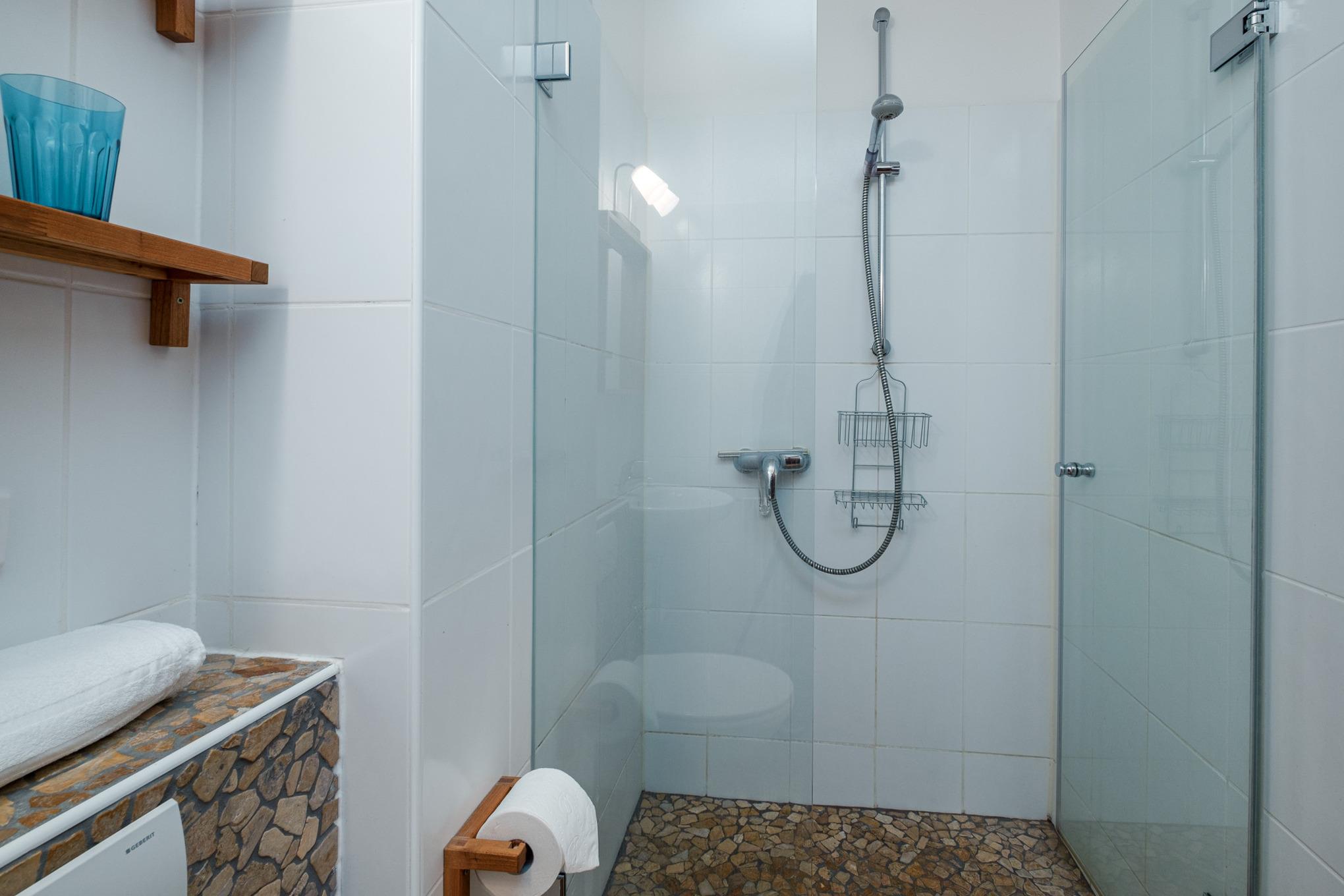 Das Badezimmer dieser Timmendorfer Strand Ferienunterkunft verfügt über eine Dusche und ein WC.