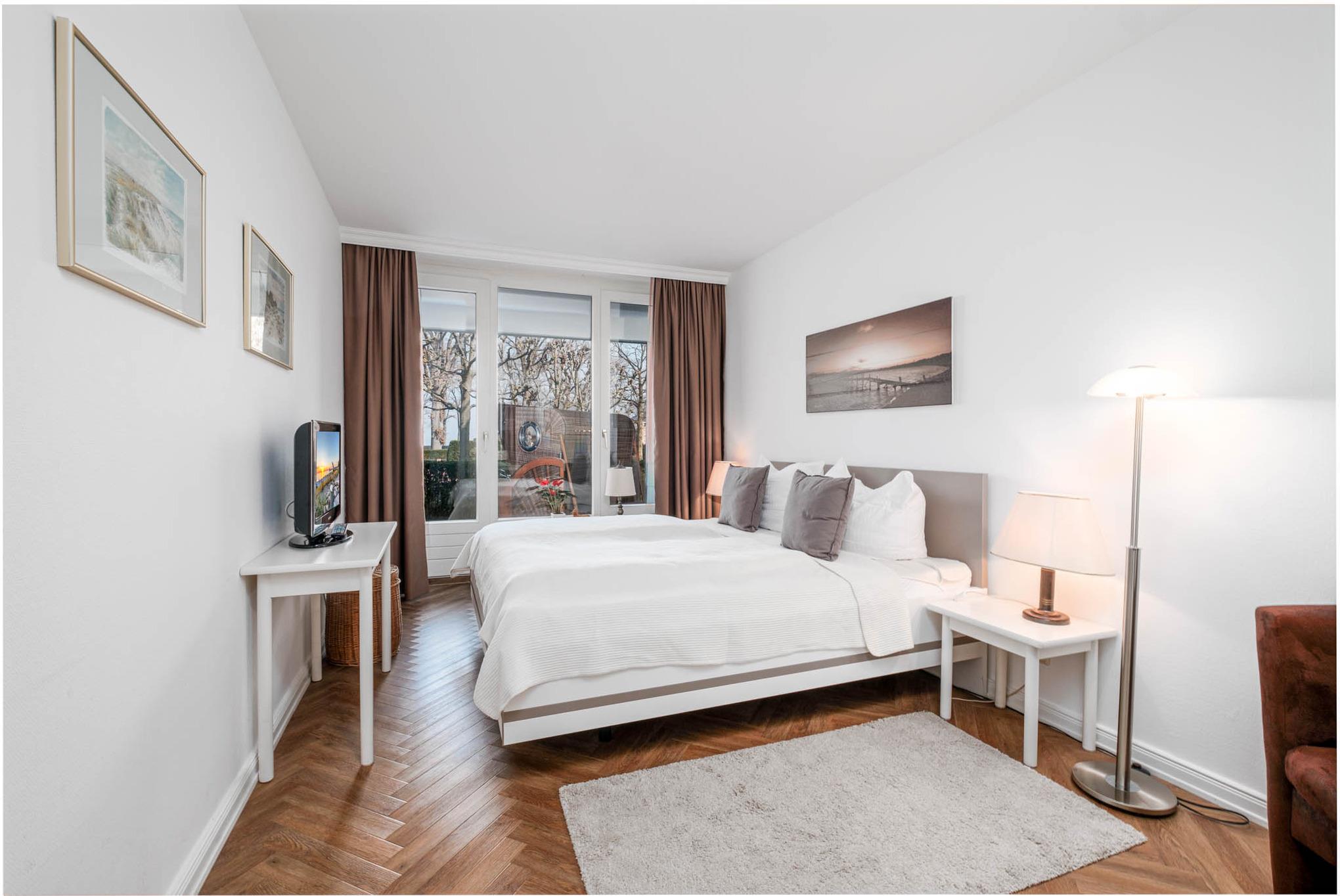 Das separate Schlafzimmer dieser Ferienwohnung ist mit einem Doppelbett (180x200cm) und einem weiteren Flatscreen-TV ausgestattet. Das Badezimmer verfügt über eine Badewanne mit Duschvorrichtung.