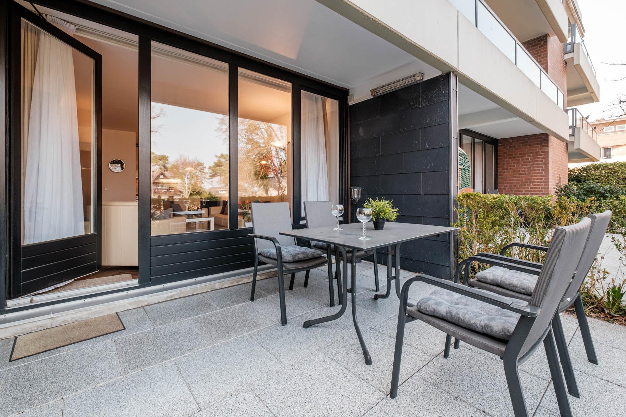 Die möblierte Terrasse mit Meerblick, Strandkorb und einer Sonnenliege rundet diese komfortable Ferienwohnung in Timmendorfer Strand an der Ostsee ab.
