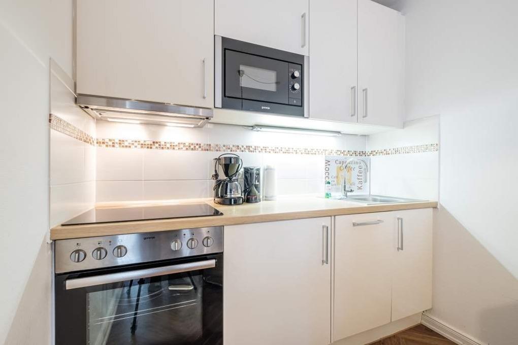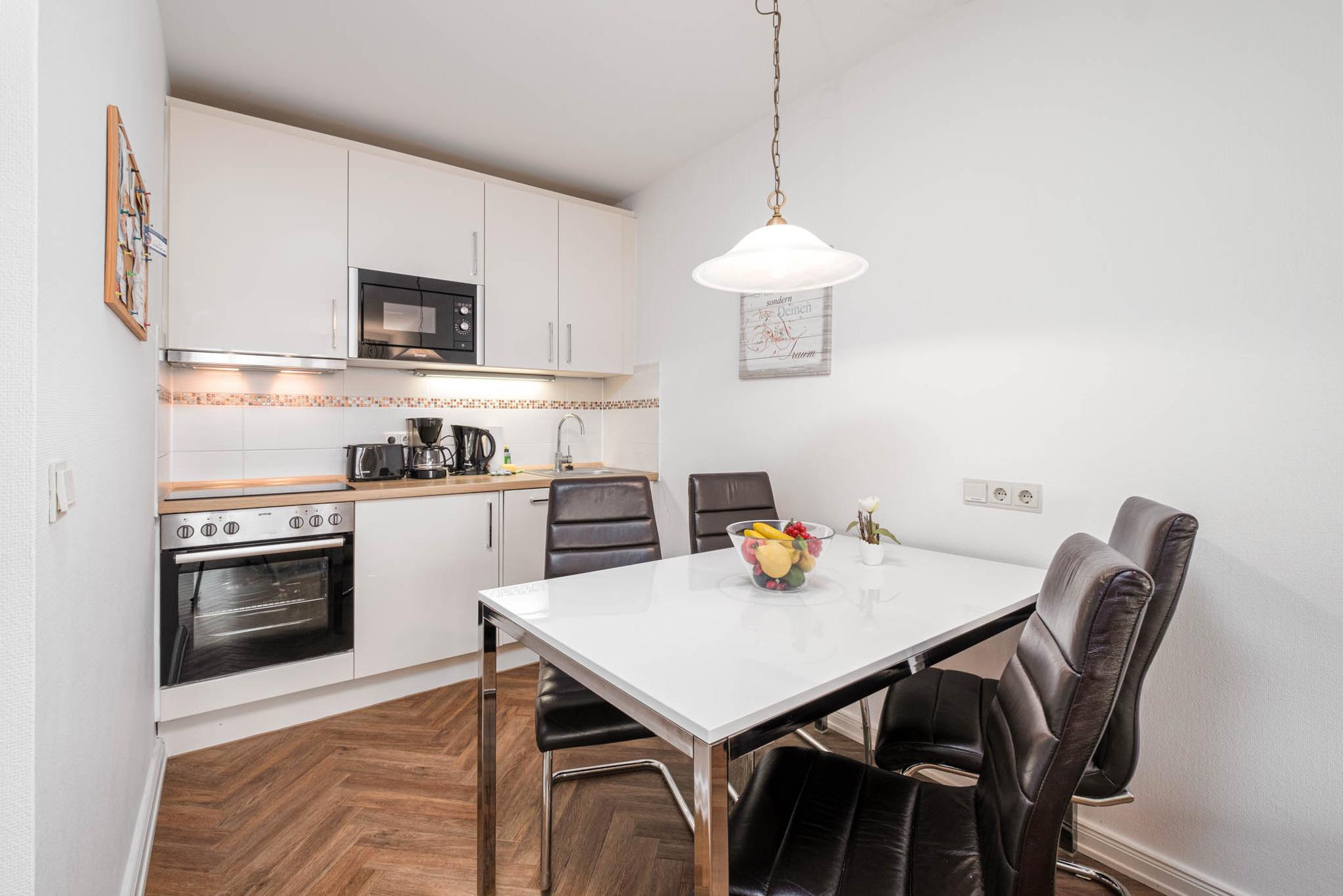 Das gemütliche 2-Zimmer-Appartement Nr. 107 ist für maximal 4 Personen ausgestattet und liegt im Erdgeschoss mit Süd-Ost-Terrasse und Meerblick. Das Wohn-/Schlafzimmer der Timmendorfer Strand Ferienwohnung ist mit einer Ausziehcouch (140x190cm), Flatscreen-TV und einer Essecke ausgestattet. Die Küchenzeile verfügt über ein Ceranfeld, Backofen, Mikrowelle und Geschirrspüler sowie einen Toaster, eine Kaffeemaschine und einen Wasserkocher.