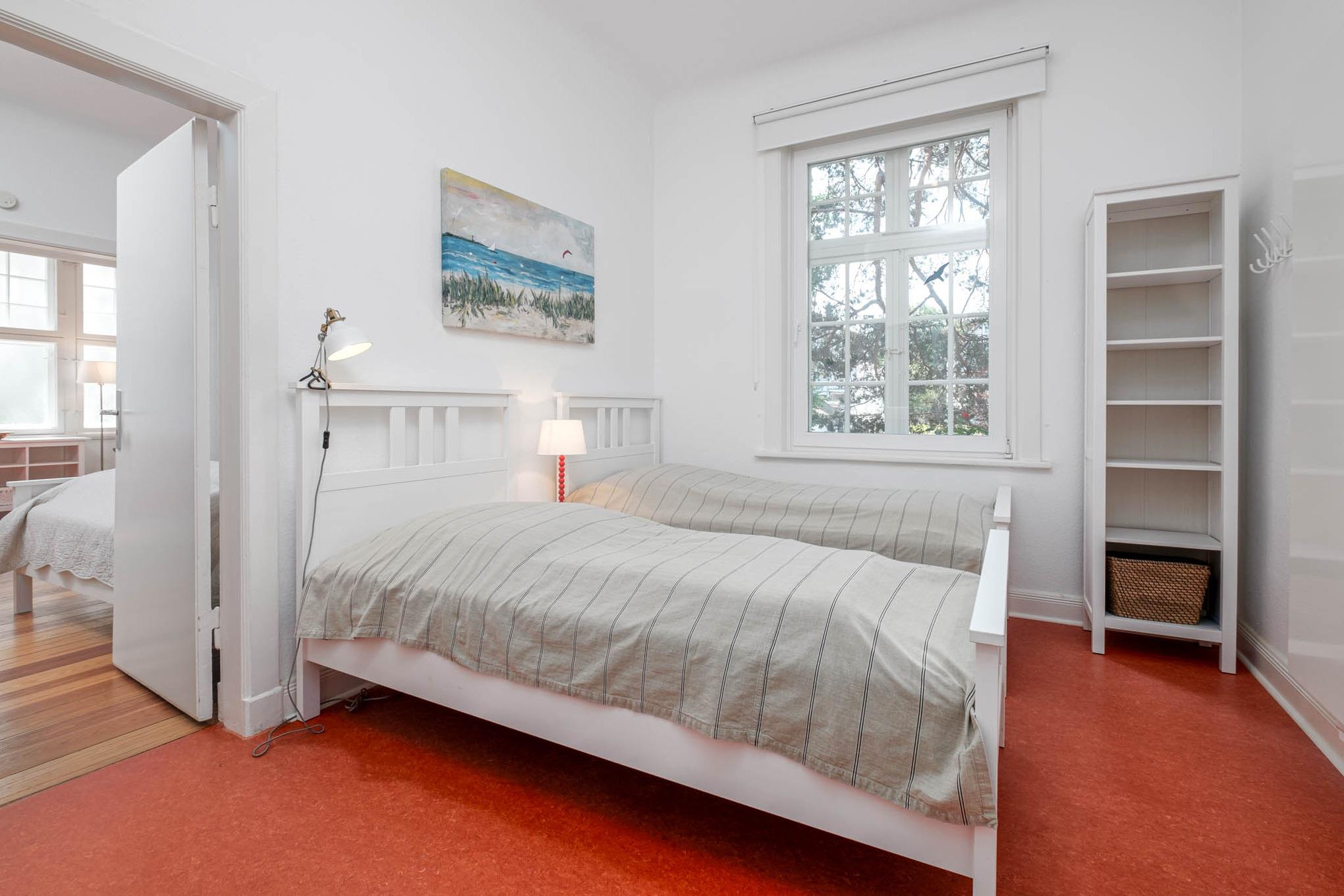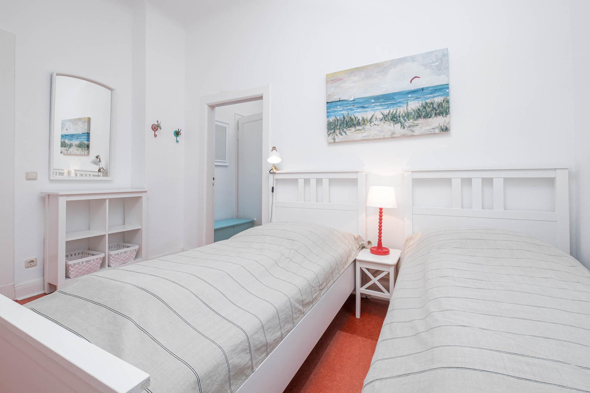 In diesem gemütlichen Urlaubsdomizil am Strand finden Sie zwei separate Schlafzimmer vor. Das Schlafzimmer I der Timmendorfer Strand Ferienwohnung ist mit einem Doppelbett eingerichtet. Das Schlafzimmer II verfügt über zwei Einzelbetten. Das Badezimmer ist mit einer Dusche ausgestattet.