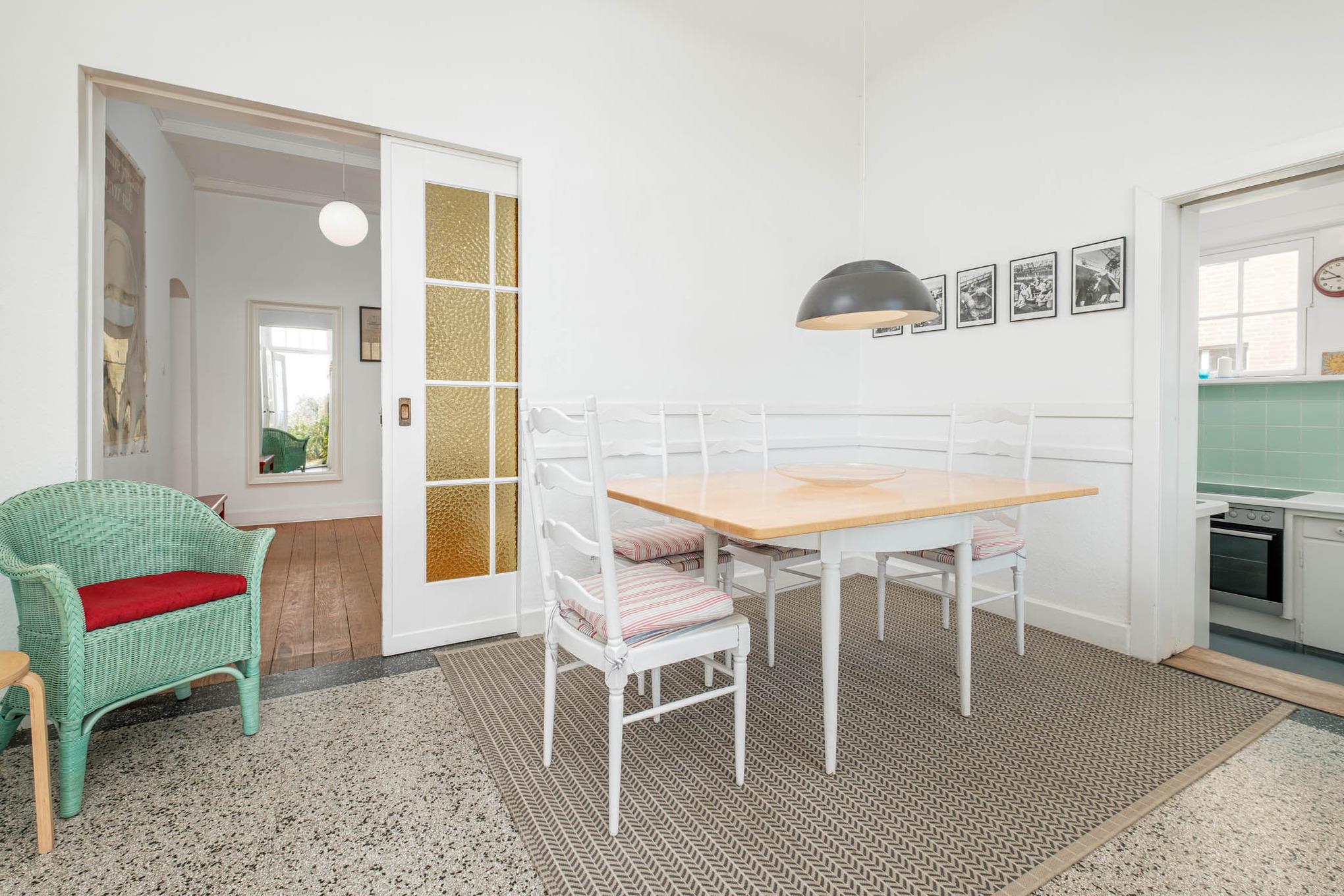 Das Appartement Nr. 2 in der Villa am Strand liegt im Erdgeschoss des Hauses und ist für max. 4 Personen eingerichtet. In diesem Urlaubsdomizil an der Ostsee genießen Sie einen traumhaften Meerblick. Das großzügige Wohnzimmer verfügt über ein Sofa und einen Flatscreen-TV. Das Esszimmer mit der Sitzecke lädt zum Verweilen bei traumhaftem Meerblick ein. Die separate Küche ist mit Ceranfeld, Backofen, Geschirrspüler, Kaffeemaschine, Wasserkocher und Toaster ausgestattet.