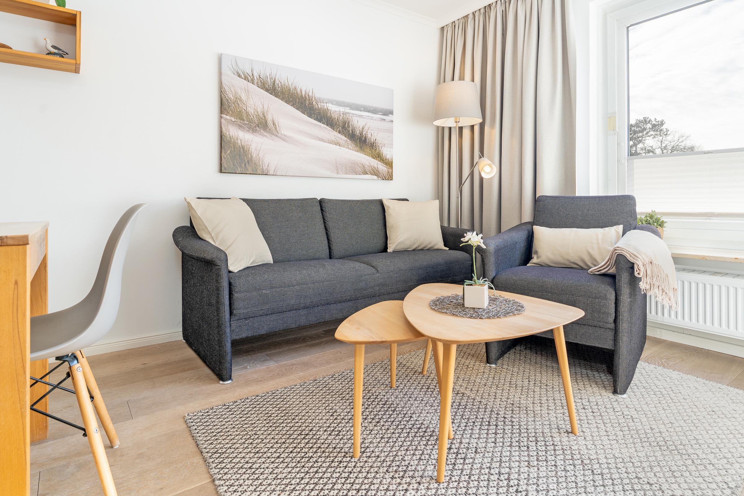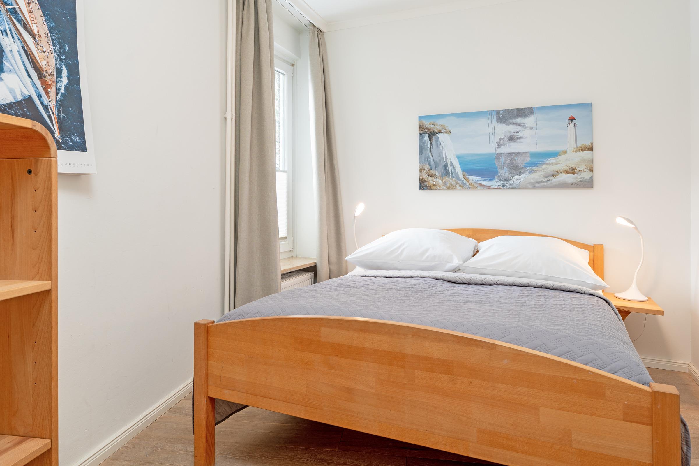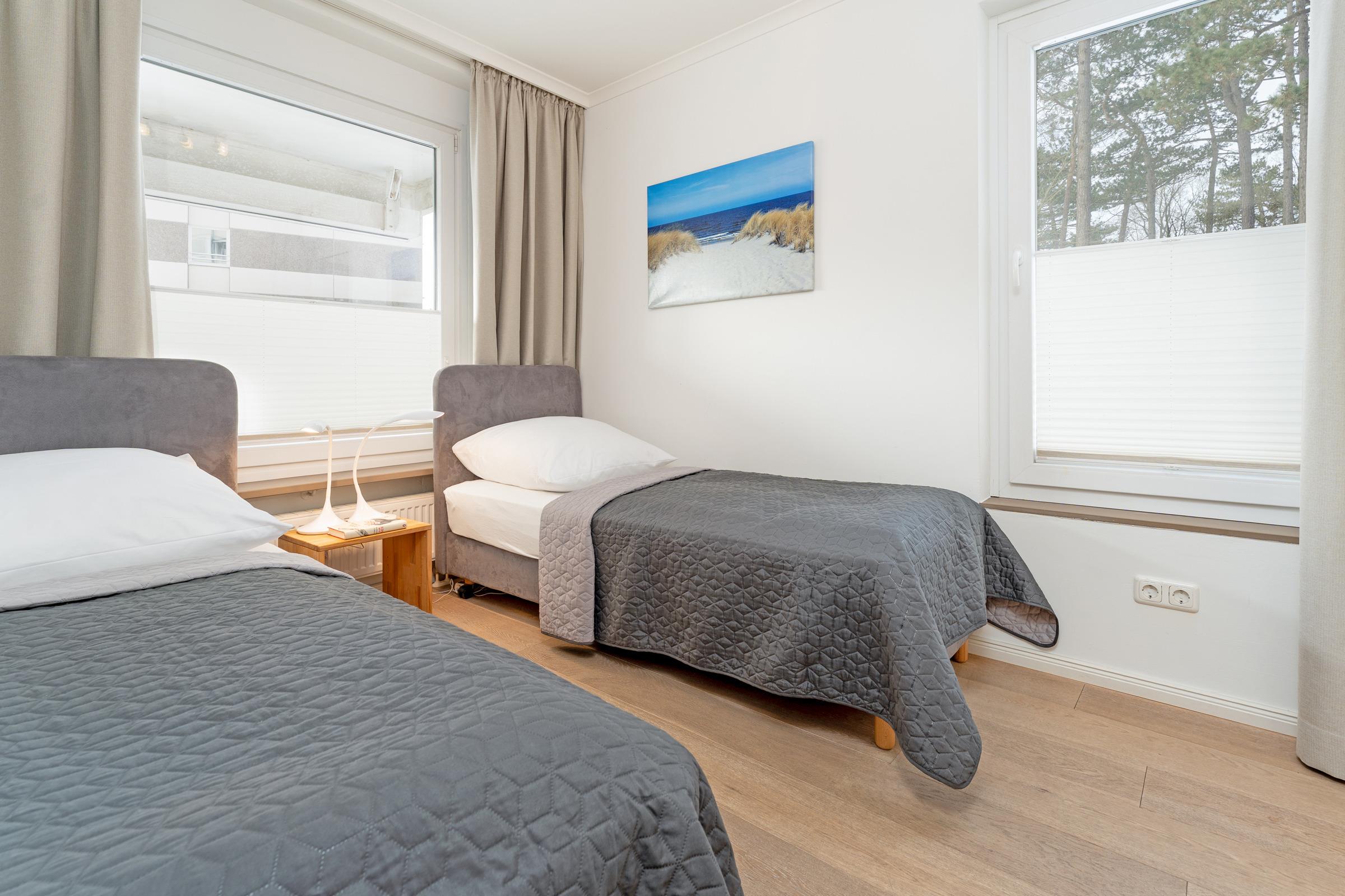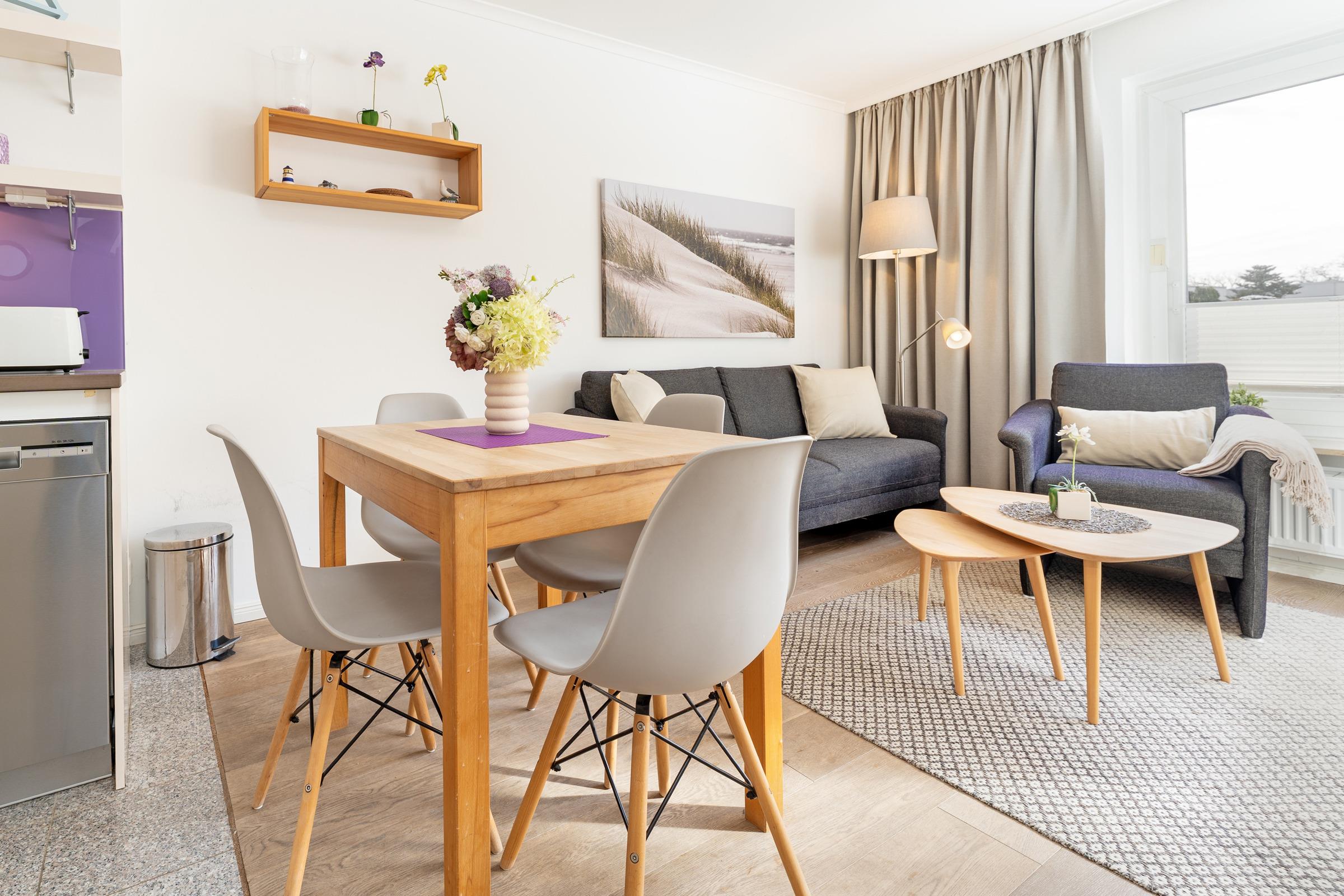 Beim Betreten der Wohnung gelangen Sie zunächst in den freundlich gestalteten Wohnbereich, der mit gemütlicher Sitzecke, TV sowie WLAN zum Entspannen einlädt. Von hier aus haben Sie Zugang zum Balkon, der mit Gartenmöbeln ausgestattet ist und sich hervorragend für ein Frühstück an der frischen Seeluft oder entspannte Abendstunden eignet. Anschließend führt der Rundgang in die separate Küche, die bestens ausgestattet ist: Ein Kombigerät aus Mikrowelle und Backofen, Herd, Kühlschrank mit Gefrierfach, Wasserkocher, Toaster sowie eine Tassimo-Kaffeemaschine lassen keine Wünsche offen. Der angrenzende Essbereich bietet ausreichend Platz für gemeinsame Mahlzeiten. Die Wohnung verfügt über zwei Schlafzimmer – eines mit französischem Doppelbett und eines mit zwei Einzelbetten – und bietet somit komfortable Schlafmöglichkeiten für Paare oder Familien. Das Badezimmer ist mit Dusche, WC und Waschbecken ausgestattet und rundet den Wohnkomfort ab.