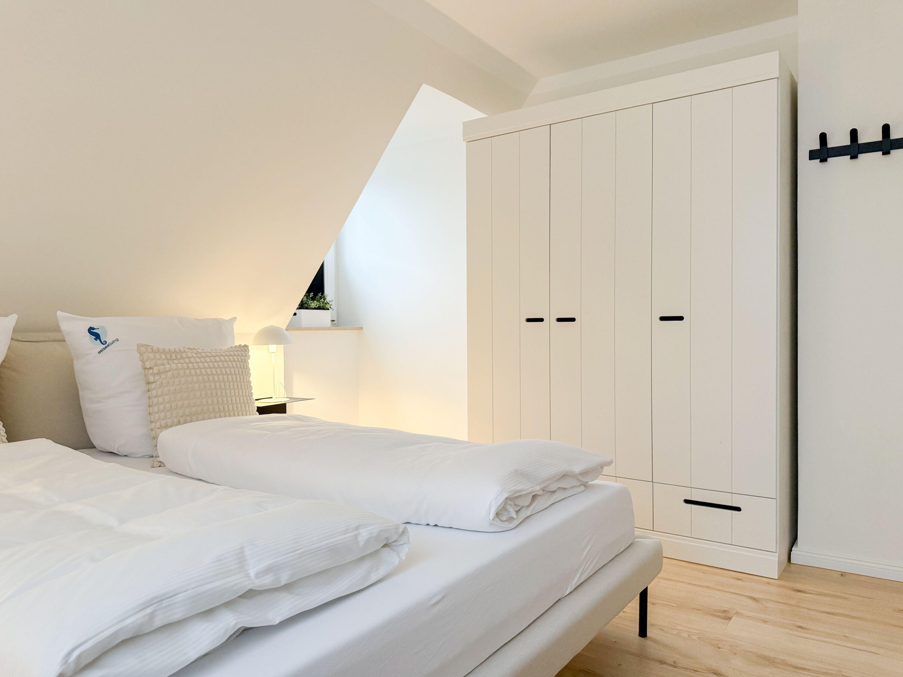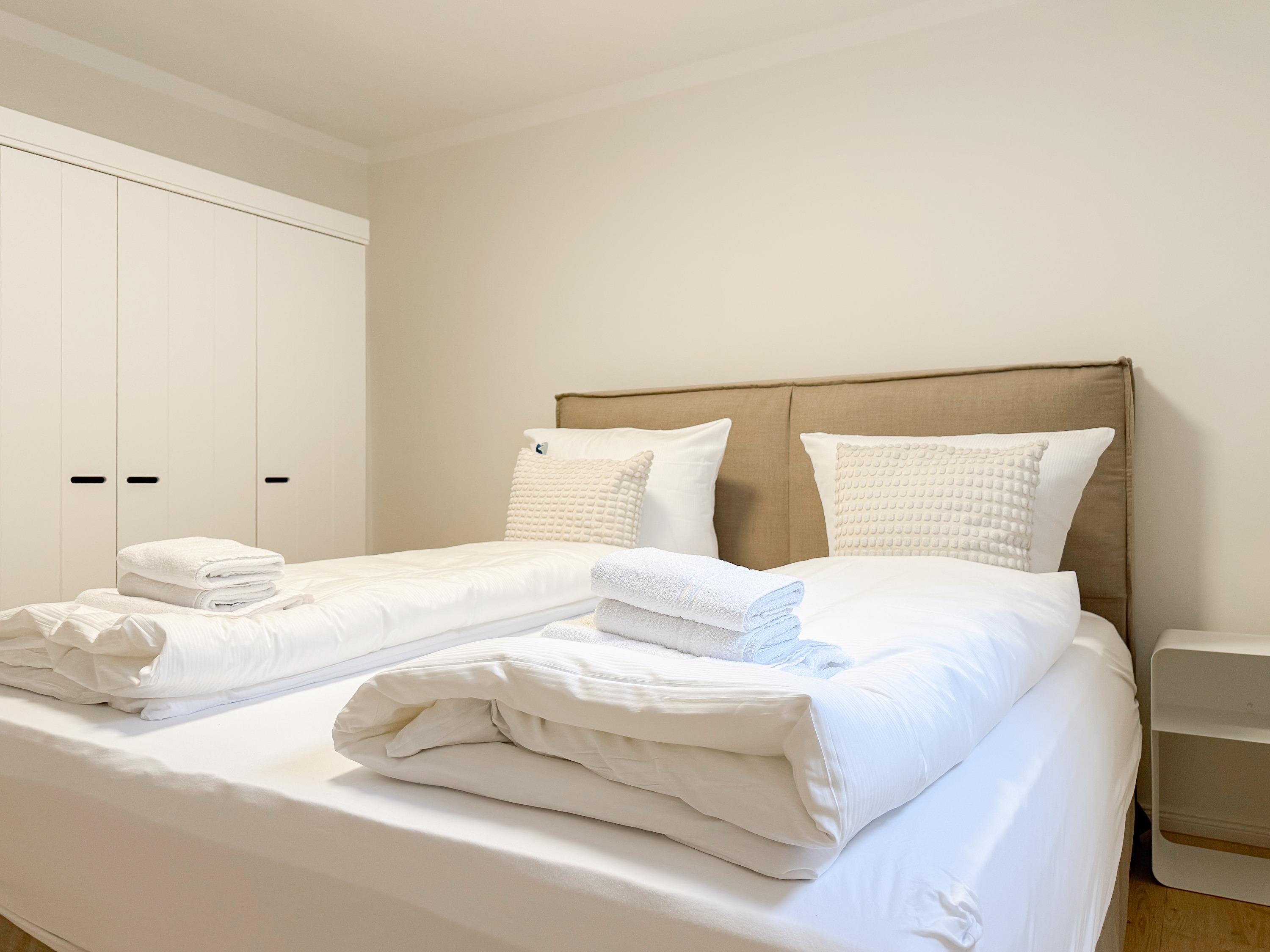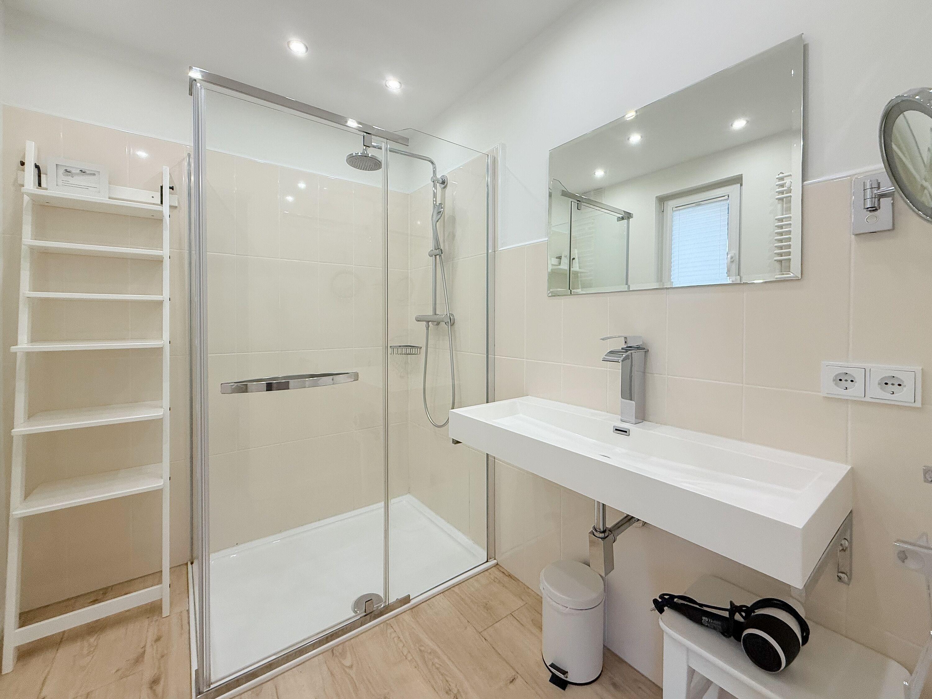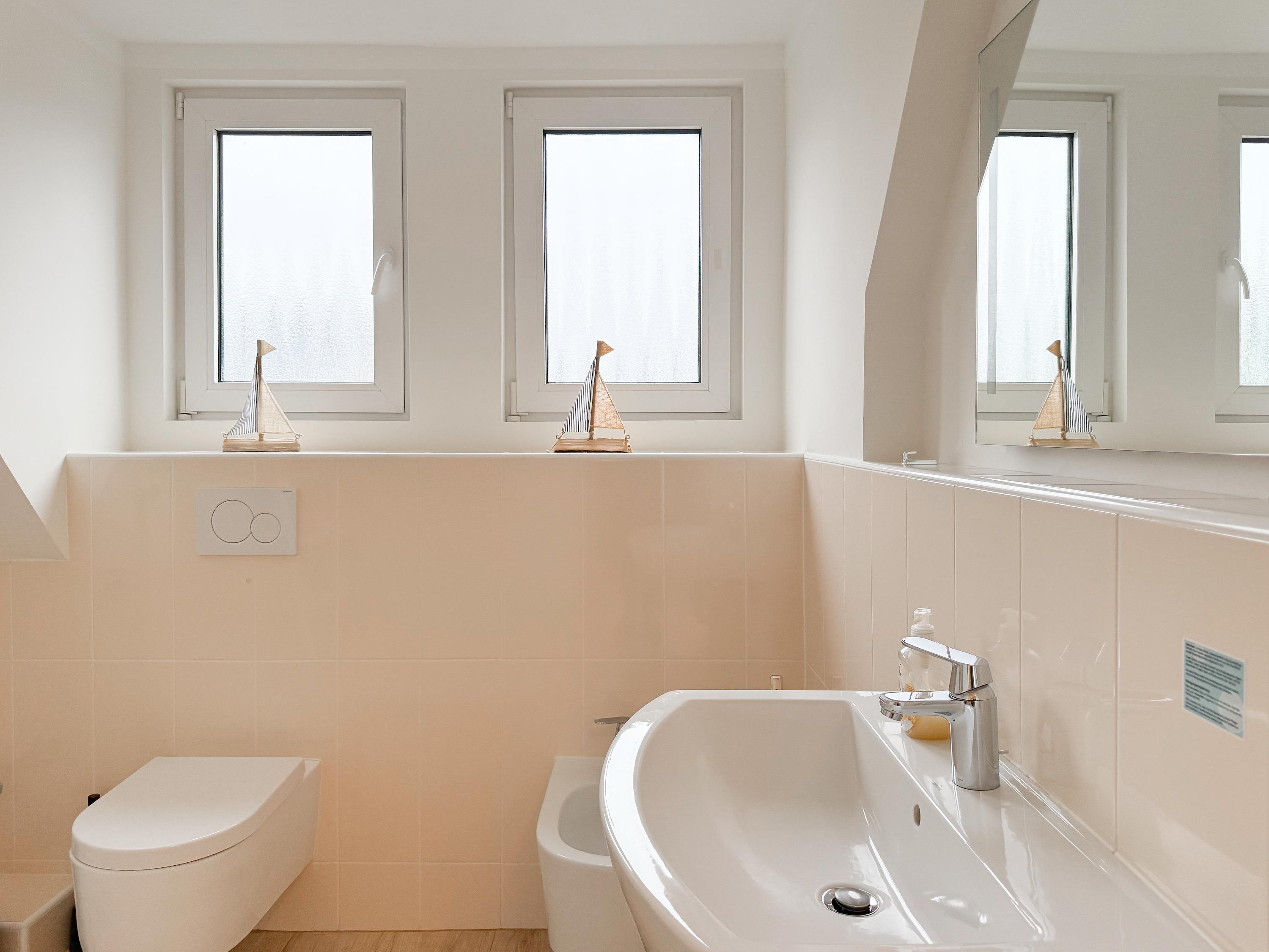 Ebenfalls im Erdgeschoss erwartet Sie ein großzügiges, lichtdurchflutetes Wohnzimmer mit XXL Sofalandschaft und Leseecke, ein modernes Duschbad mit separatem WC sowie zwei Schlafzimmer, die mit Boxspringbettenn (180x200), Kleiderschränken mit ausreichend Stauraum sowie Verdunkelungsvorhängen und eigener Sonnenterrasse zum einen und mit Blackout Plissees zum anderen ausgestattet sind. Im Obergeschoss befinden sich 3 weitere Schlafzimmer mit Doppelbetten (180x200), Kleiderschränken, Blackout Plissees und 2 weitere TV, das zweite Duschbad mit vorgelagertem Balkon sowie ein separates WC mit Waschtisch und Bidet. WLAN steht selbstverständlich zur Verfügung. Waschmaschine und Trockner befinden sich im Keller.
