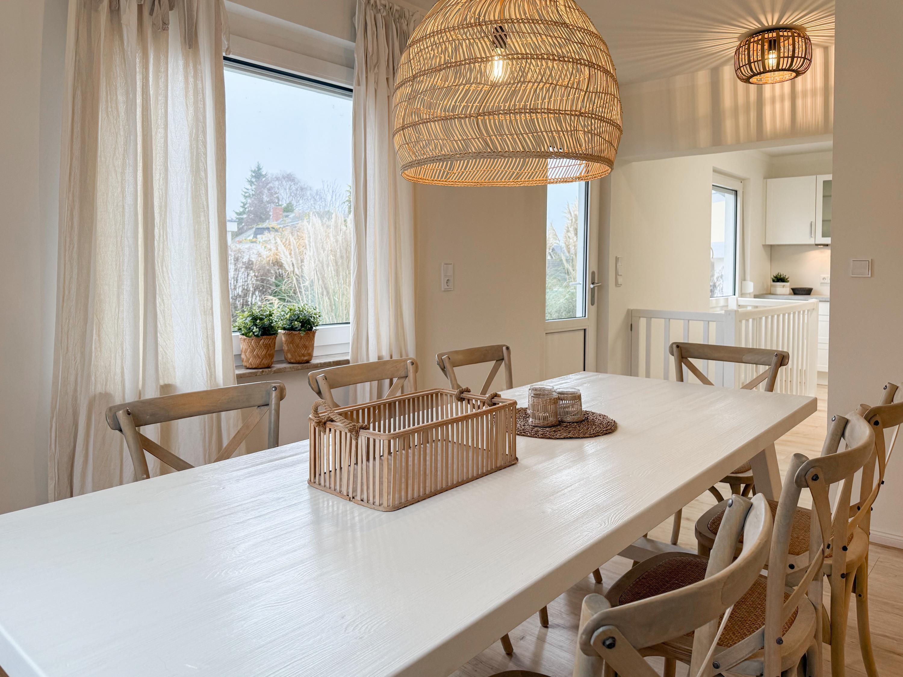 Das Cozy Home ist neu und hochwertig mit viel Liebe zum Detail eingerichtet und bietet mit 5 Schlafzimmern, 2 Duschbädern und 2 separaten WCs ausreichend Freiraum für 8 Personen, um einen entspannten Ostseeurlaub in Strandnähe zu verleben. Schon beim Hereinkommen ist eine angenehme Atmosphäre zu spüren, die von Wärme und Licht erfüllt ist, sodass man sich sofort wohl fühlt. Im Erdgeschoss erwartet Sie eine großzügige und perfekt ausgestattete Wohnküche, die alle Annehmlichkeiten bietet, um jeden Hobbykoch zu begeistern. Hier können Sie sich in geselliger Runde beim Kochen austauschen und kreativ sein. Der gemütliche Essbereich mit schönem Blick und Zugang in den Garten bietet ausreichend Raum für gemeinsame Mahlzeiten und geselliges Beisammensein.[nbsp] Die vorgelagerte kleine Terrasse eignet sich hervorragend für den ersten Morgenkaffee. Im hinteren Teil des vollständig eingezäunten Grundstücks befindet sich eine weitere, große Sonnenterrasse mit Gartenmöbeln und Sonnenliegen für viele schöne Stunden im Freien.