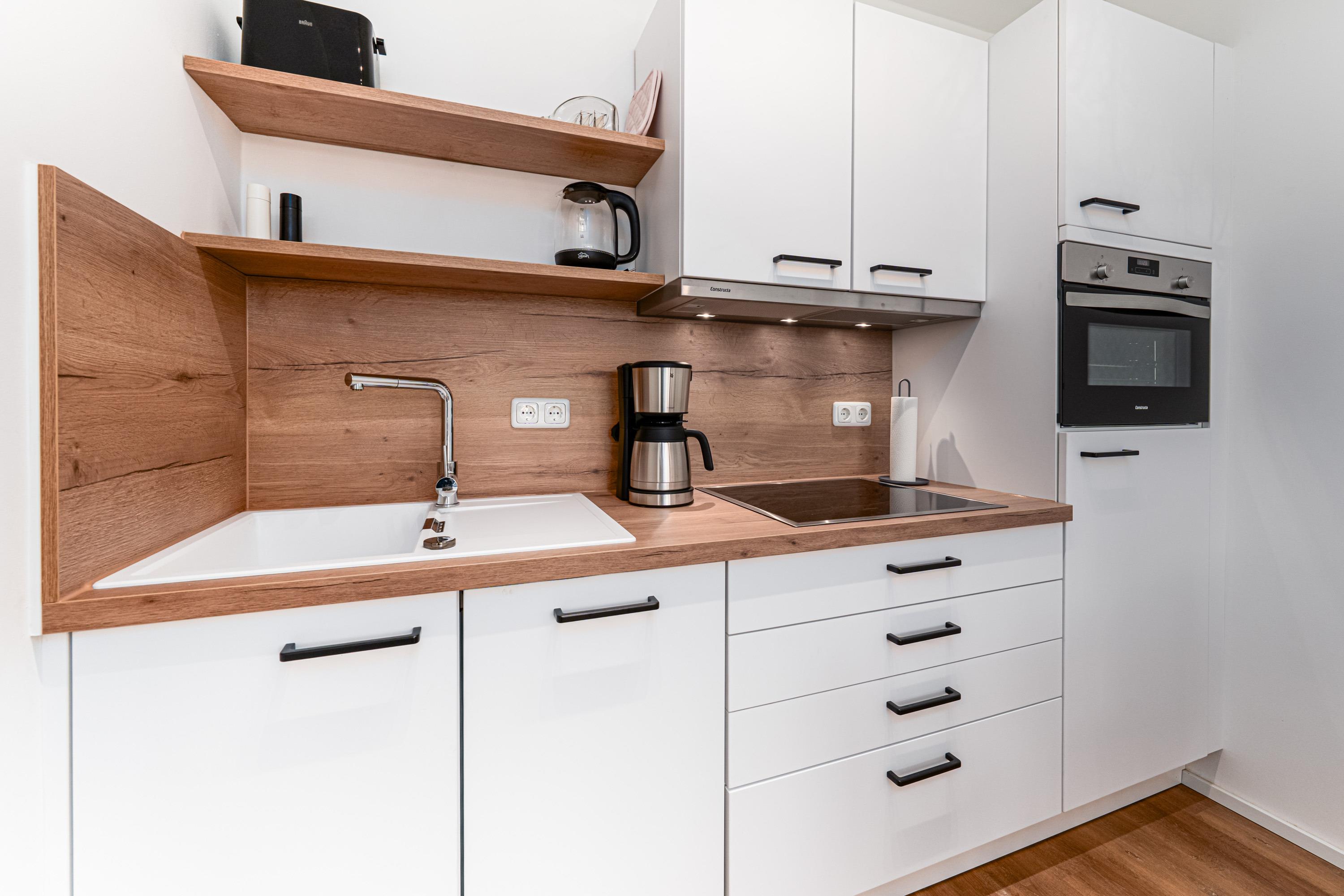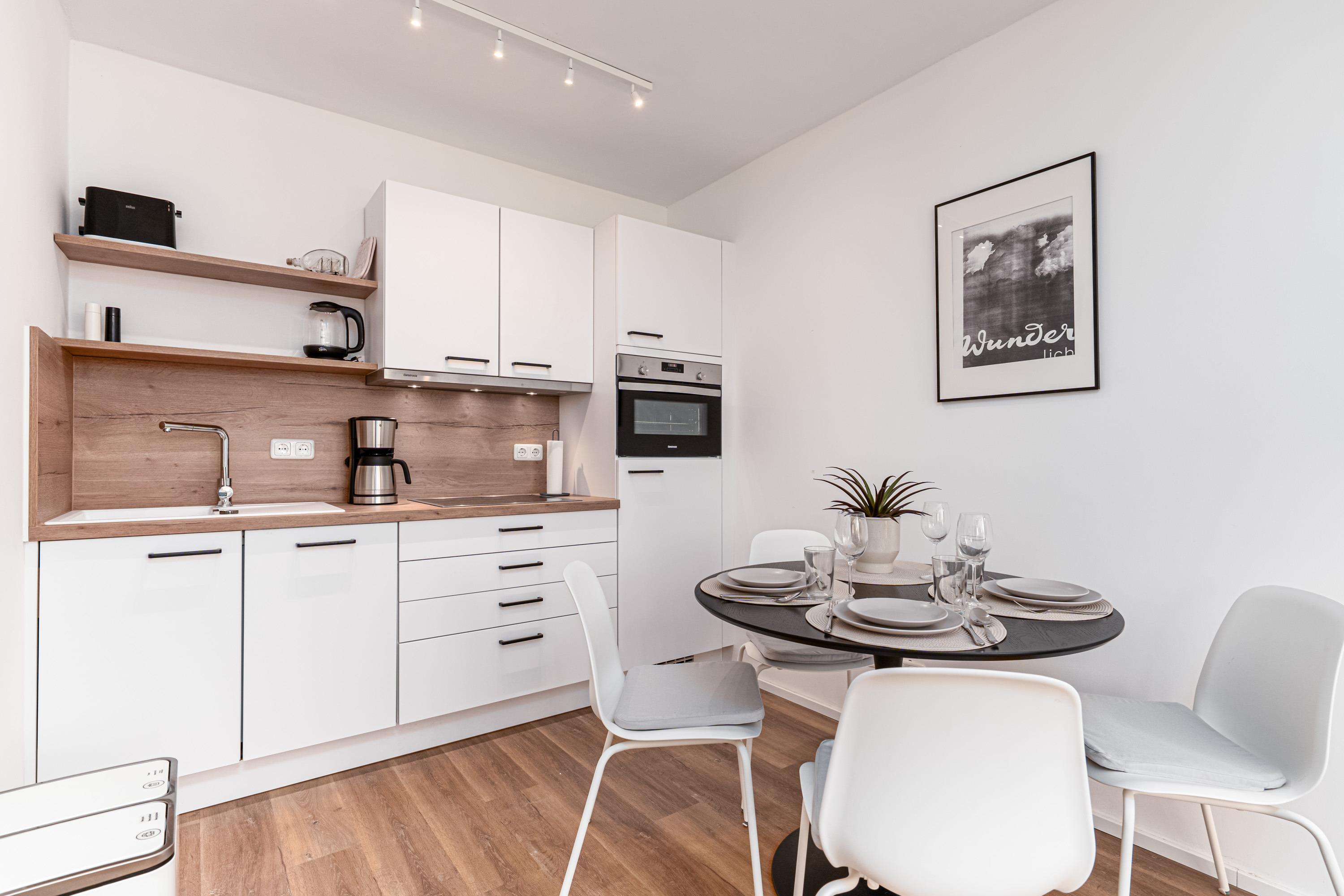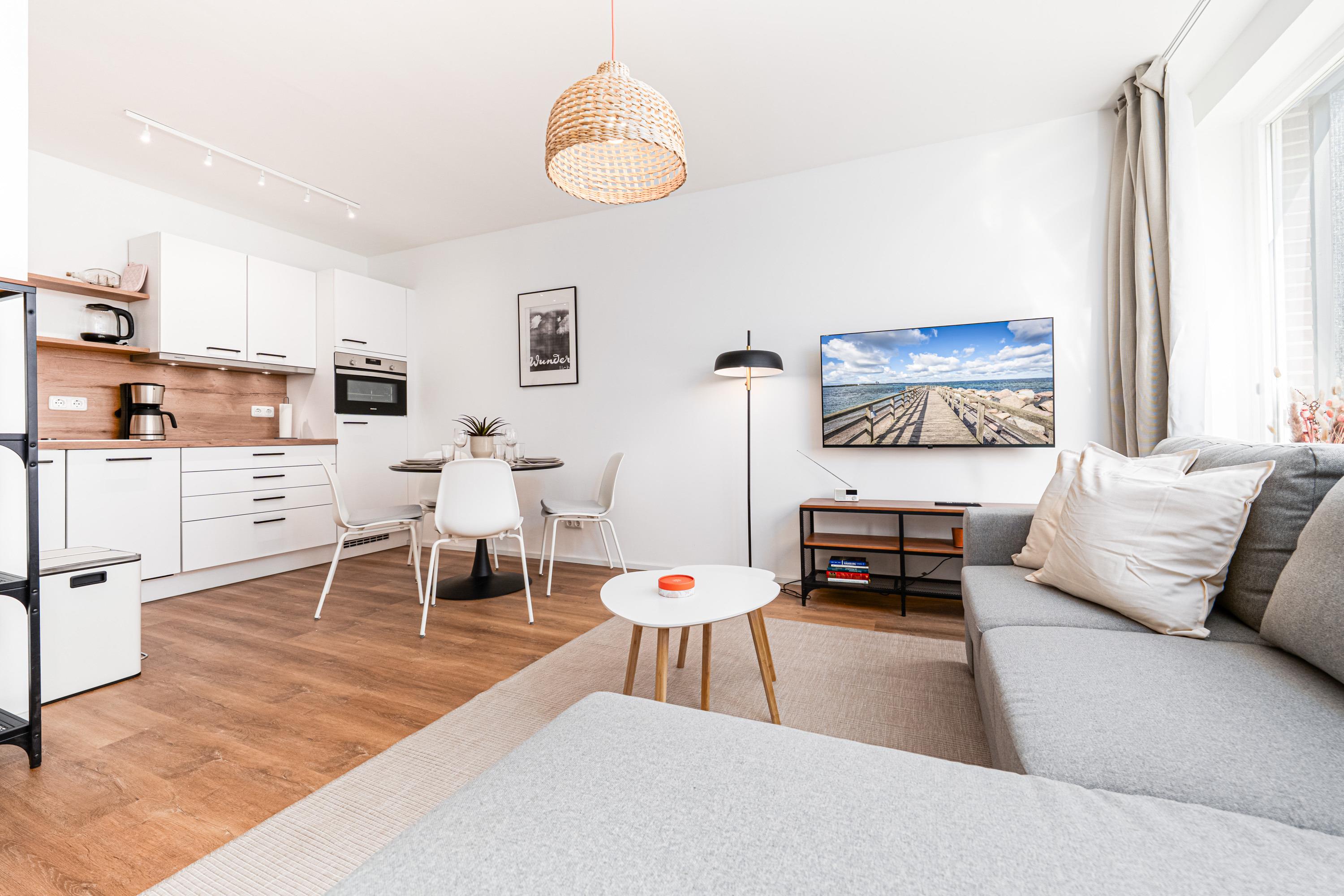 Das im Winter 2025/2026 komplett renovierte Feriendomizil "Wunderlich" präsentiert sich in einem modernen Design und offenem, lichtdurchfluteten Wohnkonzept. Sie betreten das Appartement und stehen im Flur, wo ein großer Einbauschrank viel Platz für mitgebrachte Jacken bieten. Von hier aus gelangen Sie in den hellen Wohnraum, der mit einem bequemen Schlafsofa und Smart-TV sowie einer voll ausgestatteten, integrierten Küche mit Essbereich komfortabel eingerichtet ist. Ob gemeinsame Kochsession's oder ausgiebige Spieleabende - hier ist für alle Urlaubsaktivitäten viel Platz!