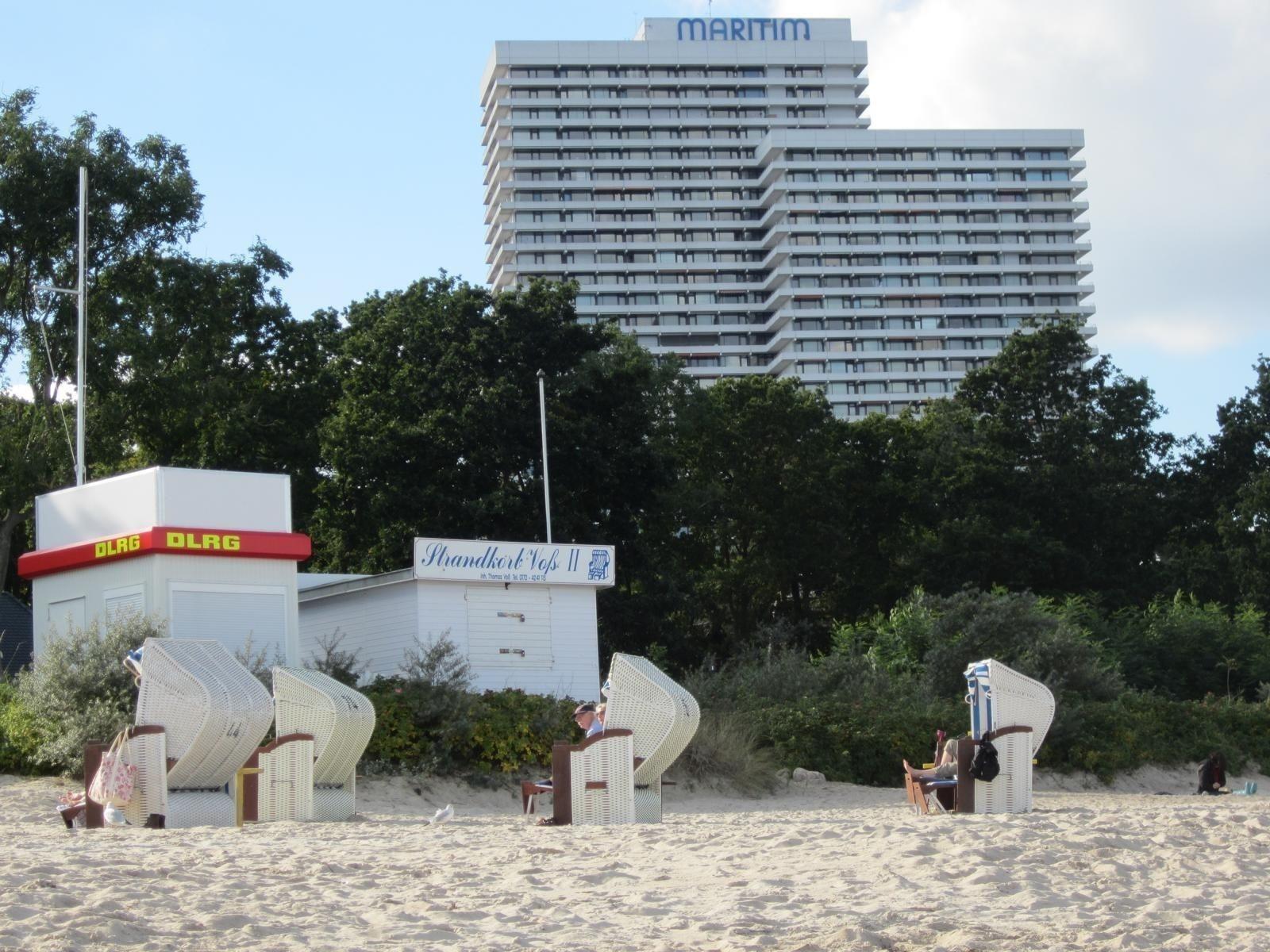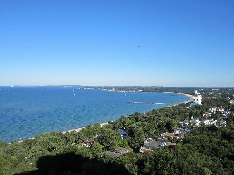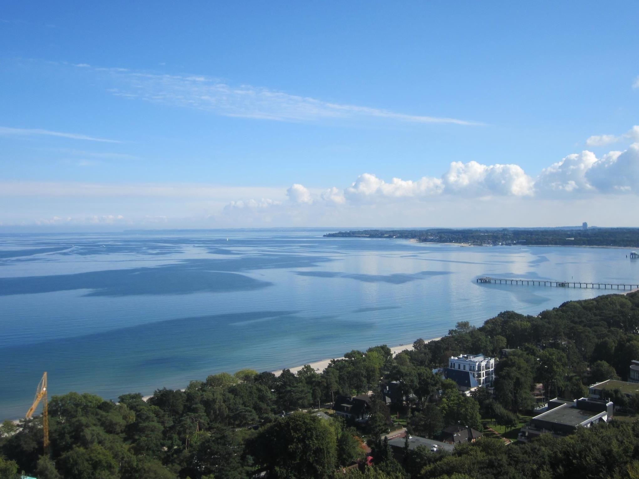 Panorama-Meerblick auf Lübecker Bucht. Plaza Premium Hotel (vorm. Maritim Clubhotel) im Haus.