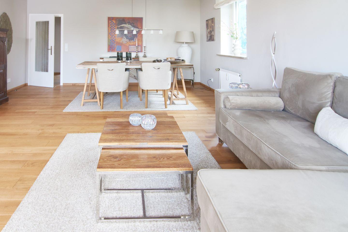 Das Wohnzimmer besticht durch eine gemütliche Sitzgruppe und einen großen Holztisch, der sich ideal für gesellige Runden eignet. Vom Wohnzimmer aus führt der Weg auf die angrenzende Terrasse, die mit einer komfortablen Dining-Lounge ausgestattet ist – der perfekte Ort, um den Tag zu genießen oder einen entspannten Abend zu verbringen. Der weitläufige Gemeinschaftsgarten mit bequemen Liegen und viel Platz zum Entspannen bietet eine idyllische Umgebung für erholsame Stunden im Grünen.