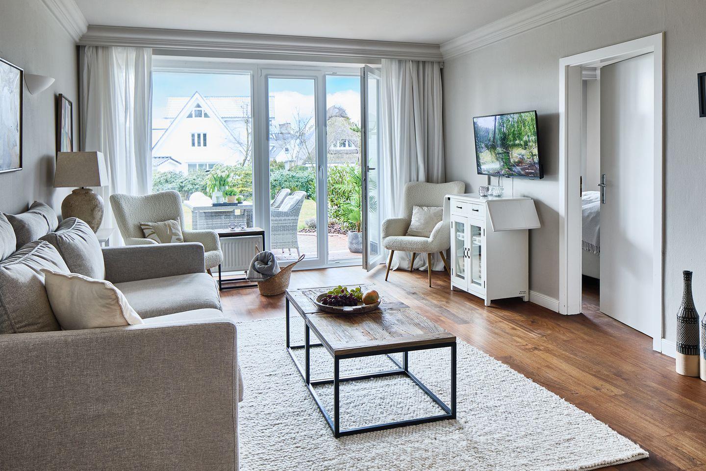Stilvolles Mobiliar und edles Parkett verleihen der Wohnung eine elegante Atmosphäre. Der Wohnbereich ist mit einem komfortablen Sofa, einem Sessel und einem Flachbild-TV ausgestattet – ideal für entspannte Stunden. Die offene Küche und der schöne Essbereich laden zum gemeinsamen Kochen und Genießen ein. Vom Wohnzimmer sowie von der privaten Terrasse genießen Sie einen wunderbaren Blick in den idyllischen Garten. Der weitläufige Gemeinschaftsgarten mit bequemen Liegen bietet viel Platz zum Entspannen – hier können Sie die Seele baumeln lassen.