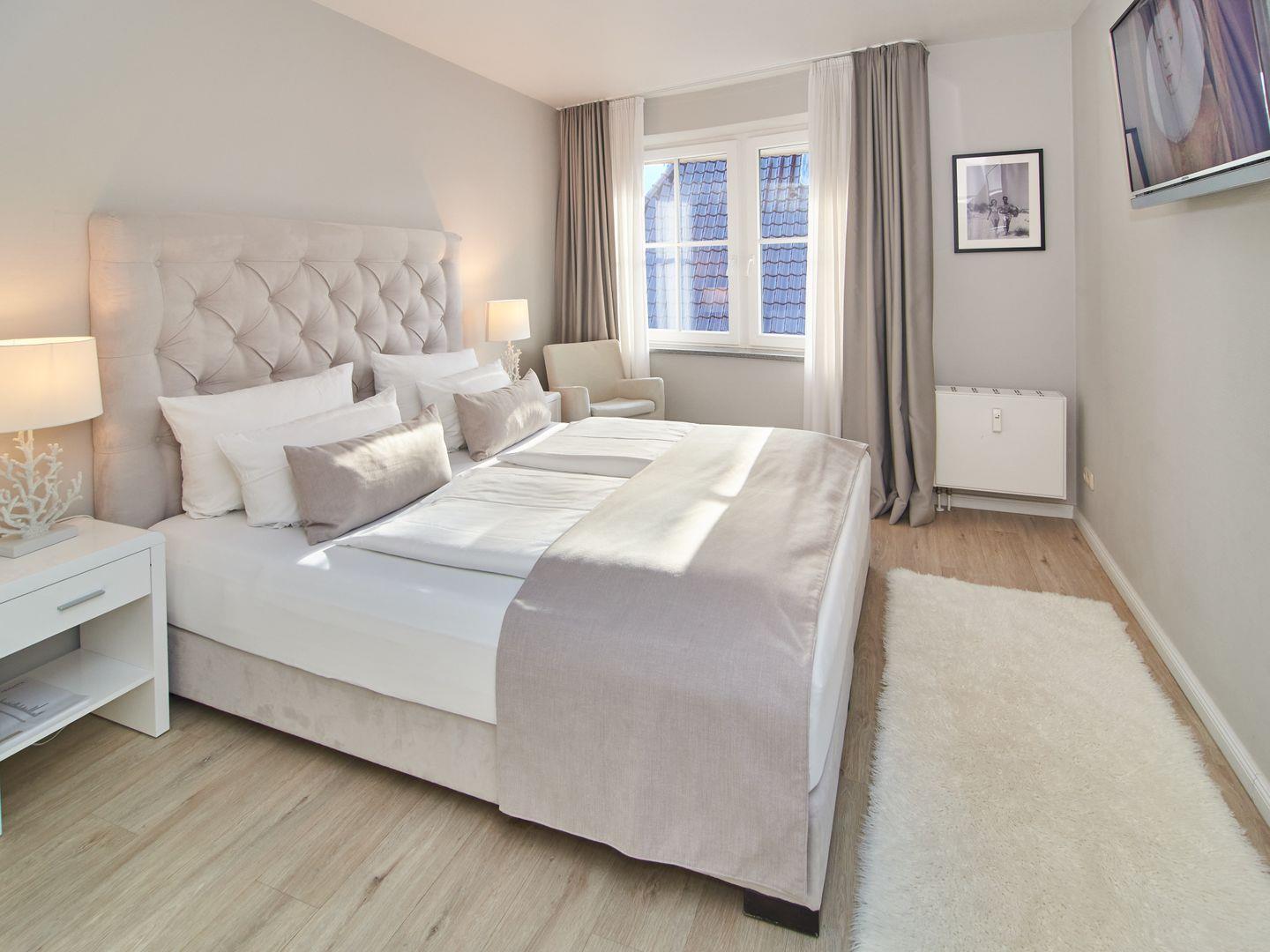 Beide Schlafzimmer bieten ein angenehmes Ambiente und ausreichend Platz. Boxspringbetten (teils mit Überlänge), TV, praktische Schiebetürschränke und verdunkelbare Gardinen sorgen für Komfort und erholsame Nächte.