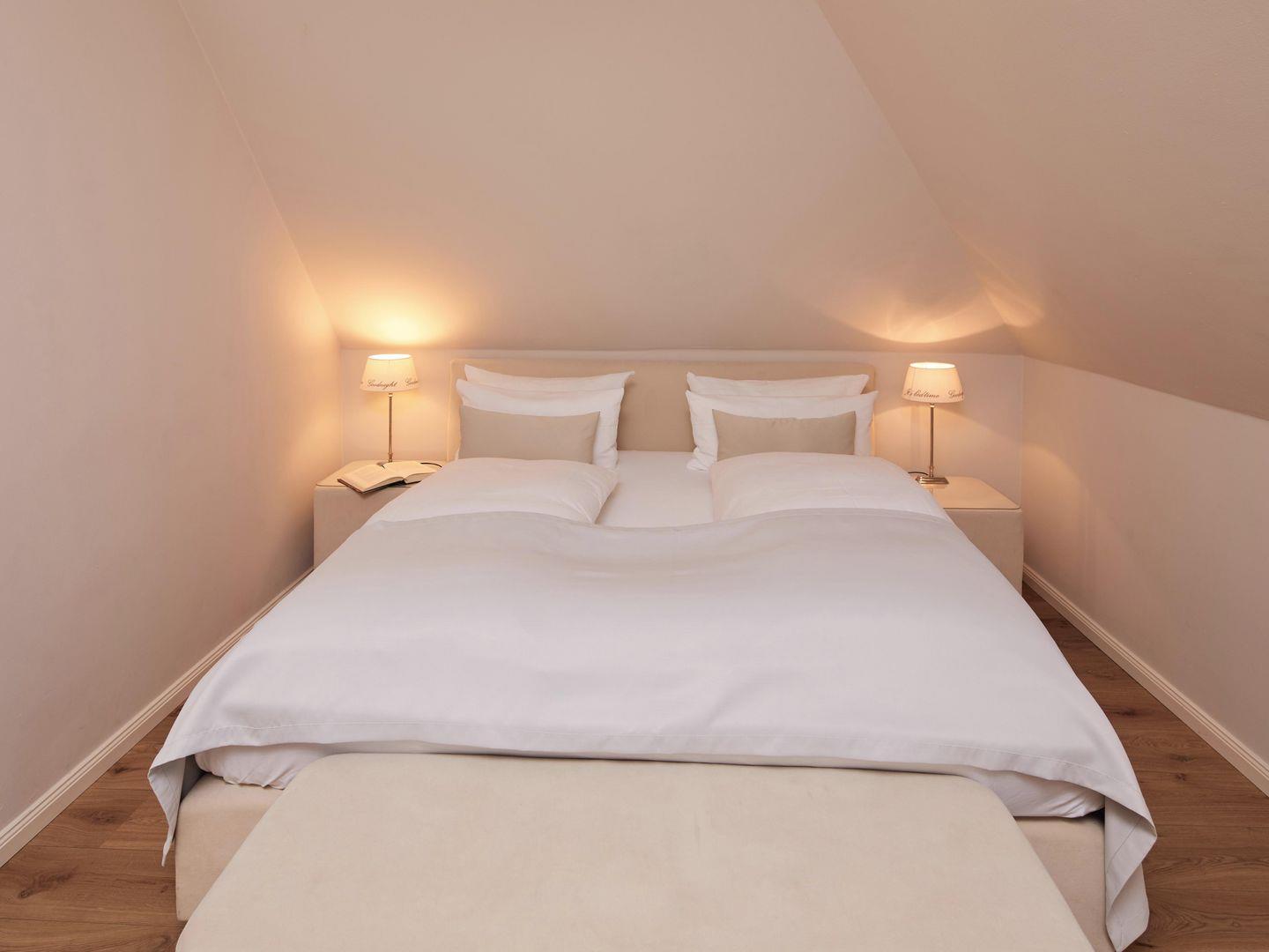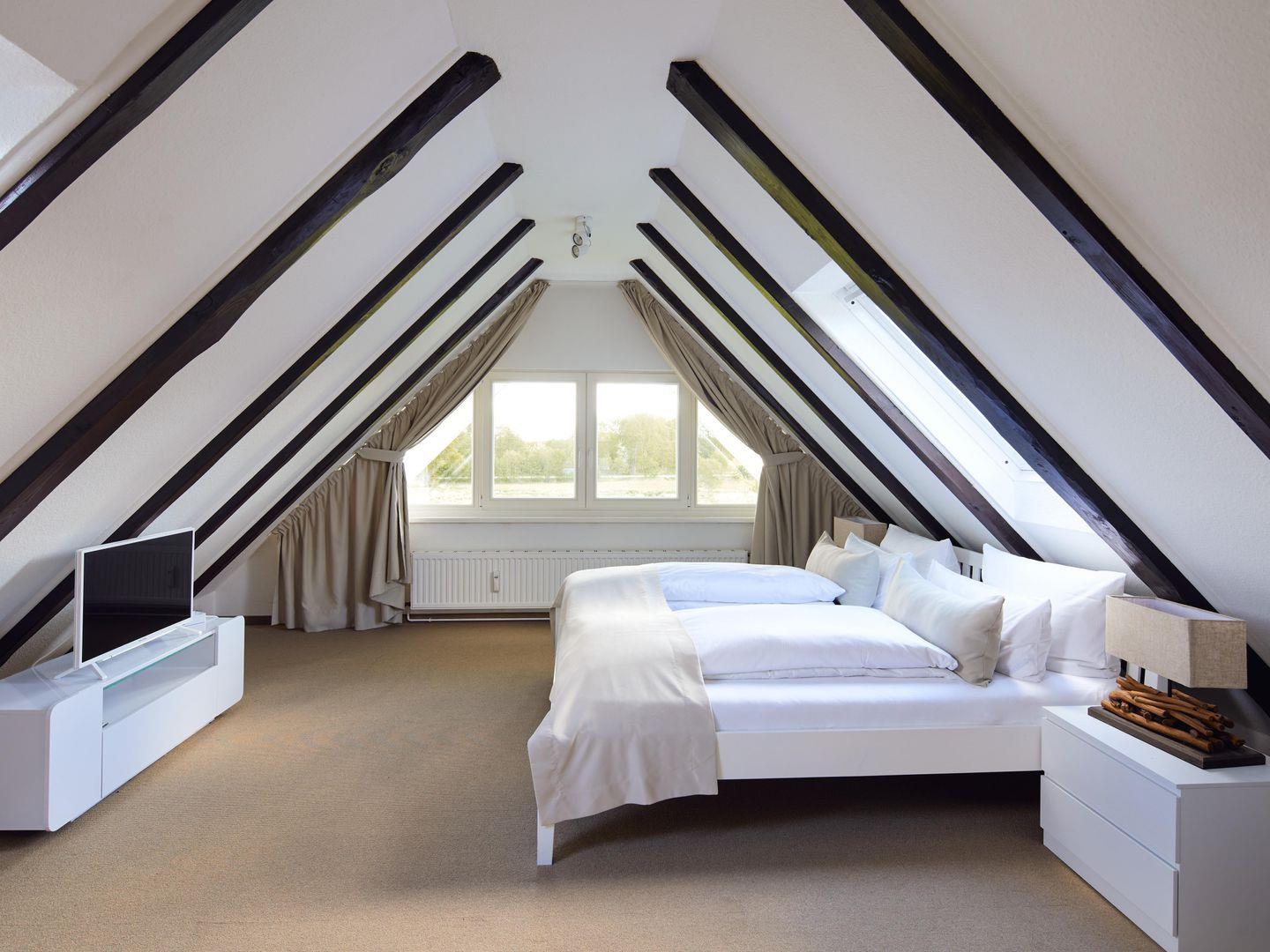 Auf der oberen Etage des Maisonette-Apartments ist ein zweites, großes Schlafzimmer mit einem Doppelbett vorhanden. In dem ausgebautem Spitzboden genießen Sie besonderen Weitblick und angenehmen Komfort mit Smart-TV. Dieses Schlafzimmer ist ideal für junggebliebene Erwachsene und Jugendliche, da der Zugang über eine steile Sambatreppe erfolgt.