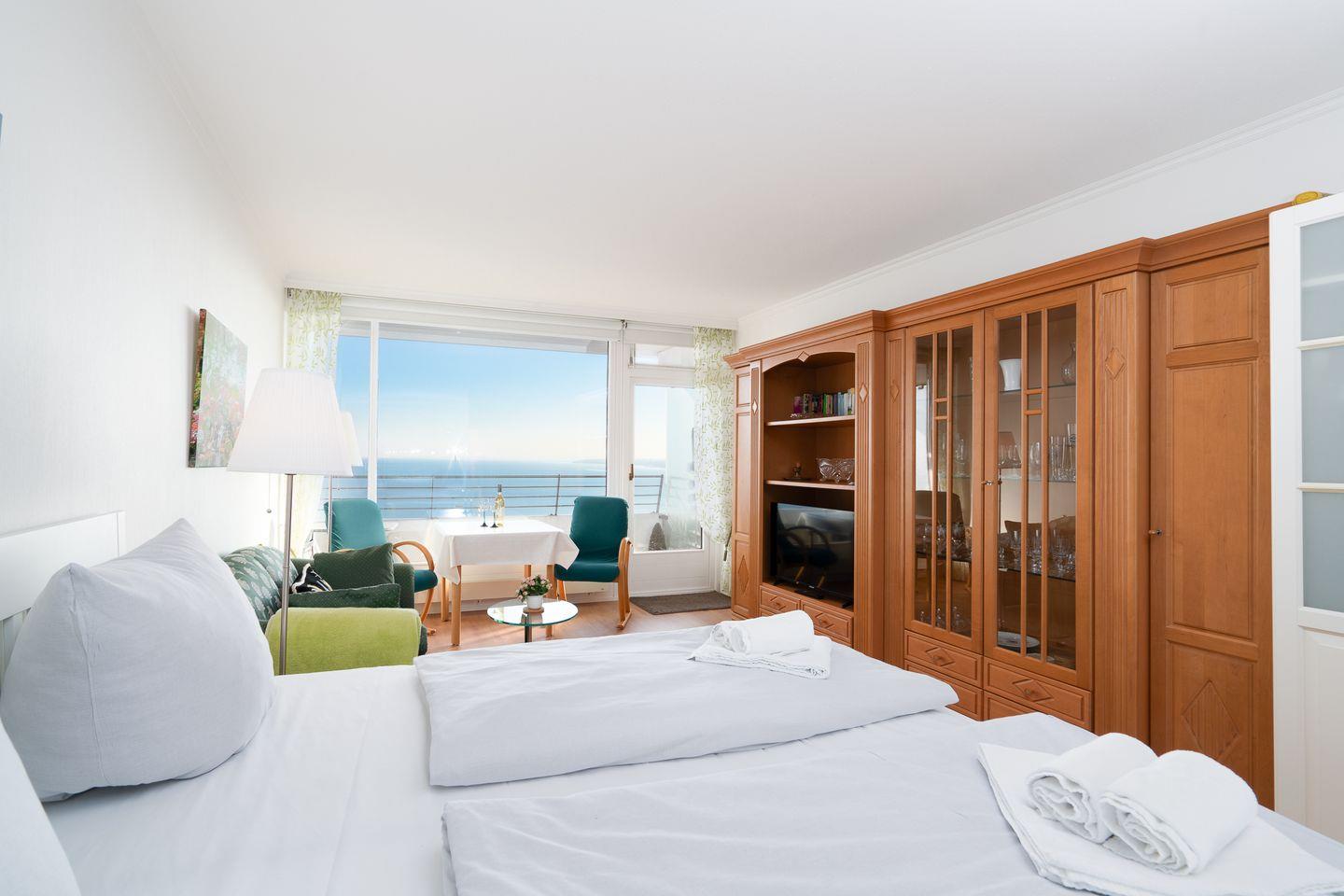 "Überall ist Meer!" Erlebt euren Traumurlaub an der Ostsee in der charmanten Ferienwohnung "Meerblick". Gelegen in der 8. Etage des Residenz- und Hotelkomplexes Plaza Premium, bietet diese Wohnung dank großer Spiegelflächen am Bett und einem weitläufigen Fenster einen spektakulären Blick auf die Ostsee von jedem Winkel des Zimmers. Der Balkon in Ostlage eröffnet weitreichende Ausblicke über die Küste und den Ort. In der Wohnung gibt es kostenfreies WLAN (bei Störungen kein Anspruch auf Erstattung oder Ersatz). Genießt außerdem die zahlreichen (kostenpflichtigen) Annehmlichkeiten der Hotelanlage, wie Tennisplätze und Bowlingbahnen, und lasst den Tag in einem der zwei Restaurants oder an der Bar ausklingen. Das Hotel bietet Euch außerdem ein Schwimmbad inkl. Sauna und Hallenbad (Tageskarte 29€).