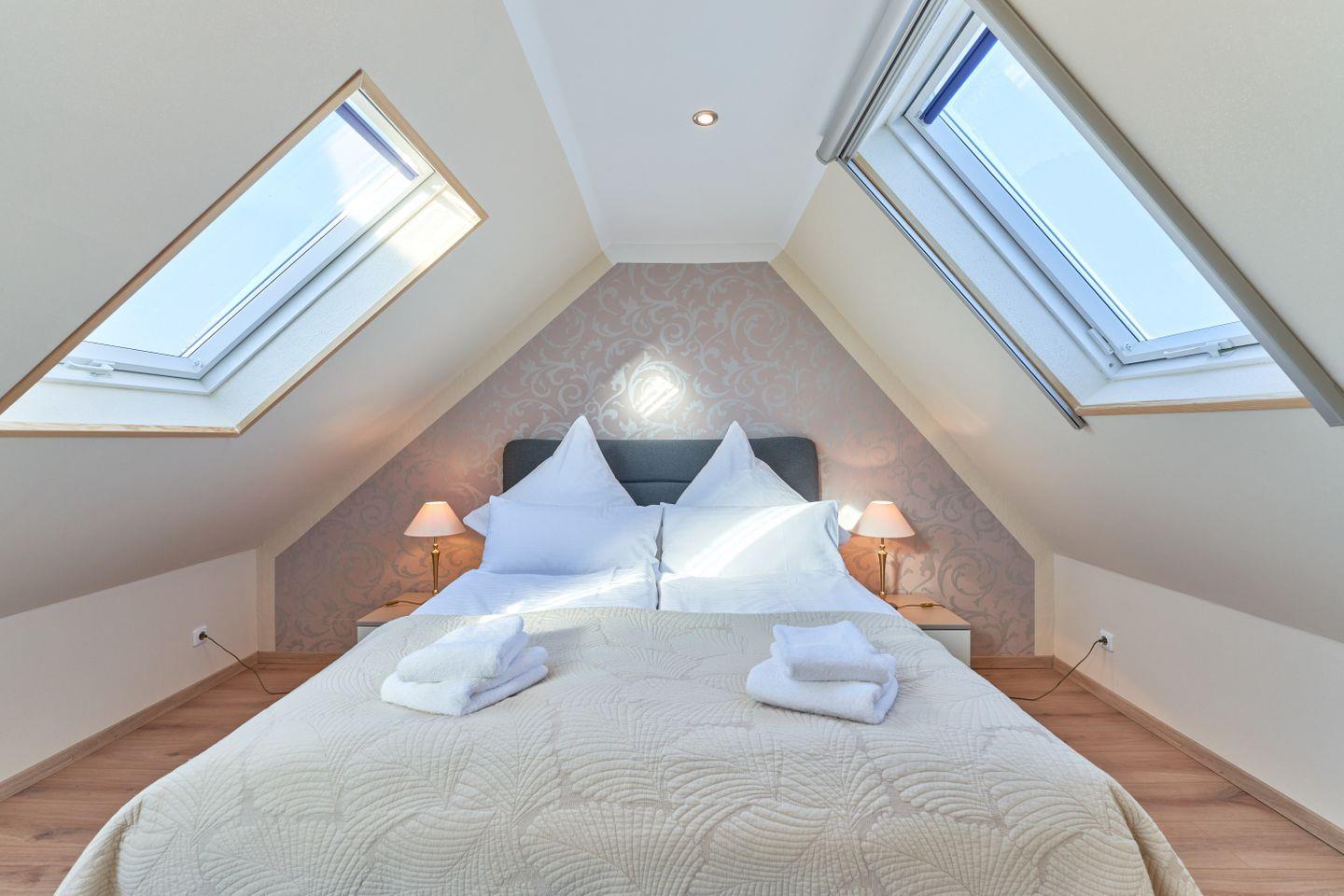 Moderne Ferienwohnung in Timmendorfer Strand mit Balkon, Luxus-Küche und komfortablem Schlafzimmer im Dachgeschoss.