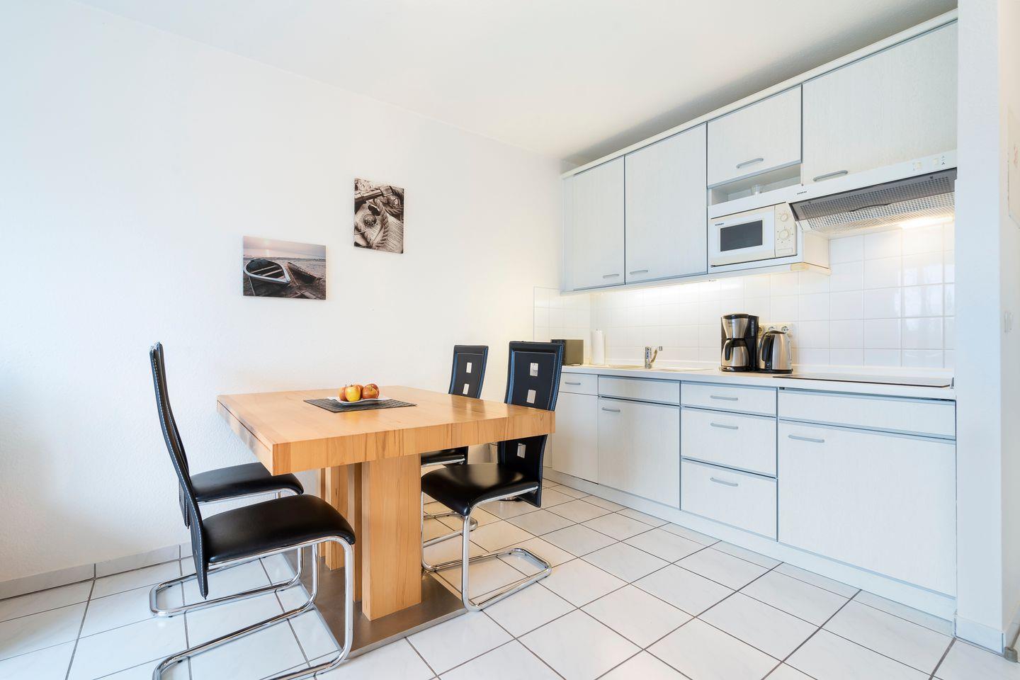 Freut euch auf eine helle und einfache 1-Zimmer-Nichtraucher-Ferienwohnung in der 2. Etage, die mit kostenfreiem WLAN (bei Störungen kein Anspruch auf Erstattung oder Ersatz) und cleverem Raumkonzept überzeugt. Von der großen Fensterfront gelangt ihr auf den gemütlichen Nord-Ost-Balkon. Diese Wohnung bietet Komfort für bis zu 4 Personen und heißt auch eure Hunde willkommen, wir bitten lediglich darum, eine Decke für das Sofa und ein Körbchen für euren Vierbeiner mitzubringen. Ein sicherer Duplex-Parkplatz (für Fahrzeuge bis 1,50m) in der Tiefgarage und die Fahrradabstellmöglichkeiten runden das Angebot ab. Zusätzlich stehen eine Waschküche mit Münzautomaten und eine Tischtennisplatte im Gemeinschaftskeller zur Verfügung.