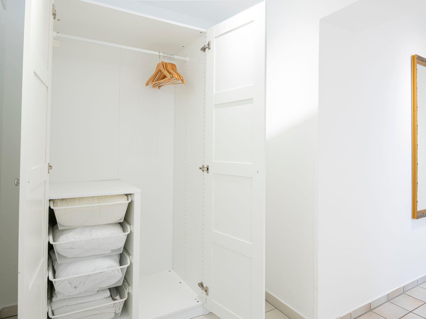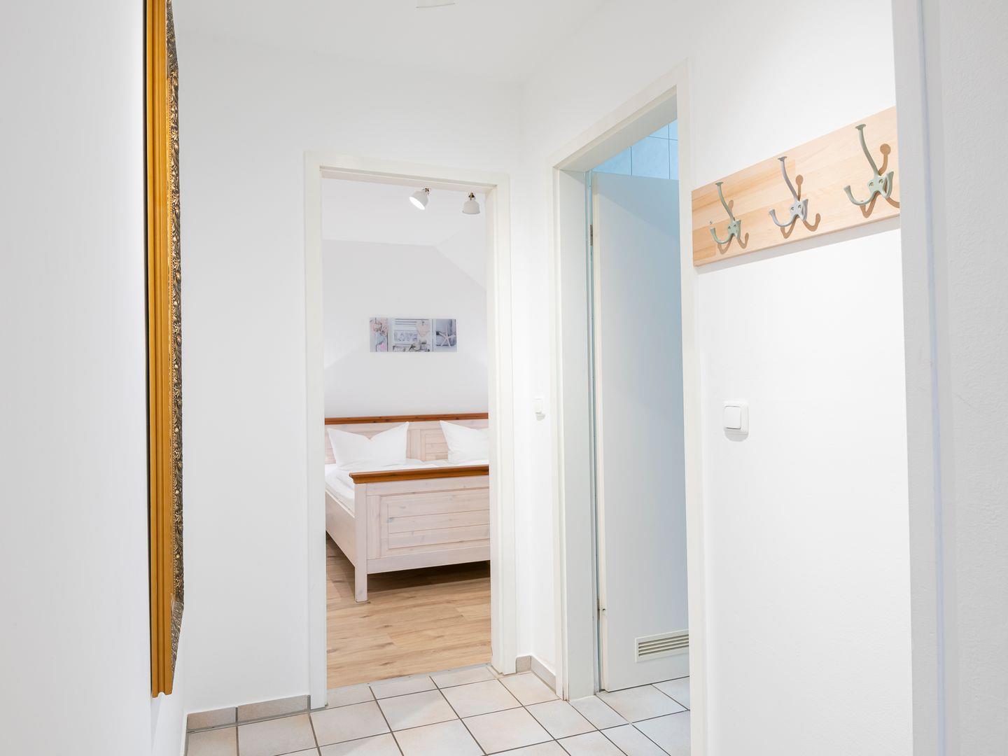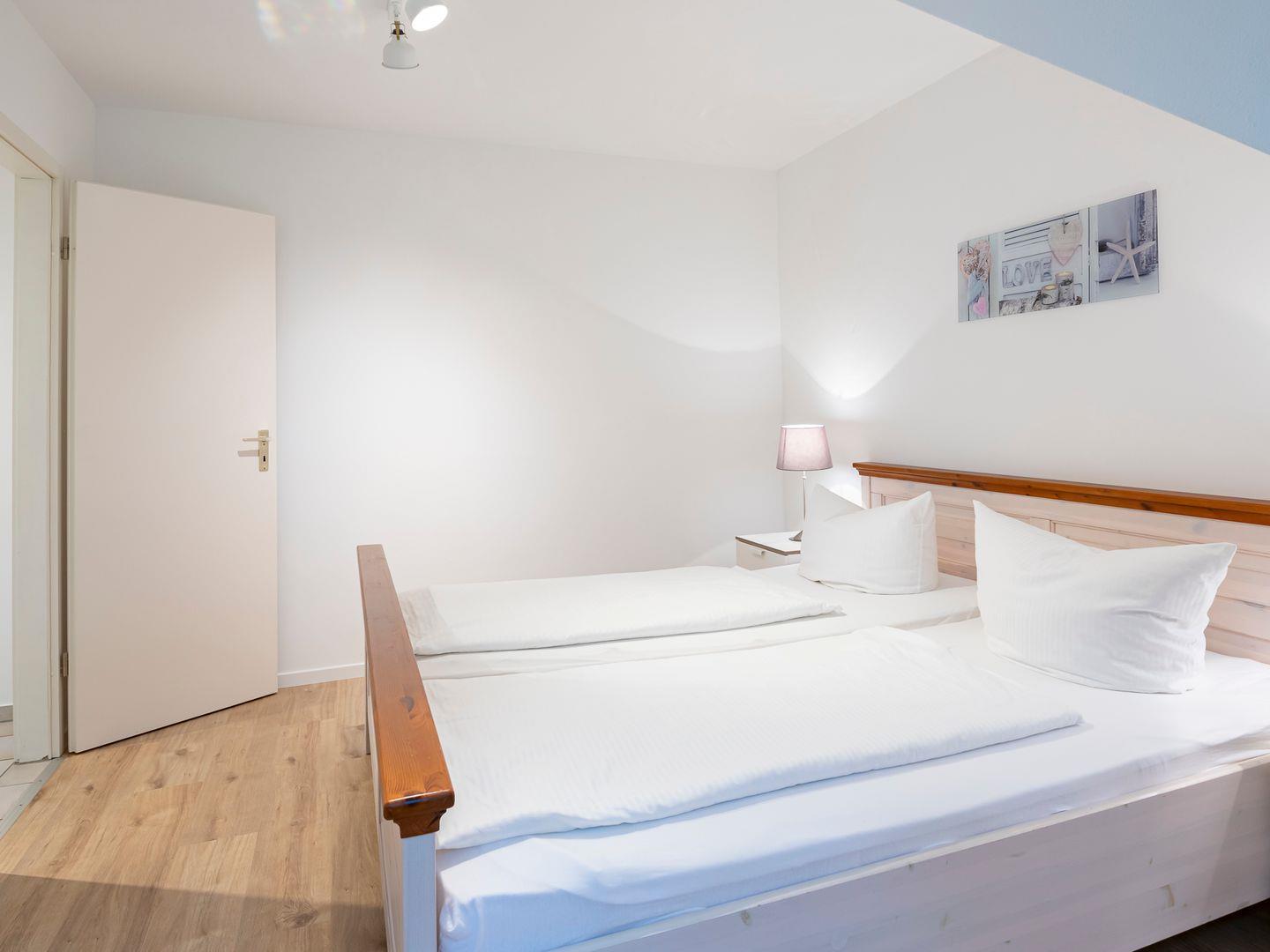 Das separate Schlafzimmer ist mit einem bequemen Doppelbett (2x 90x200 cm) und einer Kommode ausgestattet. Bei Bedarf können Sie hier auch ein Babybett hinzustellen. Sowohl im Schlafzimmer als auch im Wohnzimmer sorgen Vorhänge für eine angenehme Verdunkelung. Im Flur der Wohnung finden Sie einen geräumigen Kleiderschrank und eine Wandgarderobe, die ausreichend Platz für Ihre Urlaubsgarderobe bieten. Das tageslichtdurchflutete Badezimmer ist mit einer Dusche, einem Waschbecken mit Spiegelschrank und einer Toilette ausgestattet.