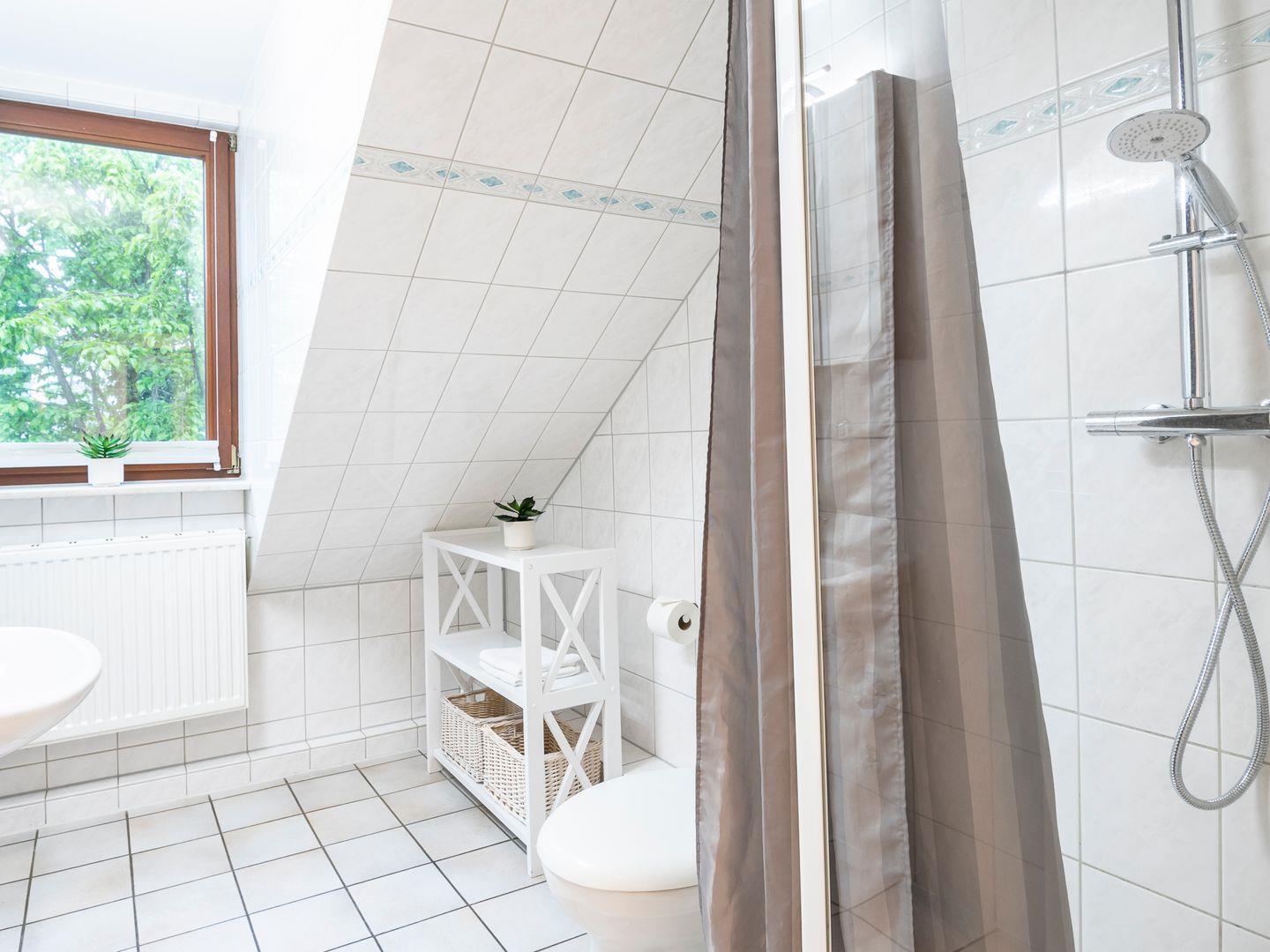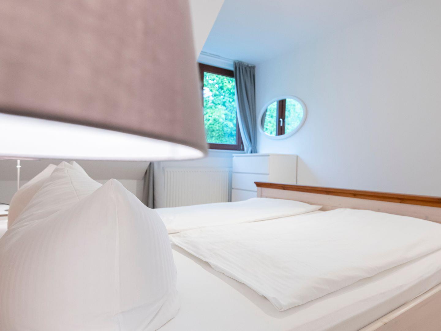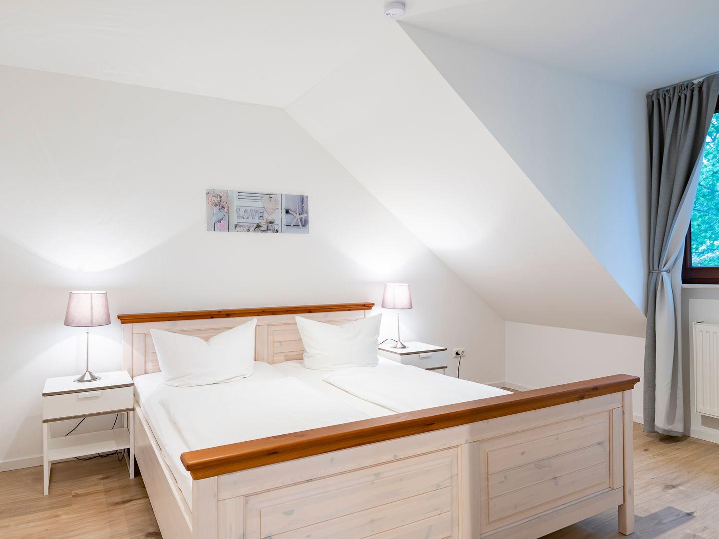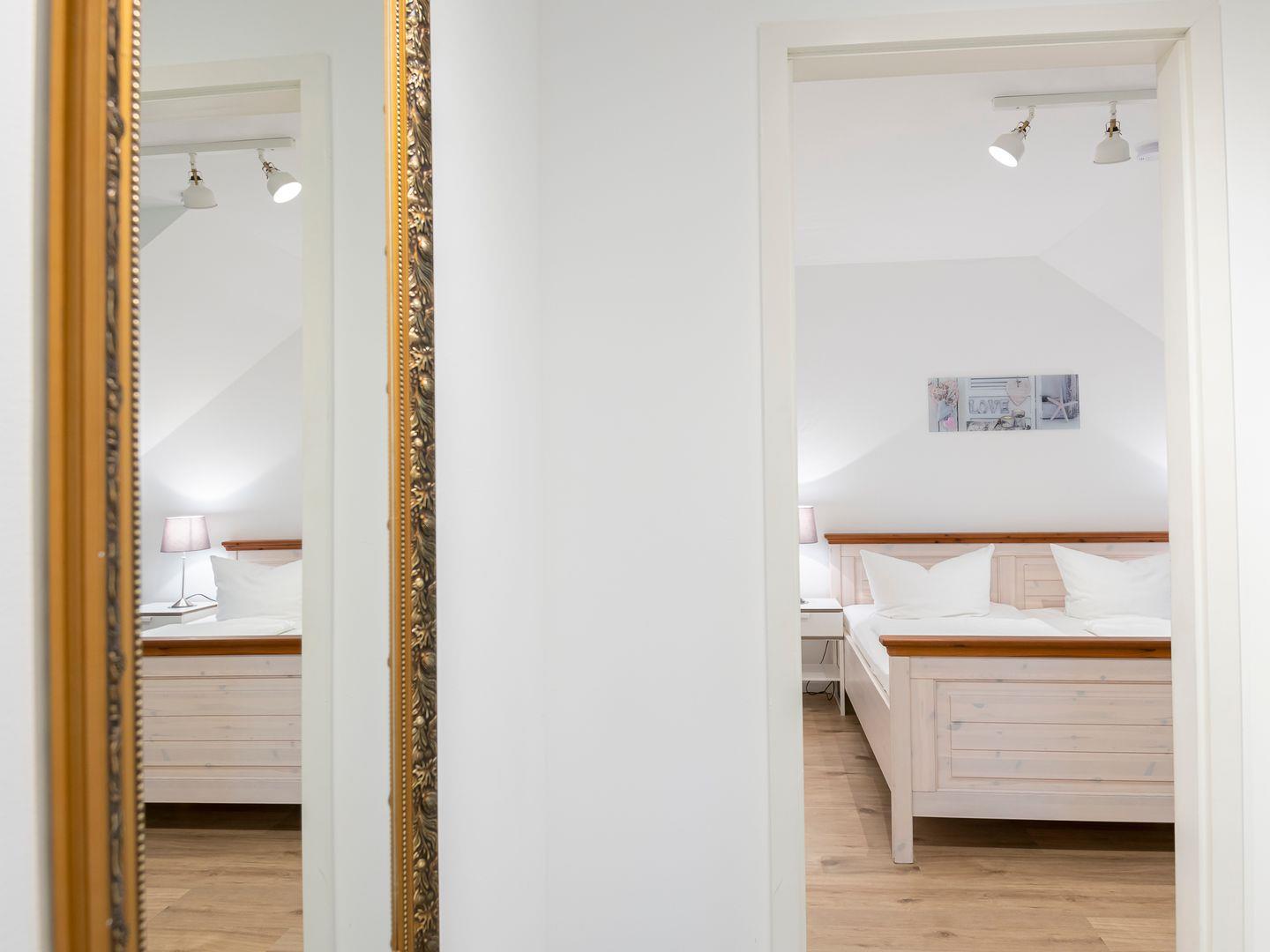 Das separate Schlafzimmer ist mit einem bequemen Doppelbett (2x 90x200 cm) und einer Kommode ausgestattet. Bei Bedarf können Sie hier auch ein Babybett hinzustellen. Sowohl im Schlafzimmer als auch im Wohnzimmer sorgen Vorhänge für eine angenehme Verdunkelung. Im Flur der Wohnung finden Sie einen geräumigen Kleiderschrank und eine Wandgarderobe, die ausreichend Platz für Ihre Urlaubsgarderobe bieten. Das tageslichtdurchflutete Badezimmer ist mit einer Dusche, einem Waschbecken mit Spiegelschrank und einer Toilette ausgestattet.