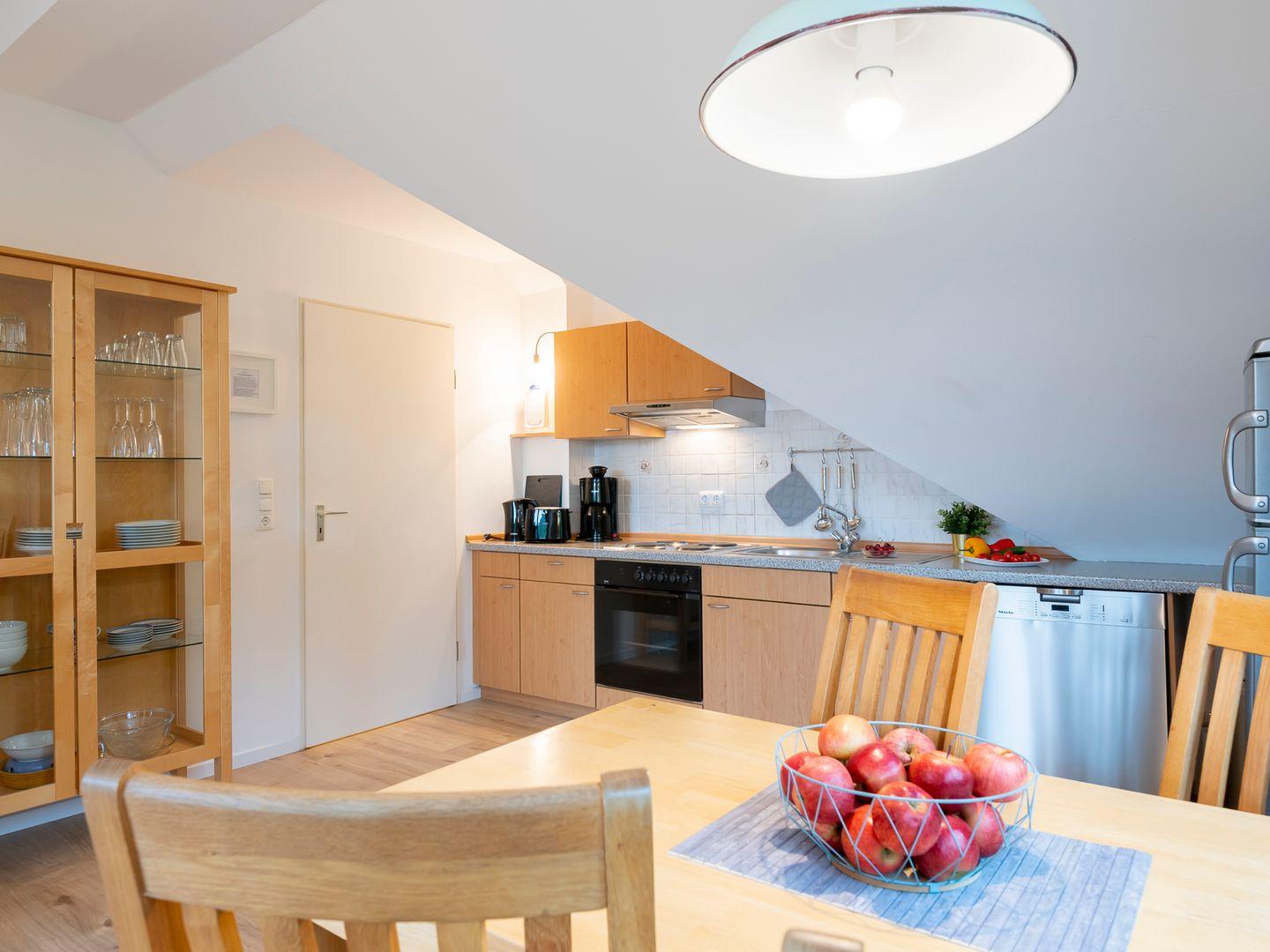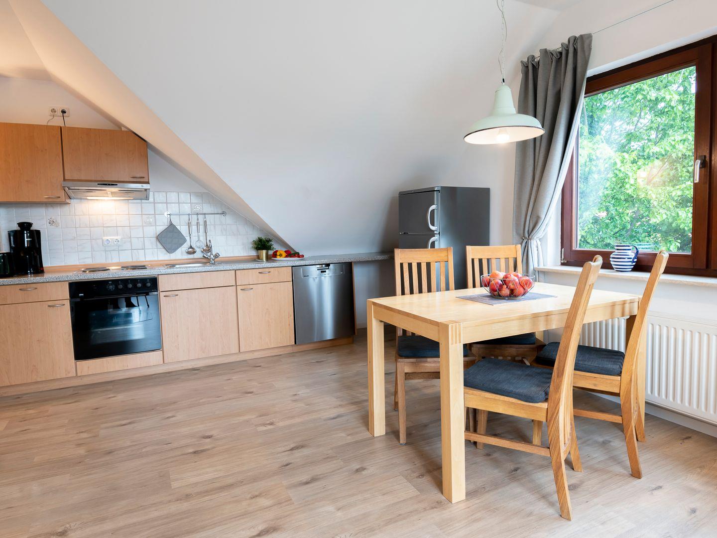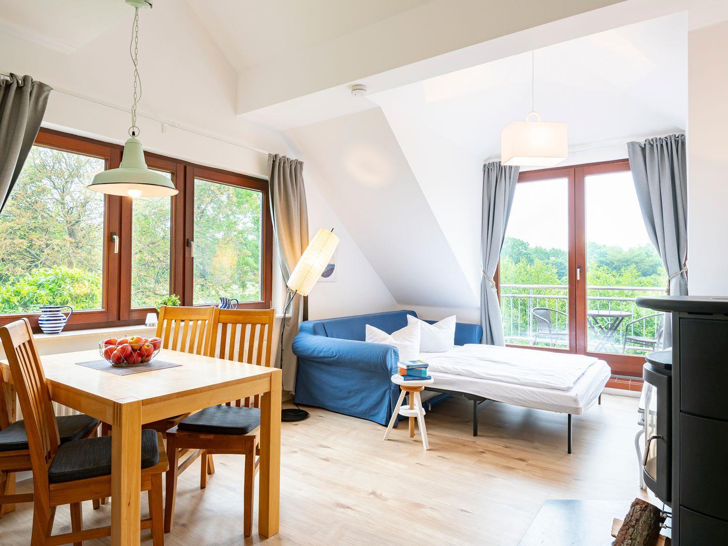 Das Herzstück der Ferienwohnung ist der lichtdurchflutete Wohn-/Essraum mit einer integrierten Küche, einem großzügigen Esstisch und direktem Zugang zum Balkon. Genießen Sie den herrlichen Ausblick auf die umliegende Natur von Ihrem geräumigen, möblierten Balkon - der perfekte Ort, um den ersten Kaffee am Morgen zu genießen oder entspannt einen stilvollen Sundowner am Abend zu schlürfen. Hier können Sie die pure Lebensfreude spüren! Die offene Küche ist gut ausgestattet mit modernen Annehmlichkeiten wie einem Backofen, einer Geschirrspülmaschine, einem Kühlschrank mit Gefrierfach und einer Kaffeemaschine. An kühleren Tagen sorgt ein knisterndes Feuer im eigenen Kamin für eine behagliche und gemütliche Atmosphäre im Wohnbereich. Eine komfortable Schlafcouch (Liegefläche 160 cm x 200 cm) bietet hier einen Schlafplatz für zwei Personen. Ein Flachbildfernseher, ein DVD-Player und kostenfreies WLAN sorgen für Unterhaltung.