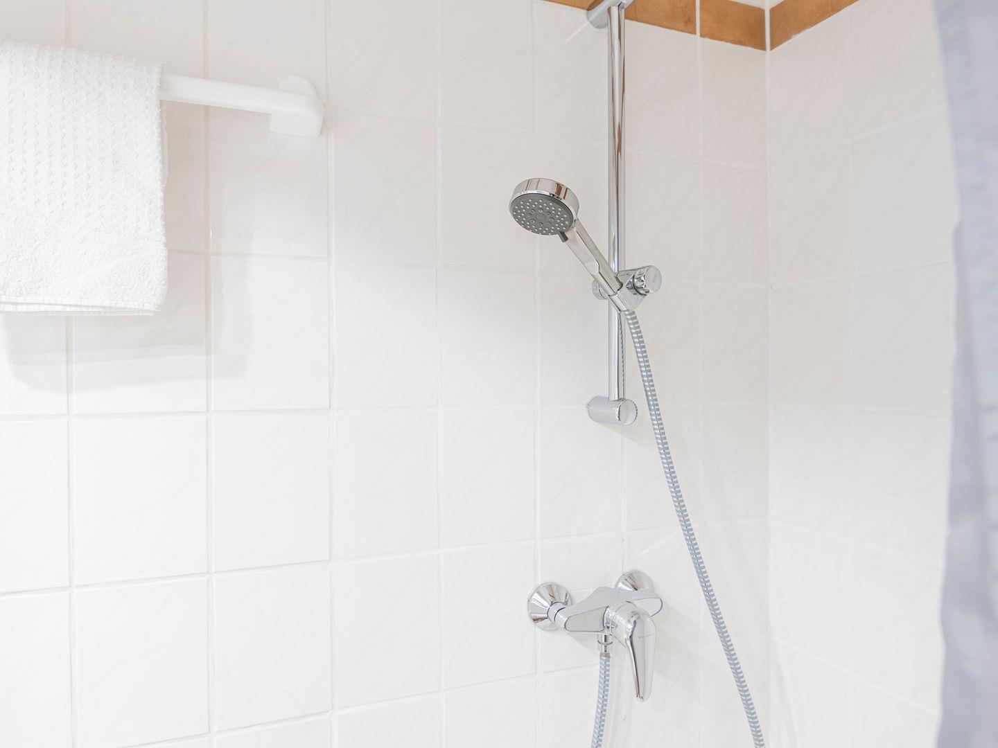 Das geschmackvoll möblierte Schlafzimmer bietet ein hochwertiges Doppelbett (2x 90x200 cm) und einen geräumigen Kleiderschrank. Bei Bedarf ist hier auch Platz für ein Kinderreisebett. Das angrenzende Badezimmer ist hell gefliest und verfügt über eine erfrischende Dusche, ein WC, einen Fön sowie ein Waschbecken mit einem beleuchteten Spiegel.