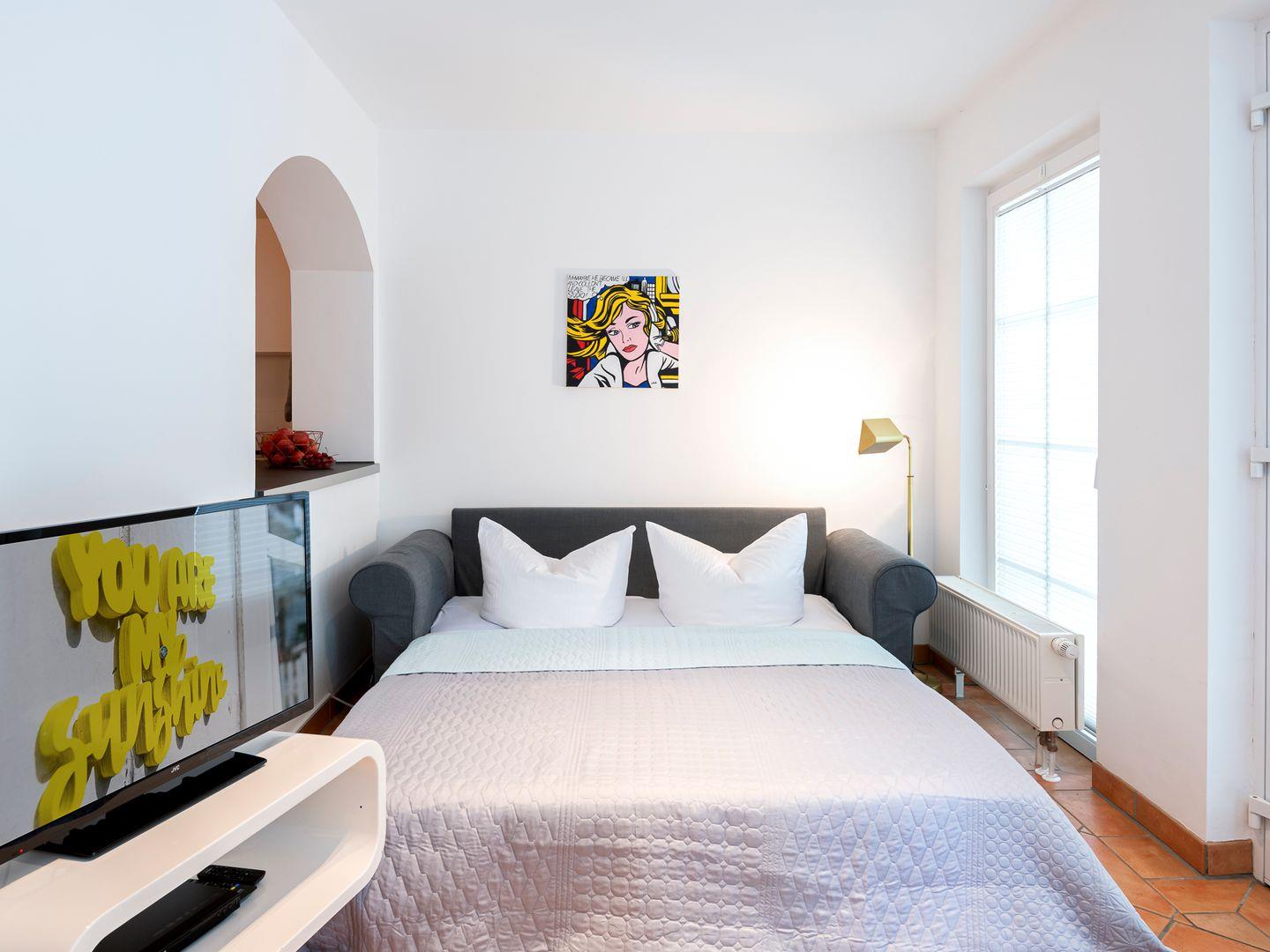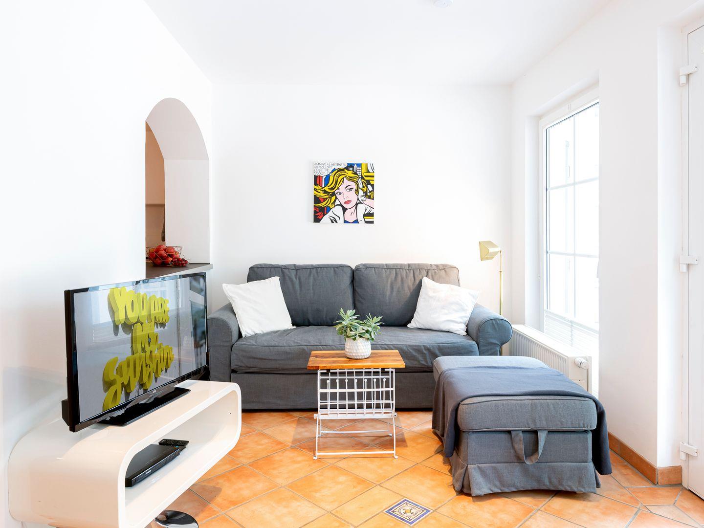 Der Wohnbereich ist mit einer komfortablen Schlafcouch (Liegefläche 160x200 cm), einem bequemen Sessel, einem Flachbildfernseher und einem DVD-Player ausgestattet. Ein kostenfreier WLAN-Anschluss ist ebenfalls inklusive.