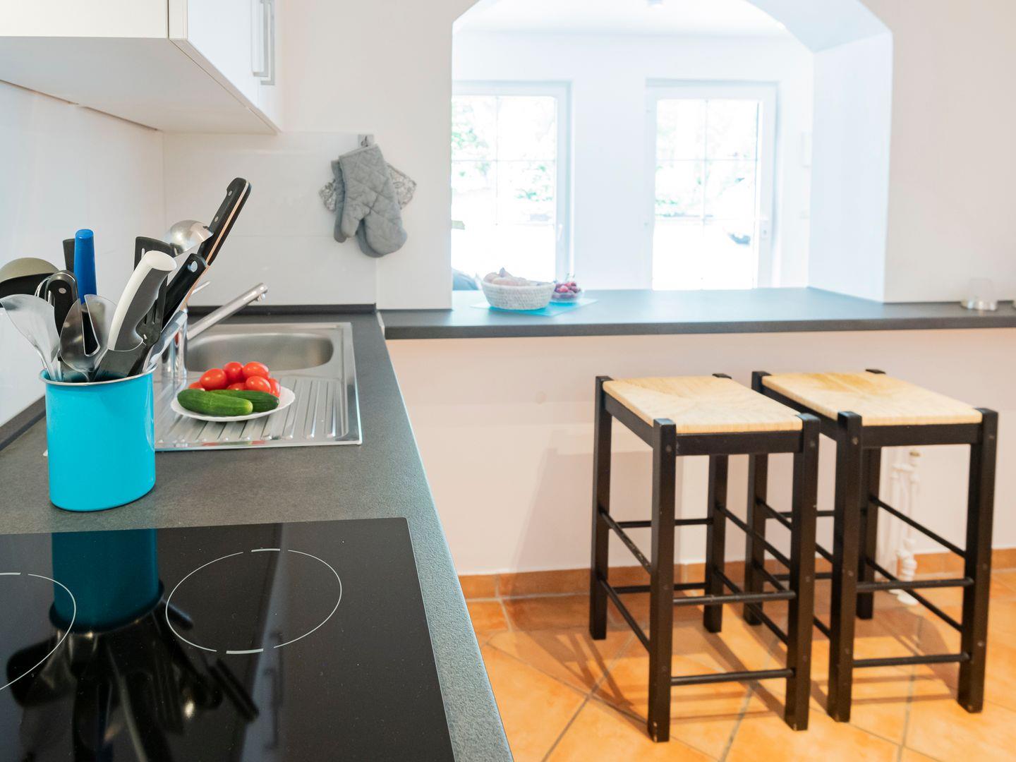 Die großzügige, eigenständige Küche ist ein Highlight und verwöhnt Sie mit einer behaglichen Essgelegenheit. Hier finden Sie Annehmlichkeiten wie einen 4-Platten-Ceranherd, eine Spülmaschine, einen Backofen und einen Kühlschrank mit Gefrierfach. Zwischen der Küche und dem Wohnzimmer befindet sich eine offene Durchreiche, die es ermöglicht, in geselliger Runde bequem zu kochen.