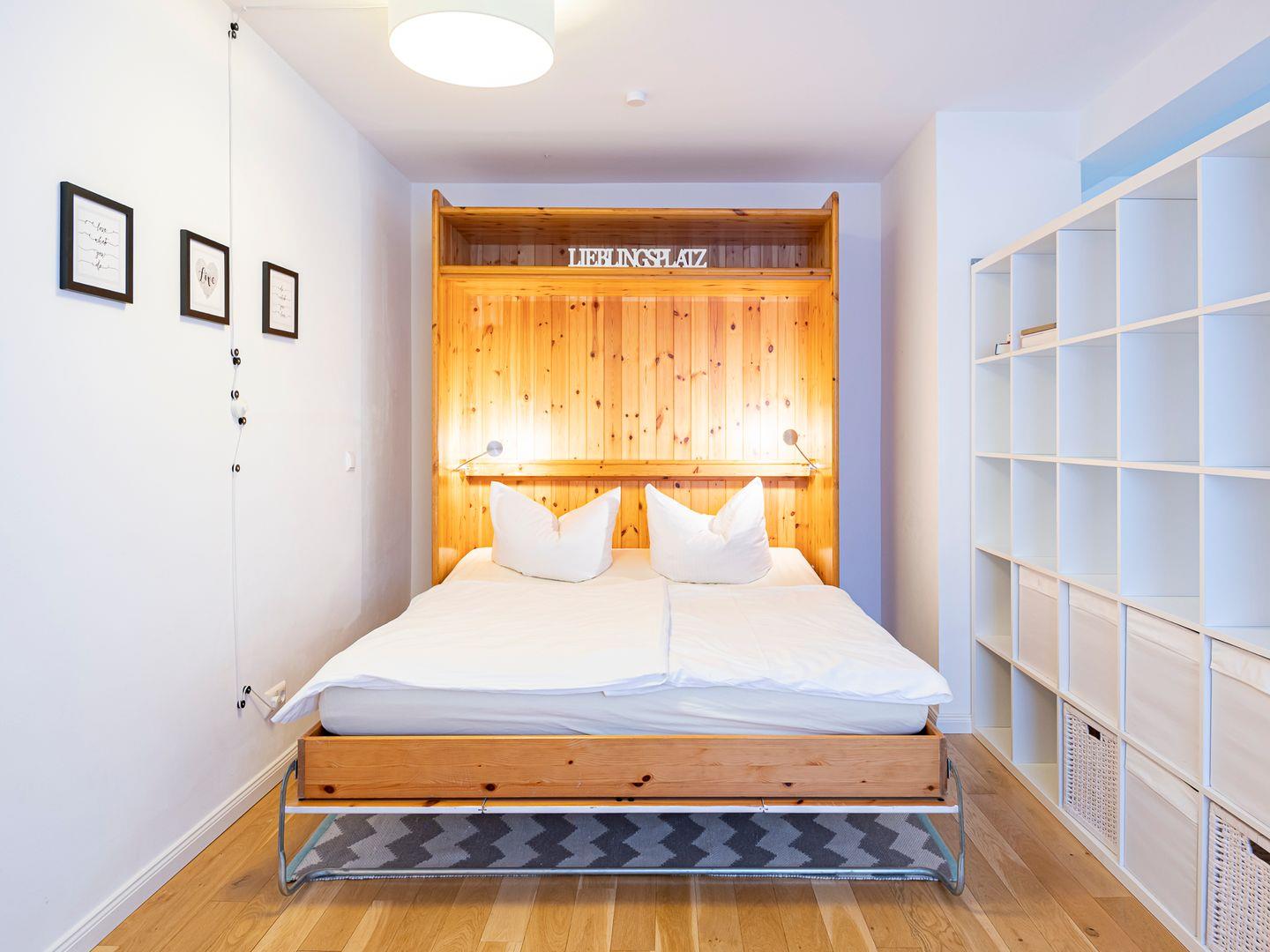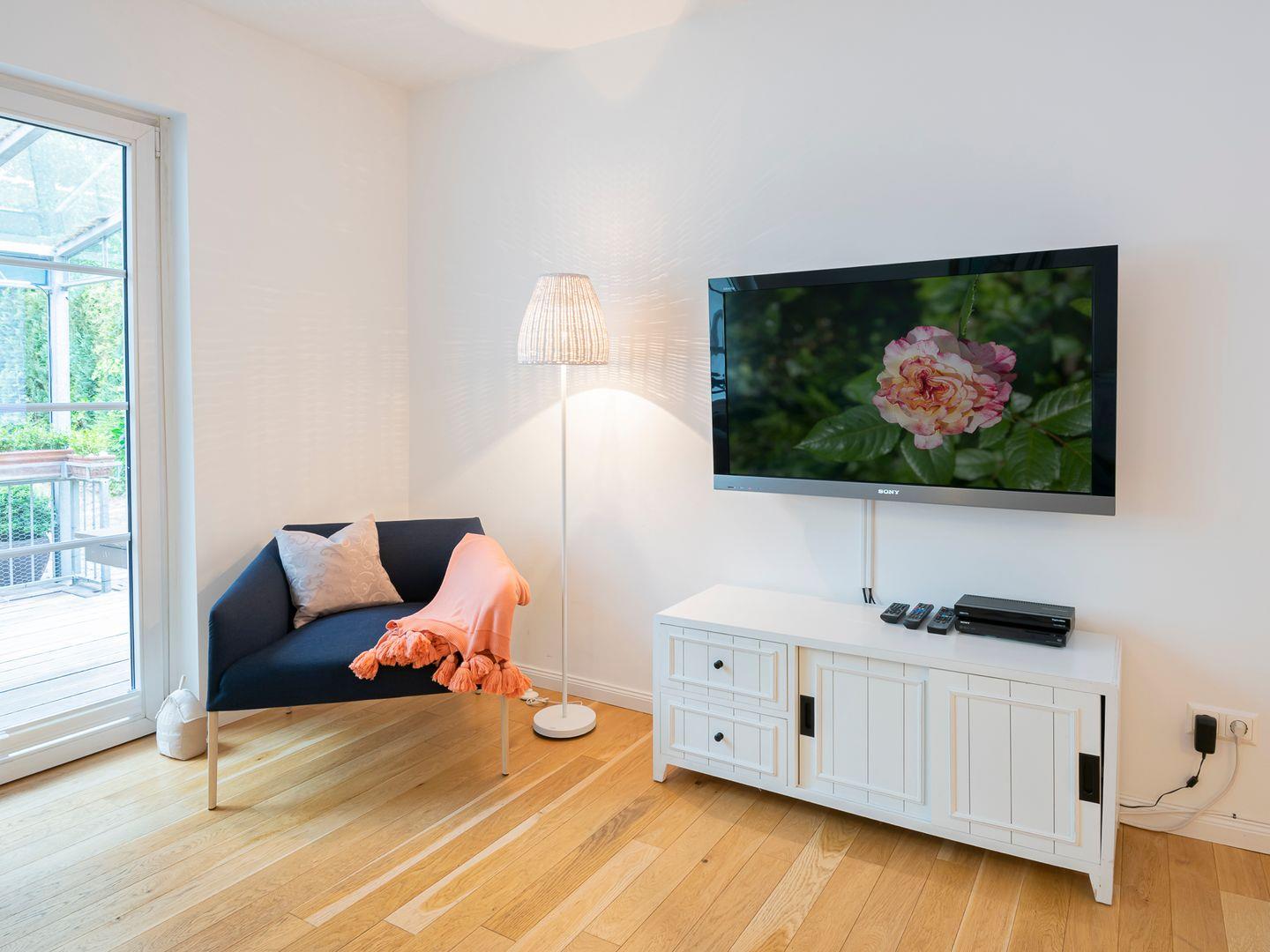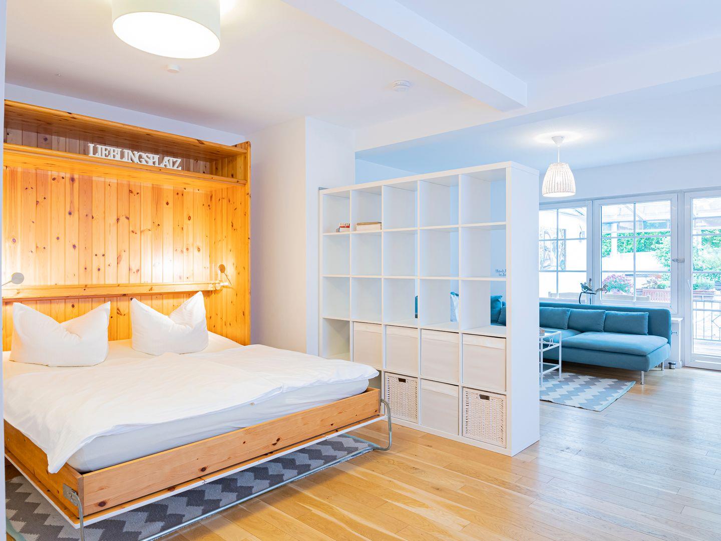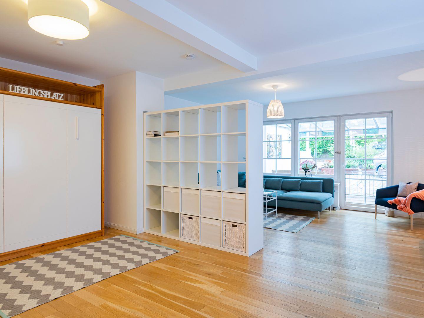 Ein Hauch von skandinavischem Chic trifft auf modernen Landhausstil, vereint mit klarem Design, viel Licht und lässigem Stilbewusstsein - hier erleben Sie pure Wohlfühlatmosphäre! Entspannen Sie auf der großzügigen und hochwertigen Sofalandschaft, während Flatscreen-TV, DVD-Player und kostenfreies WLAN für elektronische Unterhaltung sorgen. Ein Regal fungiert als visuelle Raumtrennung und bietet gleichzeitig Stauraum. Vom gemütlichen Essplatz aus genießen Sie einen wunderbaren Blick ins Grüne. Für einen zusätzlichen Schlafplatz für zwei Personen sorgt ein komfortables Schrankbett (eine Matratze, Liegefläche ca. 150 x 200 cm) im Wohnbereich. Plissees sorgen für eine angenehme Verdunkelung.