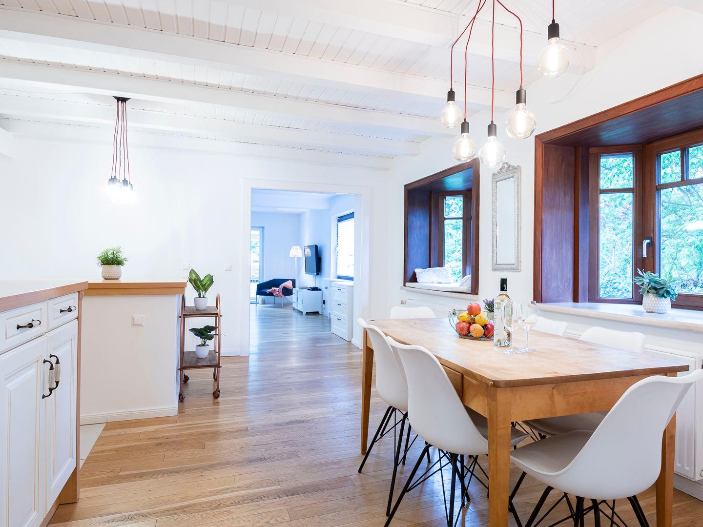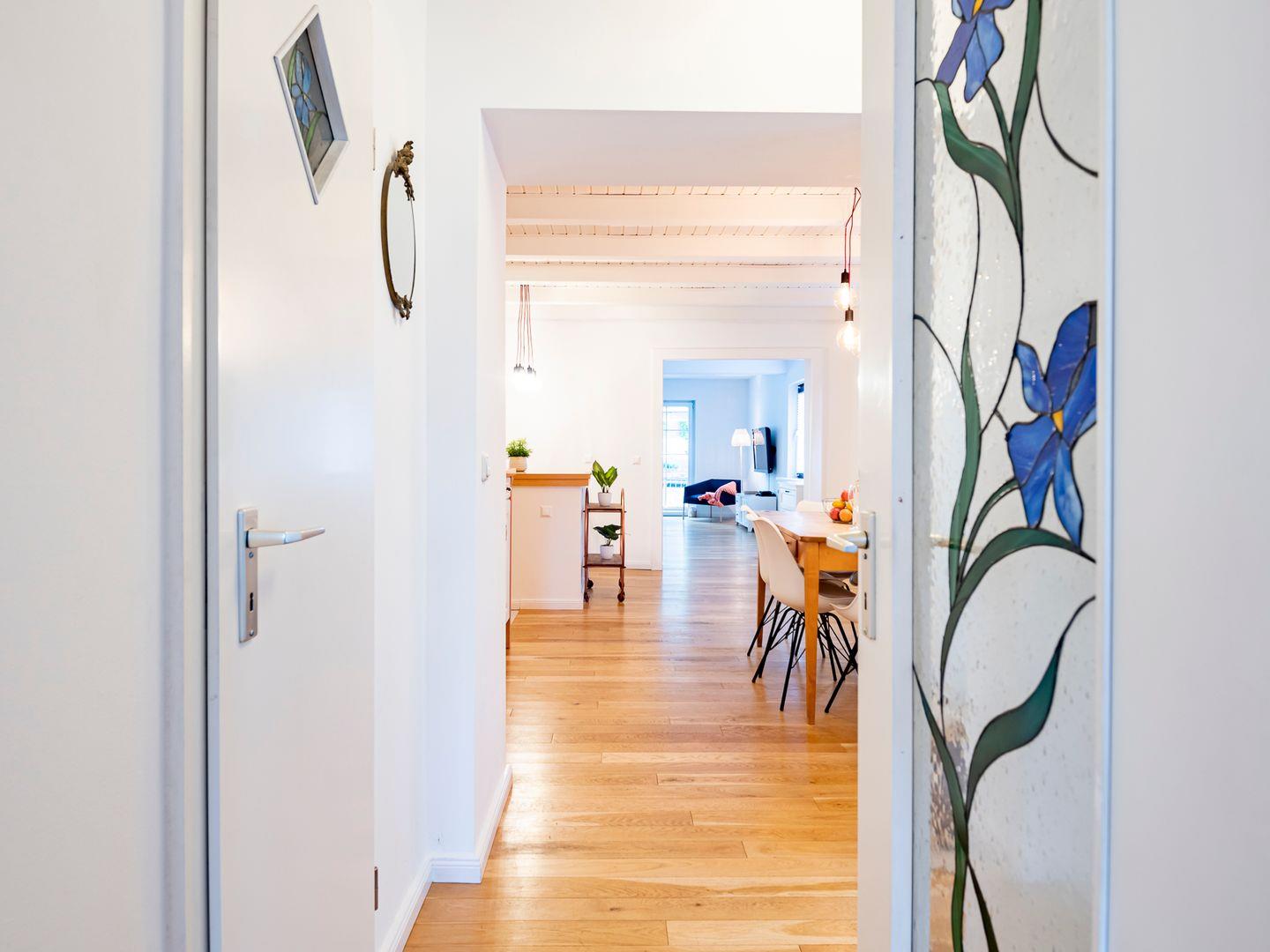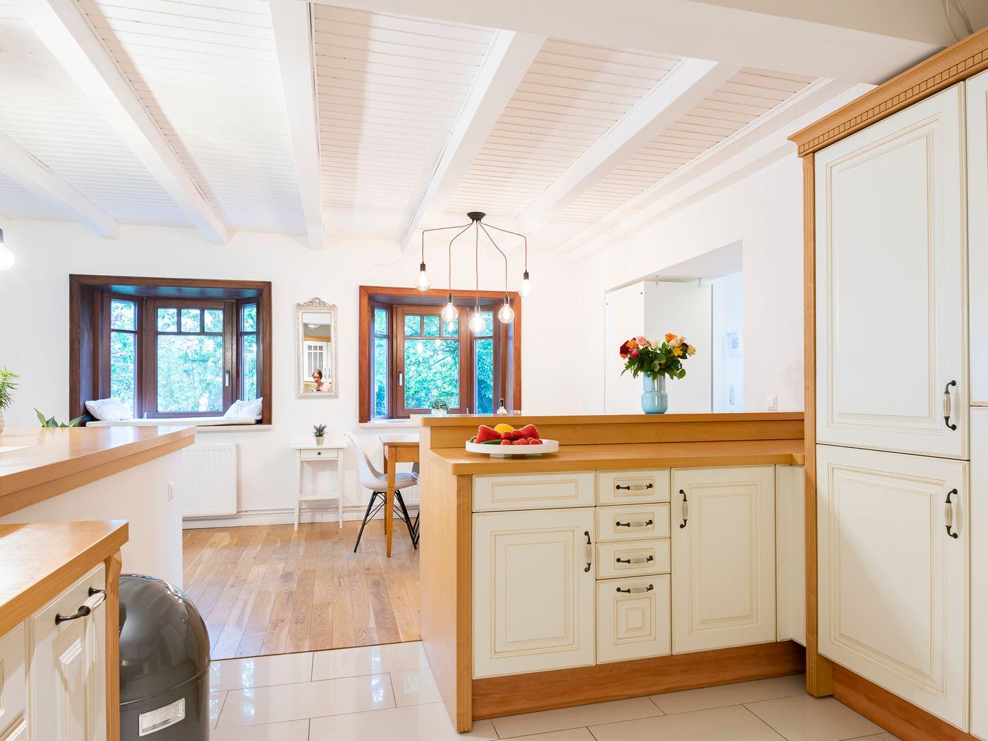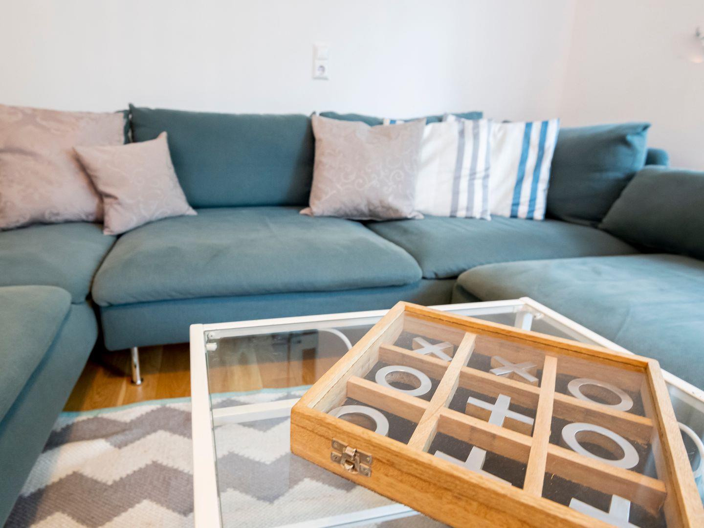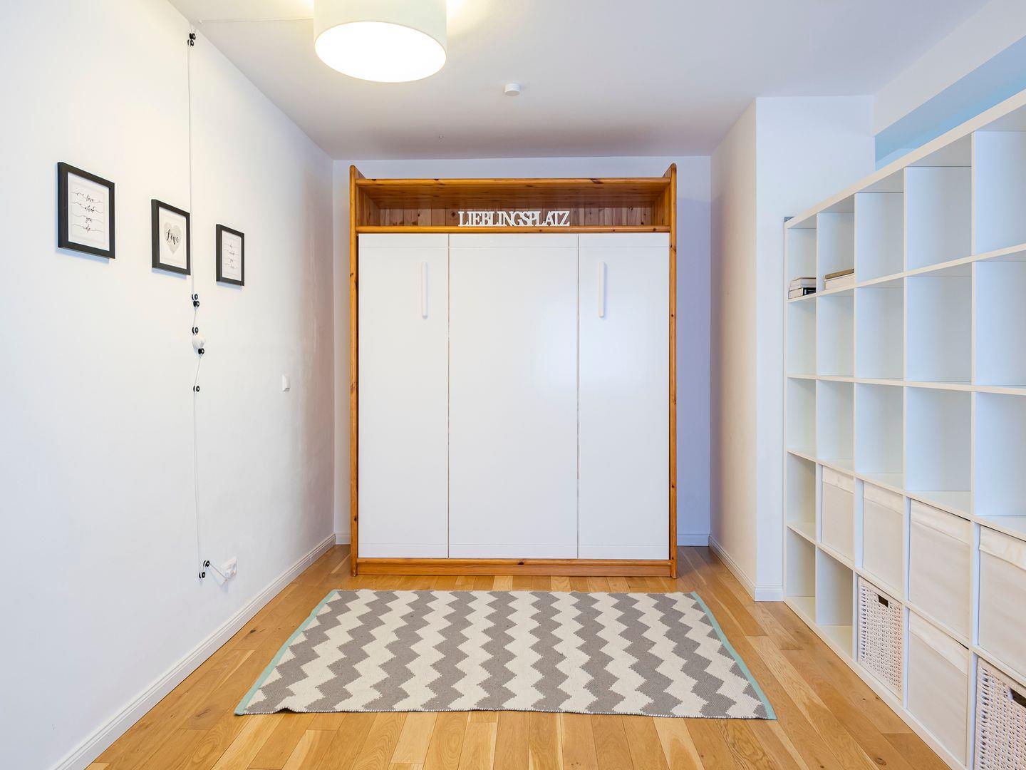 Ein Hauch von skandinavischem Chic trifft auf modernen Landhausstil, vereint mit klarem Design, viel Licht und lässigem Stilbewusstsein - hier erleben Sie pure Wohlfühlatmosphäre! Entspannen Sie auf der großzügigen und hochwertigen Sofalandschaft, während Flatscreen-TV, DVD-Player und kostenfreies WLAN für elektronische Unterhaltung sorgen. Ein Regal fungiert als visuelle Raumtrennung und bietet gleichzeitig Stauraum. Vom gemütlichen Essplatz aus genießen Sie einen wunderbaren Blick ins Grüne. Für einen zusätzlichen Schlafplatz für zwei Personen sorgt ein komfortables Schrankbett (eine Matratze, Liegefläche ca. 150 x 200 cm) im Wohnbereich. Plissees sorgen für eine angenehme Verdunkelung.