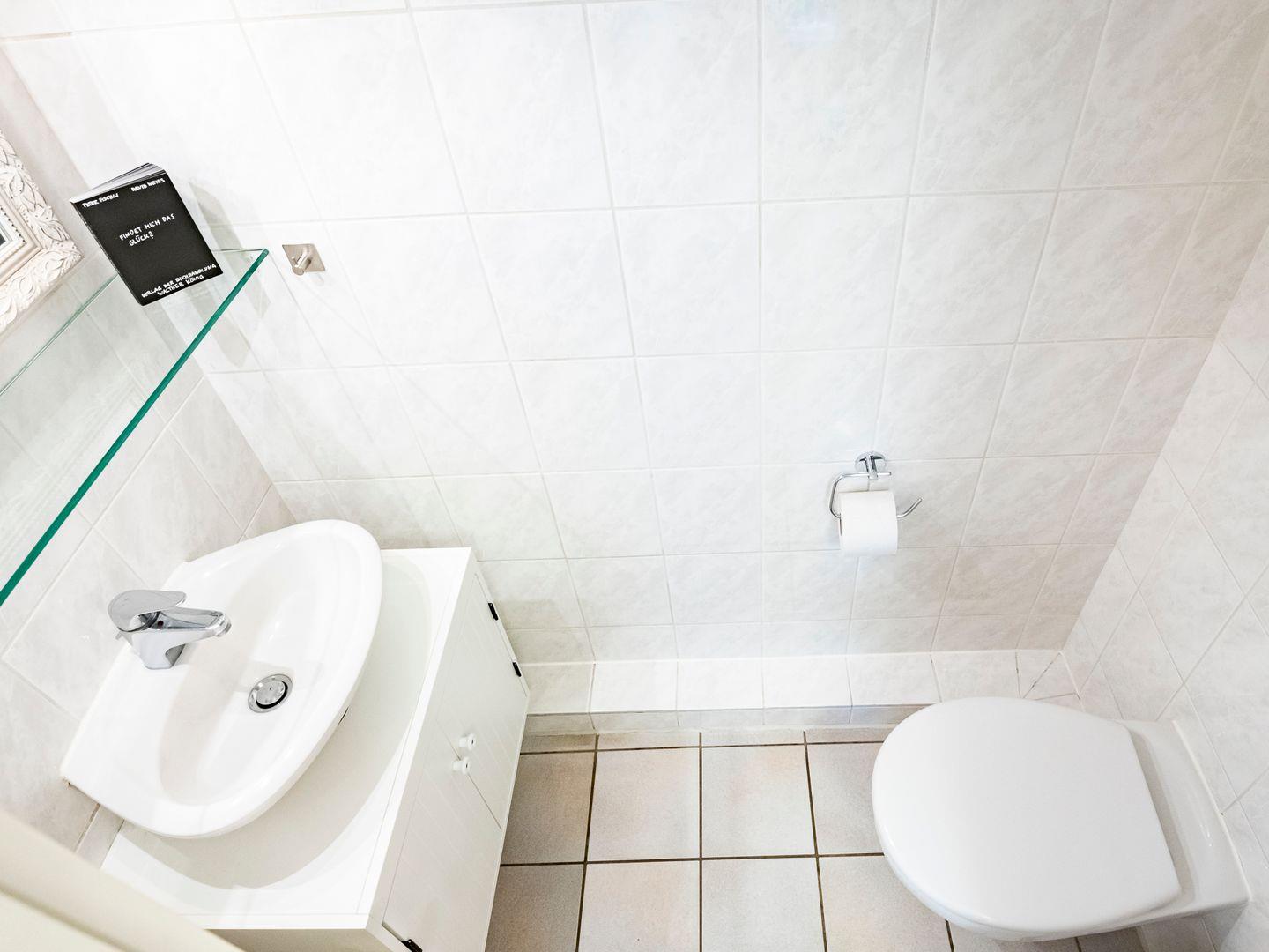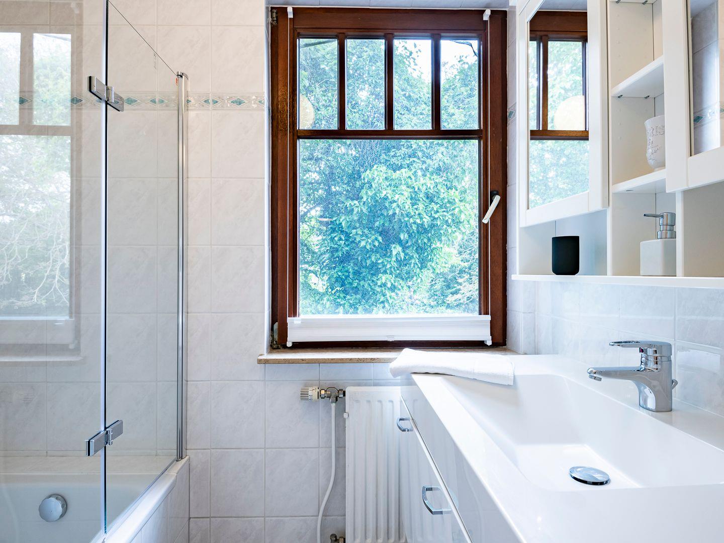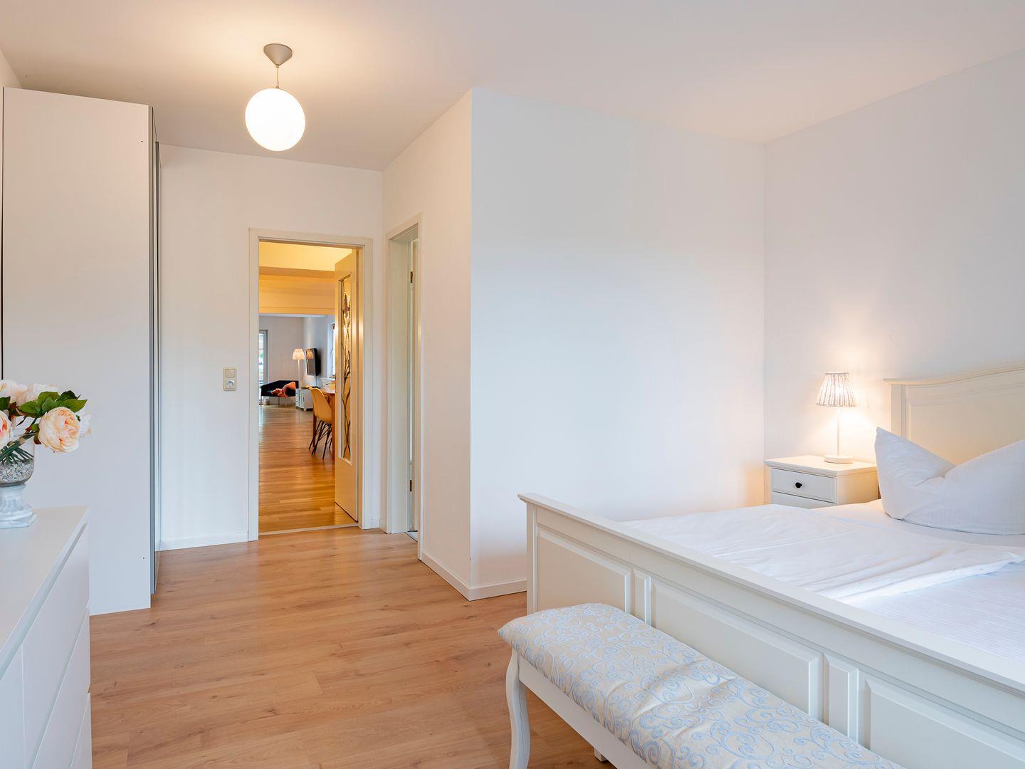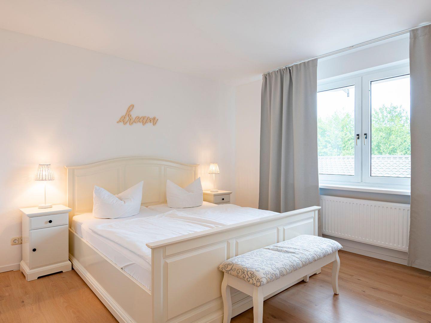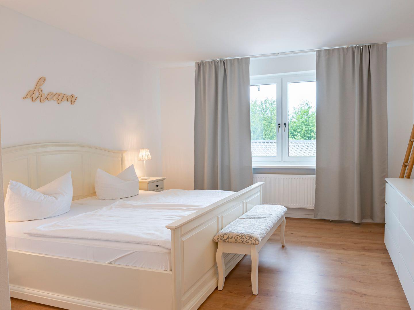 Das Schlafzimmer ist mit einem komfortablen Doppelbett (2x 90x200 cm), Nachttischen, Leselampen und einem Kleiderschrank eingerichtet. Plissees oder Gardinen sorgen für eine angenehme Verdunkelung während der Nacht. Hier finden Sie auch Platz für ein Kinderreisebett, falls benötigt. Angrenzend an das Schlafzimmer befindet sich das tageslichthelle Badezimmer mit einer Badewanne inklusive Duschvorrichtung, einem Fön und einem Waschbecken mit Spiegelschrank. Ein separates WC steht ebenfalls zur Verfügung.