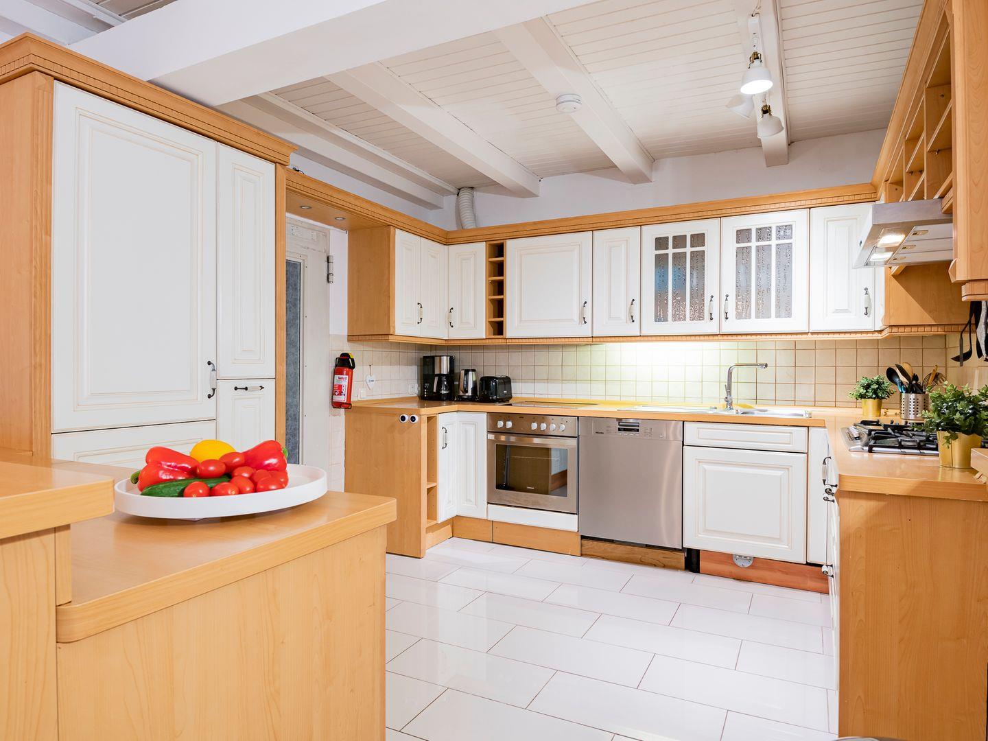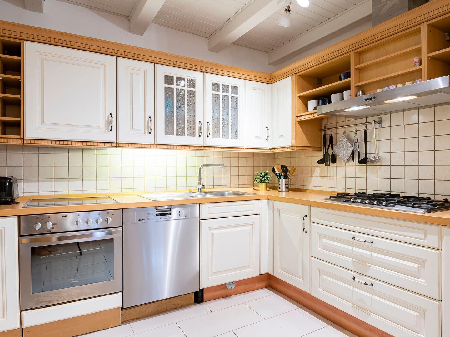 Von hier aus betreten Sie direkt Ihre eigene überdachte Terrasse, wo Sie in der gemütlichen Sitzecke den ersten Kaffee am Morgen genießen oder entspannt den Tag bei einem erfrischenden Getränk ausklingen lassen können. Die großzügige Küche ist bestens ausgestattet und bietet Annehmlichkeiten wie einen 4-Platten-Ceranherd, einen zusätzlichen Gasherd, einen Backofen und eine Spülmaschine - perfekt, um im Urlaub mit Freude zu kochen. Es gibt ausreichend Platz, um leckere Mahlzeiten zuzubereiten.
