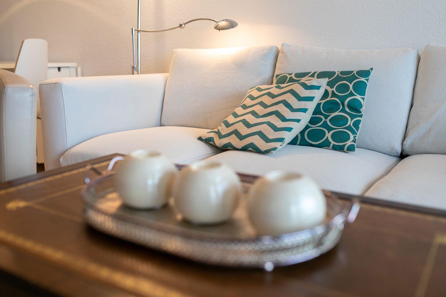 Die Ferienwohnung besticht durch ihren geschmackvollen und gemütlichen Landhausstil mit zeitgemäßer Einrichtung und einer angenehm hellen und lichtdurchfluteten Atmosphäre. In der modernen Küchenzeile setzen blaue Mosaikfliesen stilvolle Akzente. Annehmlichkeiten wie eine Spülmaschine, eine Mikrowelle, ein 2-Platten-Ceranherd und ein Kühlschrank mit Gefrierfach erleichtern den Urlaubsalltag.