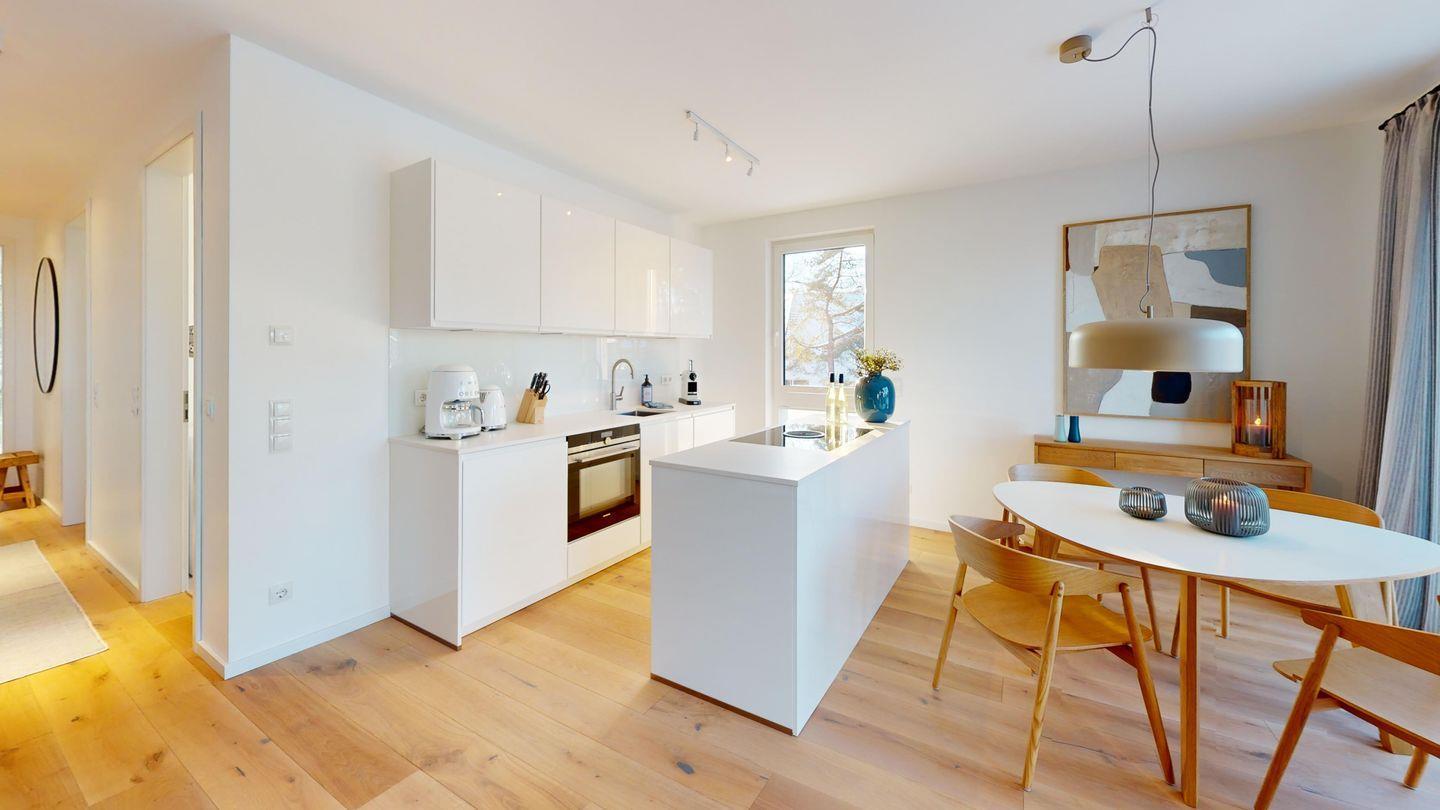 Die lichtdurchflutete Wohnung im ersten Stock bietet alles für eine erholsame Auszeit: ein offener Wohn- und Essbereich mit Sofa und Esstisch, eine voll ausgestattete Küche für gemeinsame Genussmomente sowie ein großzügiger Balkon – ideal für den ersten Kaffee am Morgen oder den entspannten Abend.