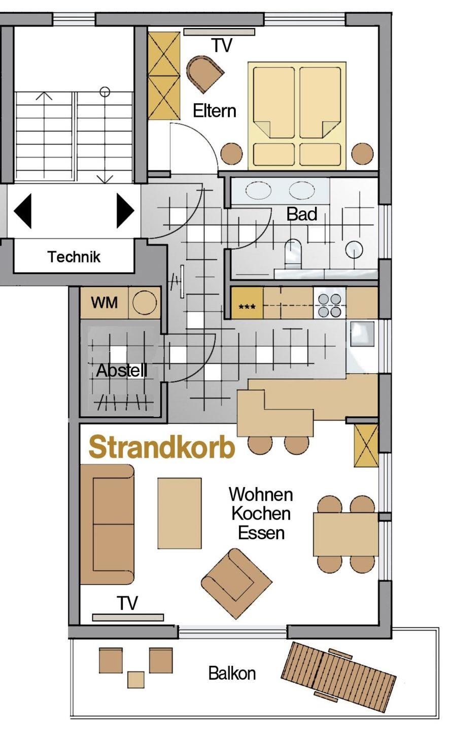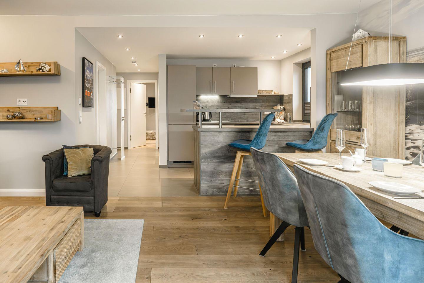Die Ferienwohnungen Strandkorb und Strandblick befinden sich im 1. Obergeschoss. Sie sind jeweils 60 qm groß, für bis zu vier Personen ausgestattet und zeichnen sich durch ihre helle Gestaltung, den hochwertigen Echtholz-Parkettboden und ihre anspruchsvolle und detailverliebte Einrichtung aus. Mittelpunkt jeder Wohnungen ist der offene Wohnbereich, der Küche, Wohn- und Essbereich miteinander verbindet.