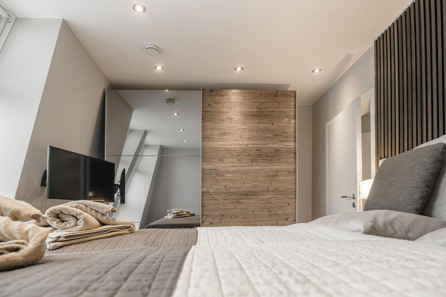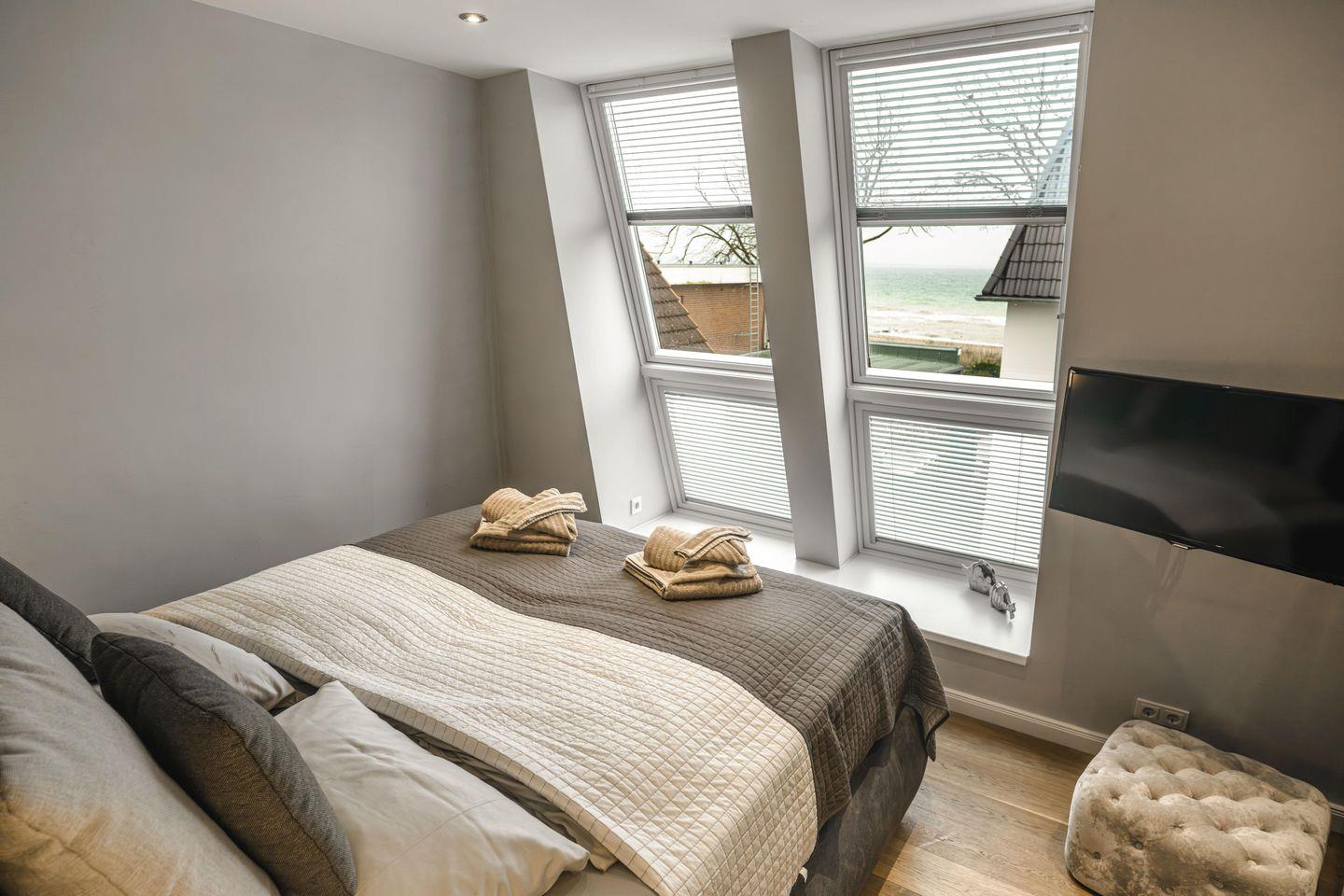 Die Ferienwohnungen Düne und Leuchtturm befinden sich im 2. Obergeschoss und entsprechen vom Schnitt, der Gestaltung und Ausstattung den Ferienwohnungen Strandblick und Strandkorb. Auch sie sind für bis zu vier Personen konzipiert, mit großen Fenstern und Echtholz-Parkettboden ausgestattet.