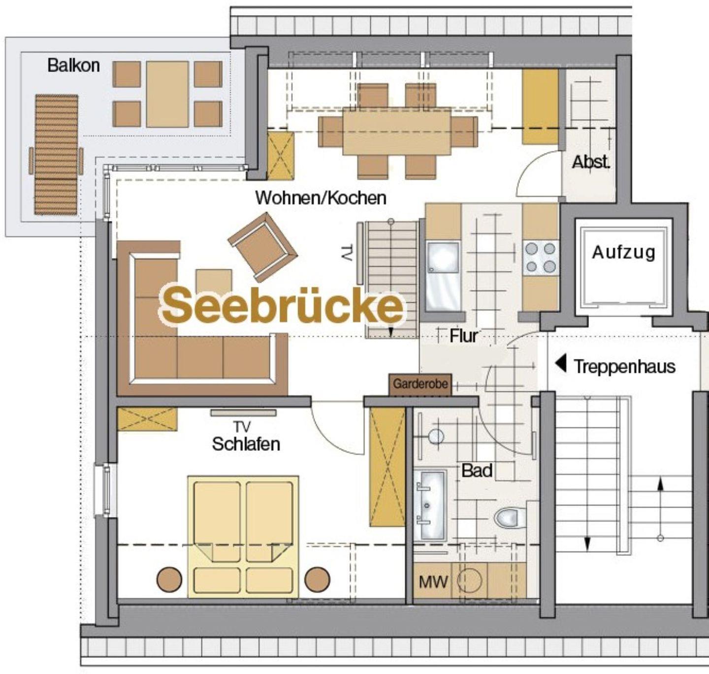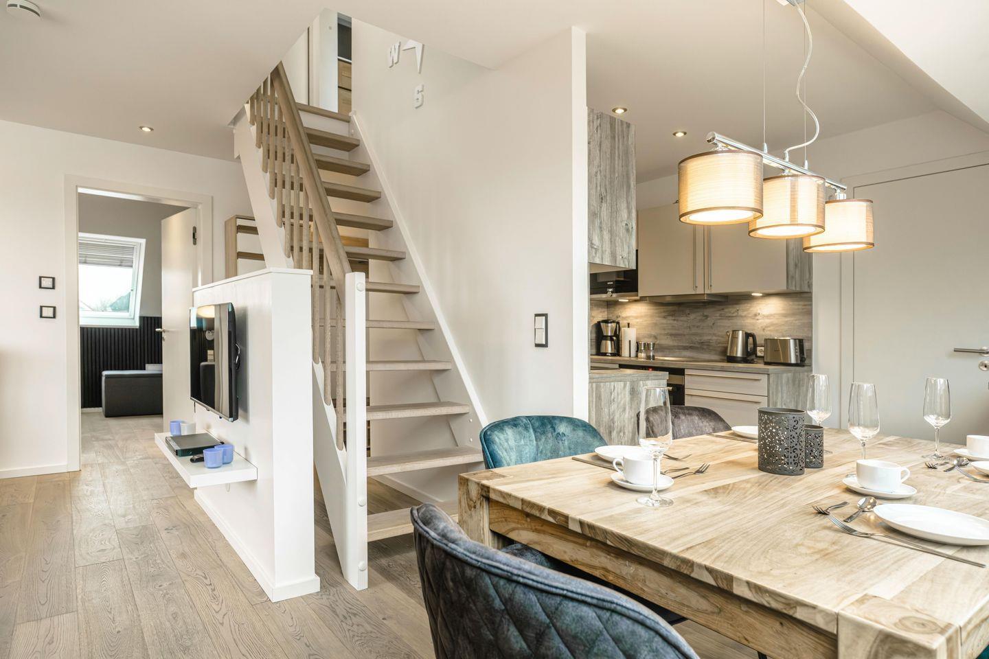 Die Ferienwohnungen Seebrücke und Seestern befinden sich im 2. Obergeschoss. Es sind 70 qm große Maisonette-Wohnungen für bis zu sechs Personen. Wie die anderen Wohnungen des Baltic House zeichnen auch sie sich durch ein helles und modernes Design, ihre anspruchsvolle Möblierung und den Echtholz-Parkettboden mit Fußbodenheizung aus.