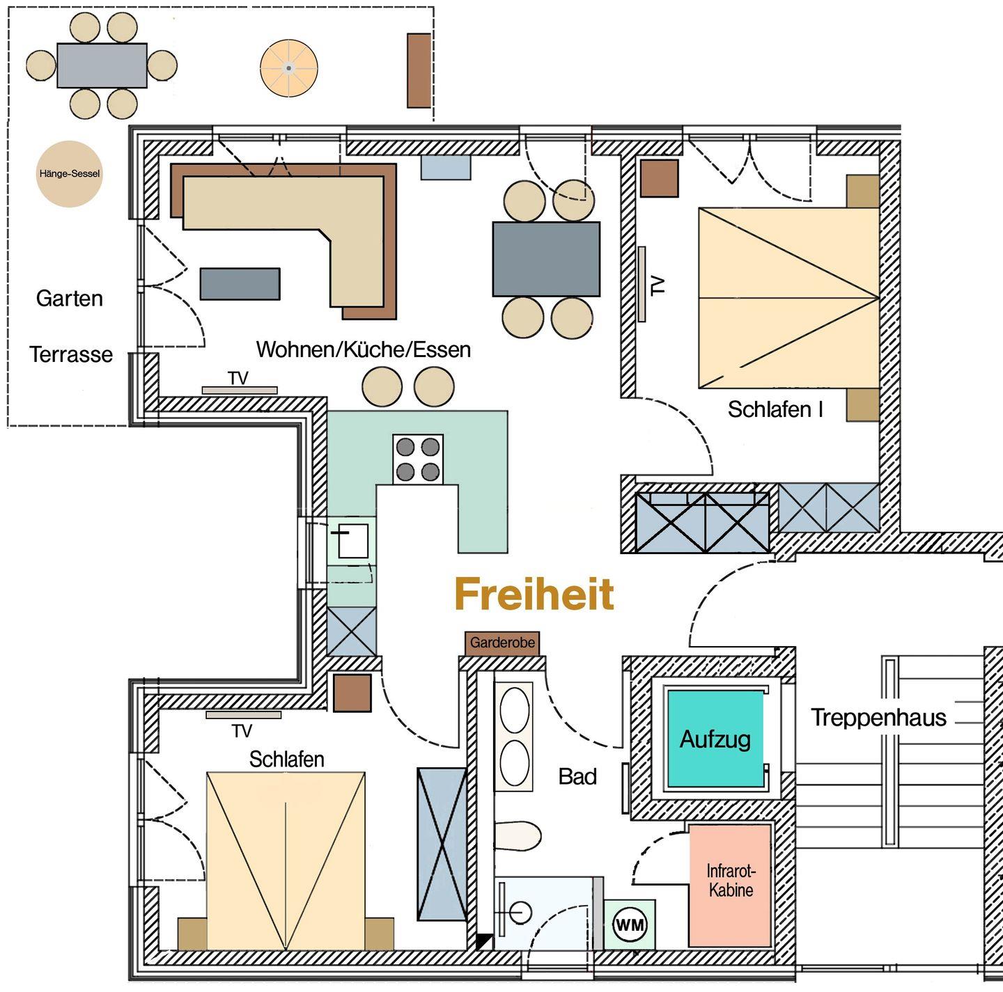Die Ferienwohnung Freiheit befindet sich im Erdgeschoss und zeichnet sich durch ihr helles Design und ein topaktuelles Interieur aus. Sie ist ca. 70 qm groß und bietet bis zu sechs Personen Platz und Komfort auf bestem Baltic Houses Niveau. Highlights der Wohnung sind eine Infrarotkabine und ein ca. 100 qm großer Garten – perfekt für gemeinsame Essen, fürs private Sonnenbaden oder wildes Toben mit den Kids.