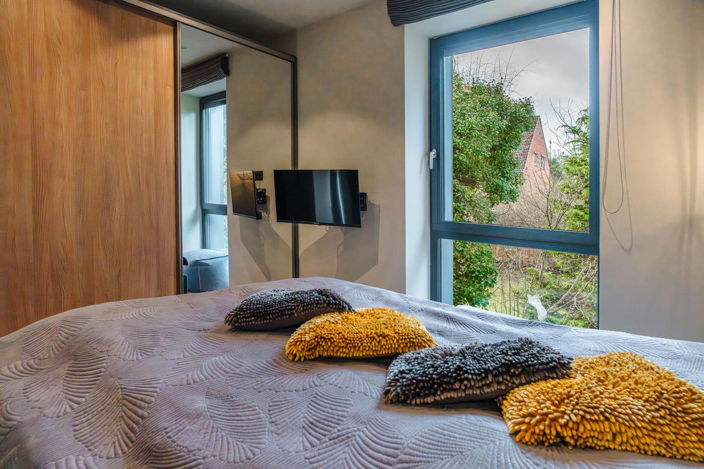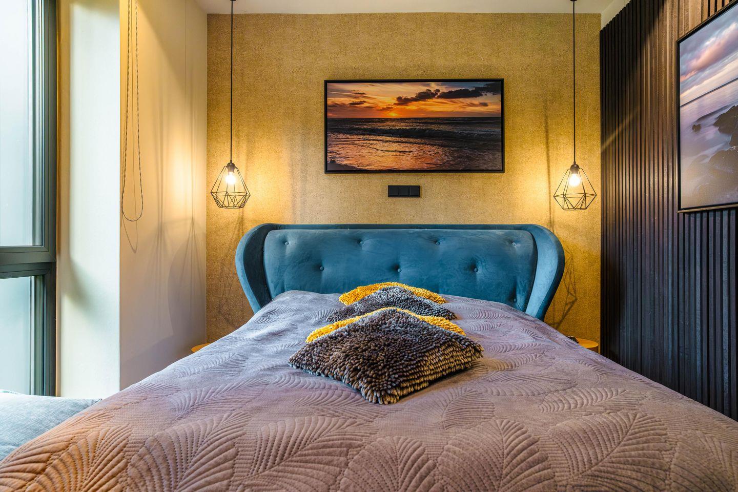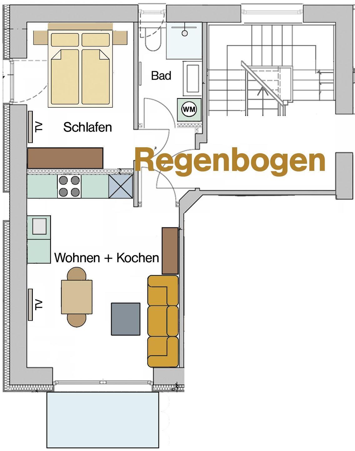 Die Ferienwohnung „Regenbogen“ verteilt sich auf 38 stilvoll und mit viel Charme eingerichteten Quadratmetern. Auch in unserer „kleinsten“ Wohnung fehlt es Ihnen an nichts. Das gemütliche Schlafzimmer ist mit einem großen Boxspringbett ausgestattet. Der Mittelpunkt dieser Wohnung ist der Wohn- und Essbereich. Hier können Sie gemütliche Kochabende zu zweit verbringen und anschließend auf dem 6 qm großen Balkon den Abendn ausklingen lassen. Wie alle Wohnungen, ist auch diese mit Fußbodenheizung und hochwertigen Möbeln ausgestattet.
