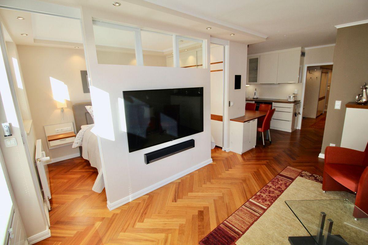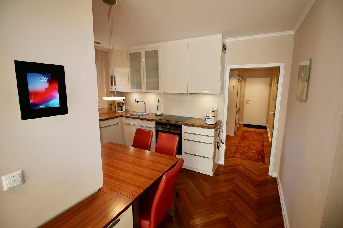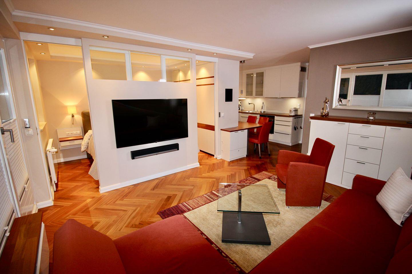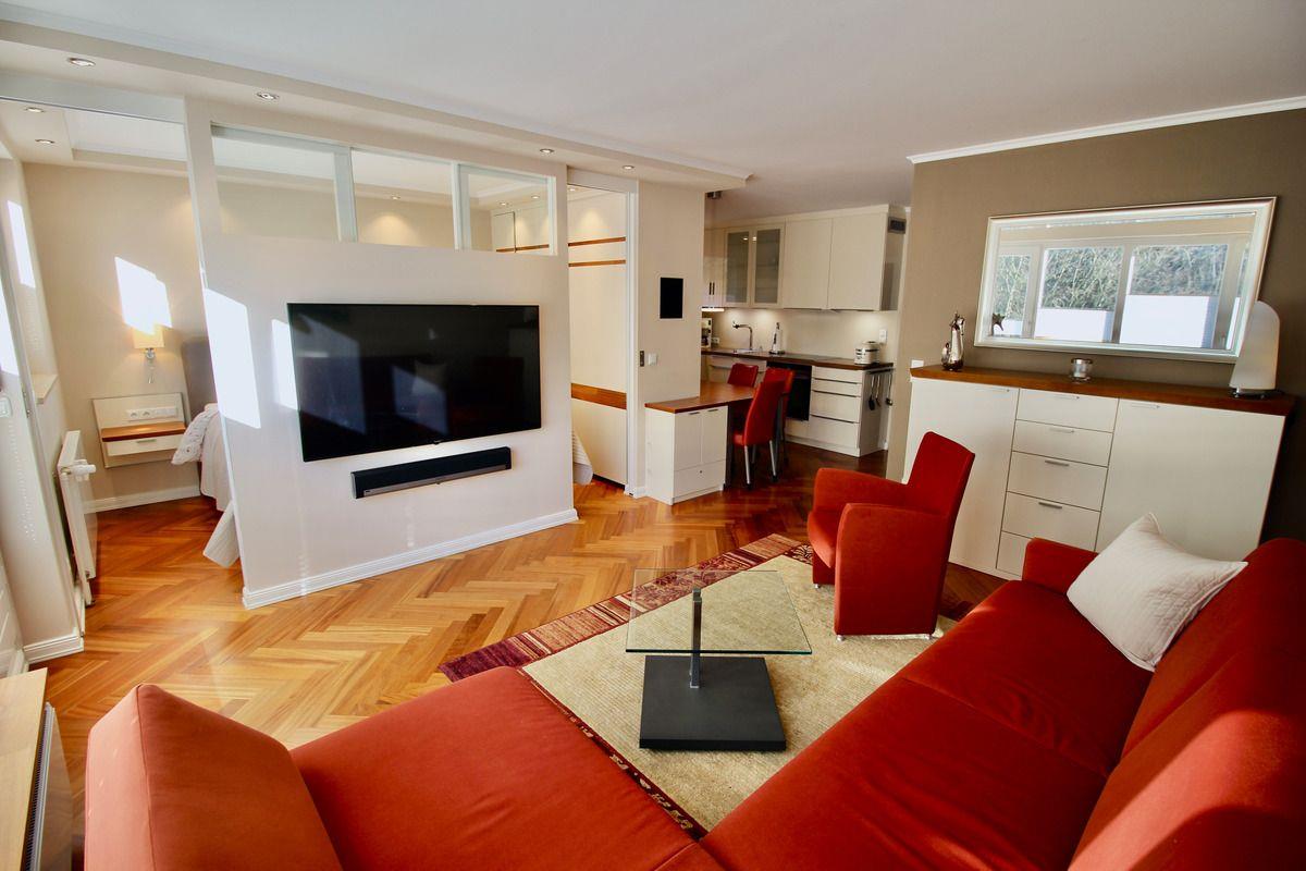 Im großzügigen Wohnbereich laden ein gemütliches Sofa und ein Sessel mit Blick auf einen 65-Zoll Smart-Flat-TV zum Verweilen ein. Magenta-TV, Netflix (mit Ihrem persönlichen Account), Apple-TV und ein Blu-Ray-Player sind nur einige der technischen Highlights dieser Wohnung. Ein in der Wand integriertes iPad ermöglicht die bequeme Steuerung aller Funktionen oder die Ansteuerung der Sonos Musikanlage.