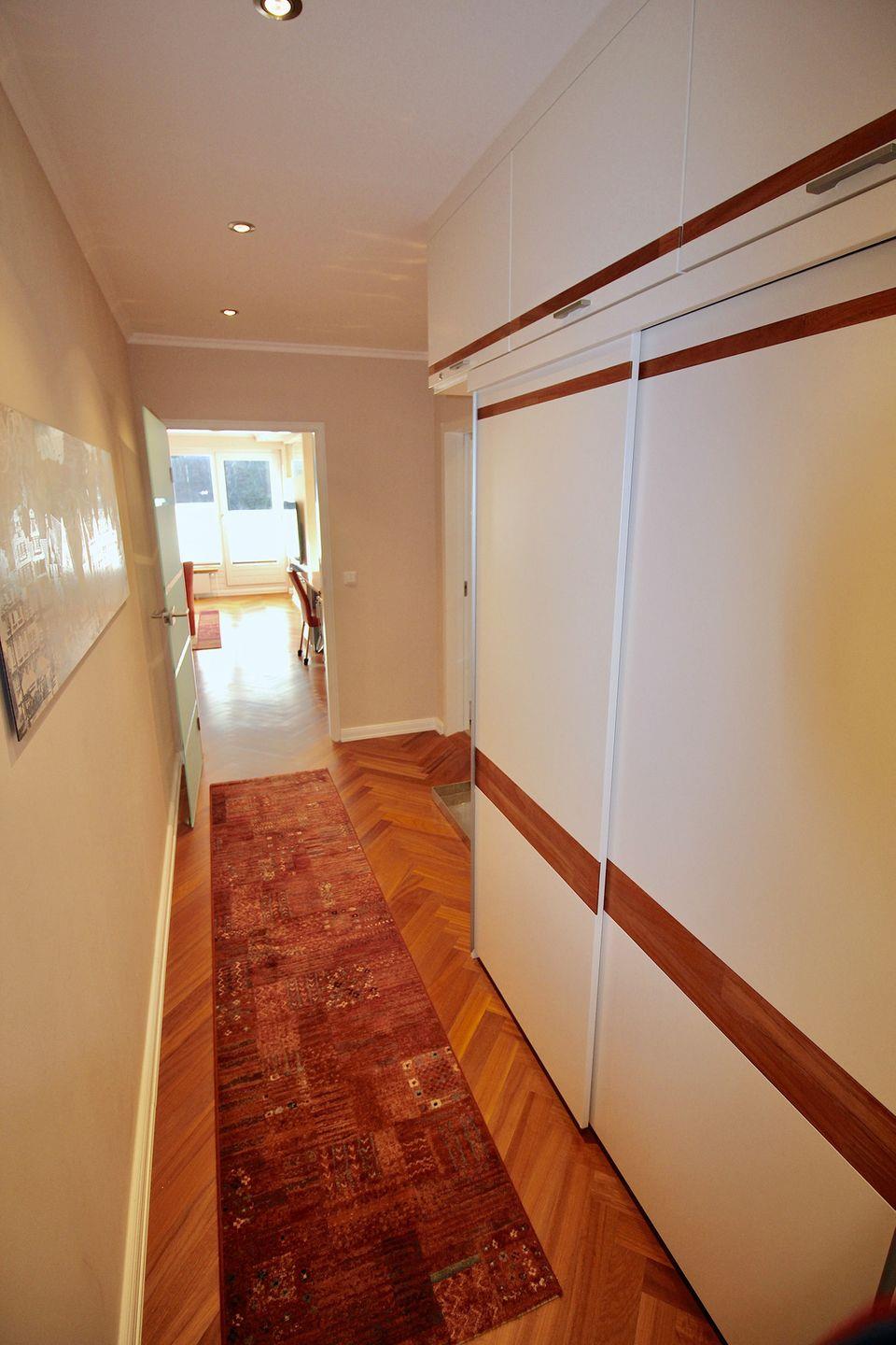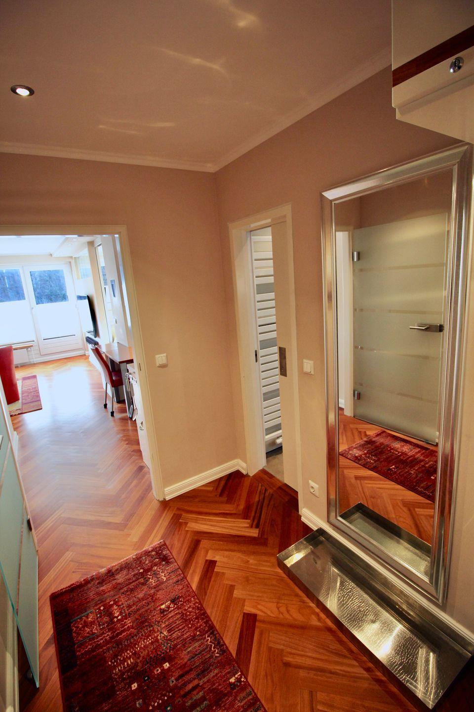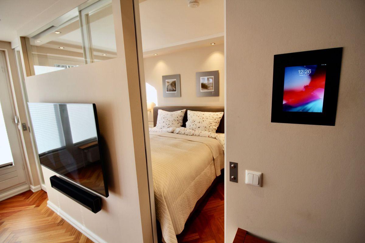 Im großzügigen Wohnbereich laden ein gemütliches Sofa und ein Sessel mit Blick auf einen 65-Zoll Smart-Flat-TV zum Verweilen ein. Magenta-TV, Netflix (mit Ihrem persönlichen Account), Apple-TV und ein Blu-Ray-Player sind nur einige der technischen Highlights dieser Wohnung. Ein in der Wand integriertes iPad ermöglicht die bequeme Steuerung aller Funktionen oder die Ansteuerung der Sonos Musikanlage.