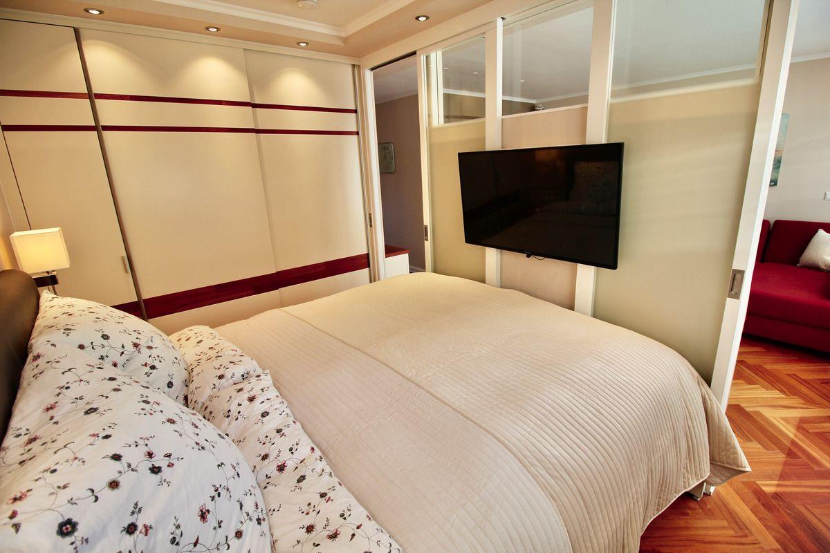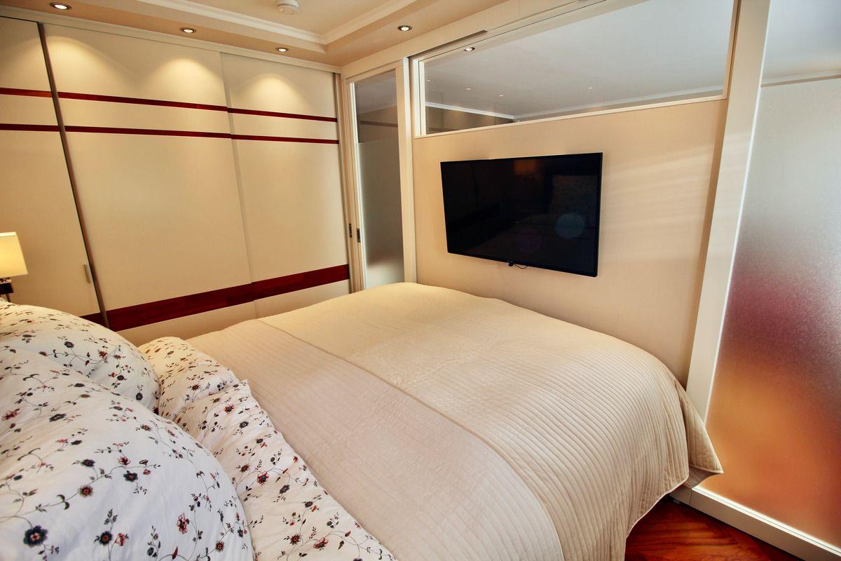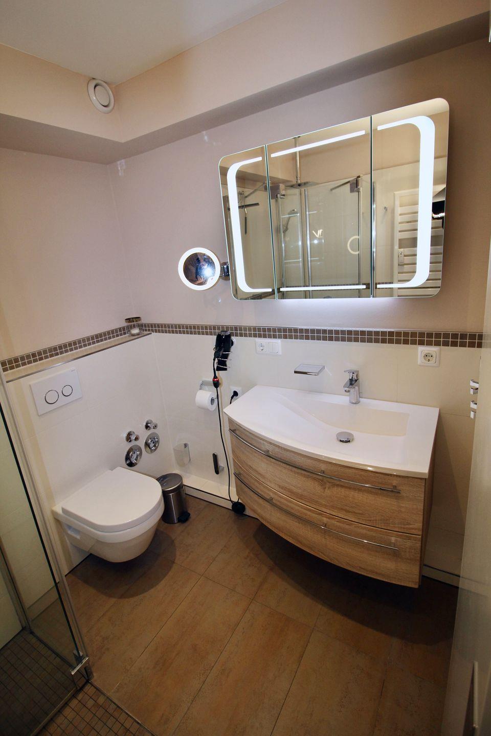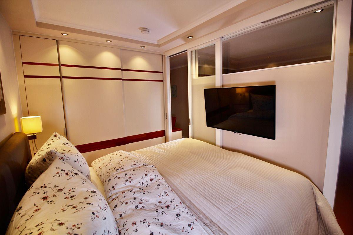Durch zwei elektrische Schiebetüren gelangen Sie in das kleine, aber feine Schlafzimmer mit einem luxuriösen Boxspringbett, einem großzügigen Einbaukleiderschrank und einem weiteren Smart-Flat-TV. Das moderne Badezimmer ist mit einer bodentiefen Rainshower-Dusche, einem beleuchteten Spiegelschrank, einem Kosmetikspiegel und einem Handtuchheizkörper ausgestattet.