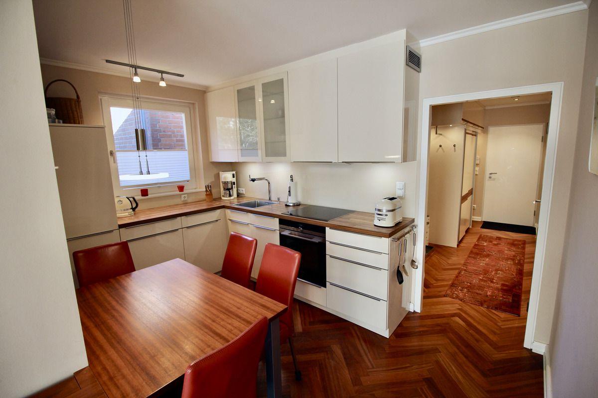 Die offene Küche bietet Platz für bis zu 4 Personen und ist mit hochwertigen Elektrogeräten, darunter Backofen, Mikrowelle und Induktionskochfeld, sowie mit einer Kaffeefiltermaschine, einem Toaster und einem Wasserkocher der Marke Kitchenaid ausgestattet.