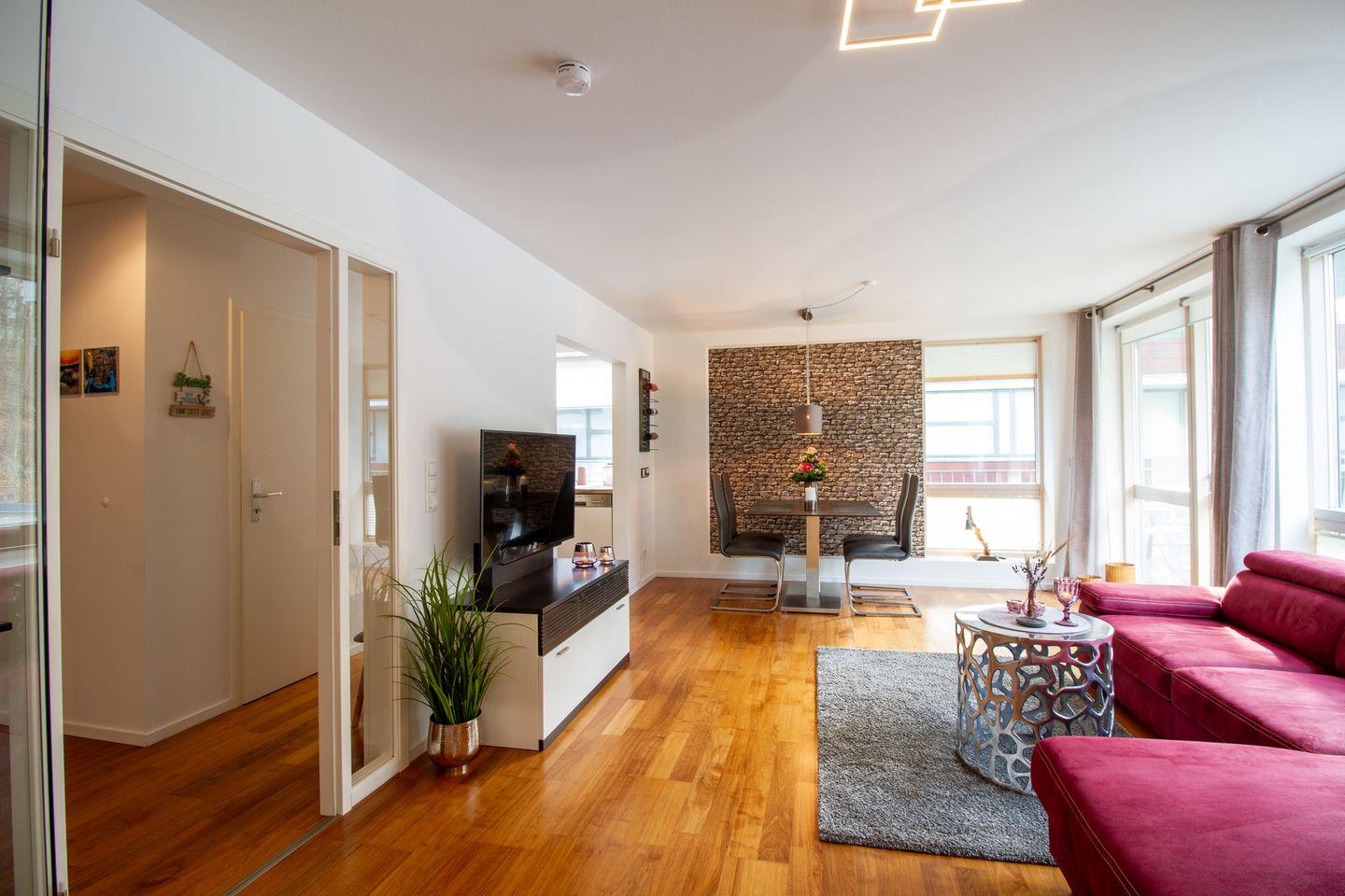 Die Wohnung bietet einen kombinierten Wohn-/Essbereich mit einem hochwertigen Schlafsofa und einer offenen Einbauküche. Der großzügige Süd-/Westbalkon ist mit hochwertigen Sitzmöbeln ausgestattet und lädt zum Frühstücken unter freiem Himmel oder einem Sundowner ein. Das Schlafzimmer verfügt über ein Boxspringbett, einen großen Kleiderschrank und einen Fernseher. Das luxuriöse Bad ist mit einer großzügig angelegten Walk-in Dusche ausgestattet. Die Wohnung eignet sich ideal für 2-3 Personen, da es nur ein separates Schlafzimmer gibt. Die Waschmaschine im Keller steht exklusiv unseren Gästen zur Verfügung.