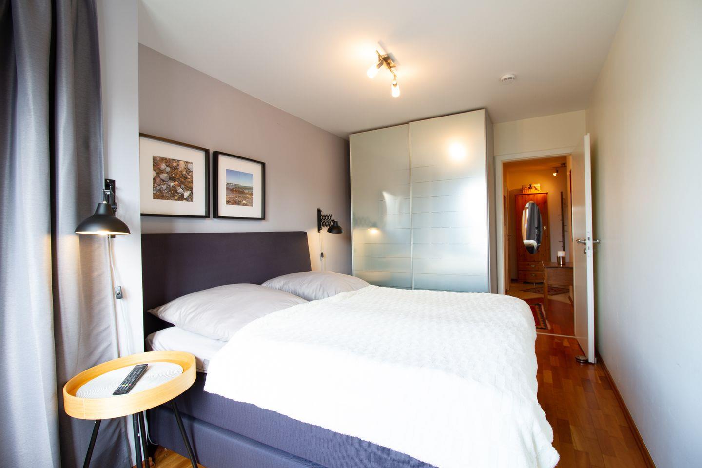 Die Wohnung erstreckt sich über eine Fläche von 60 m² und teilt sich in einen Wohnbereich mit offener Küche, eine kleine Bibliothek mit TV und das Schlafsofa, sowie ein Badezimmer mit Wannenbad und Glas-Duschtrennwand auf.