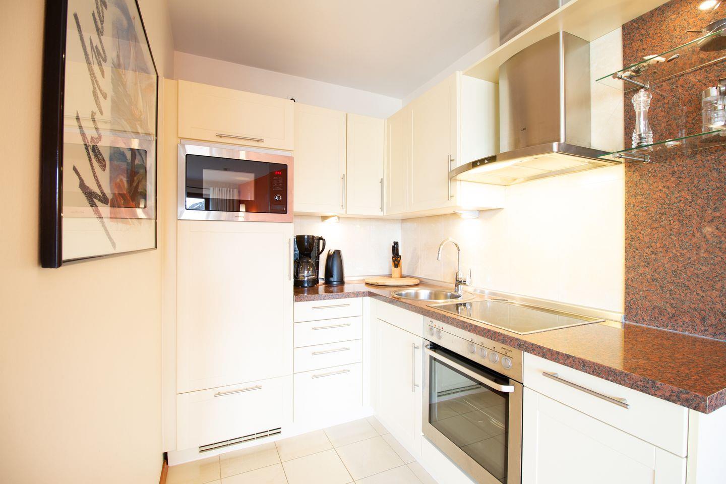 Die gut ausgestattete Küche verfügt über eine Spülmaschine, 4-Platten-Ceranfeld, Backofen, Mikrowelle, Toaster, Kaffeemaschine und Wasserkocher.