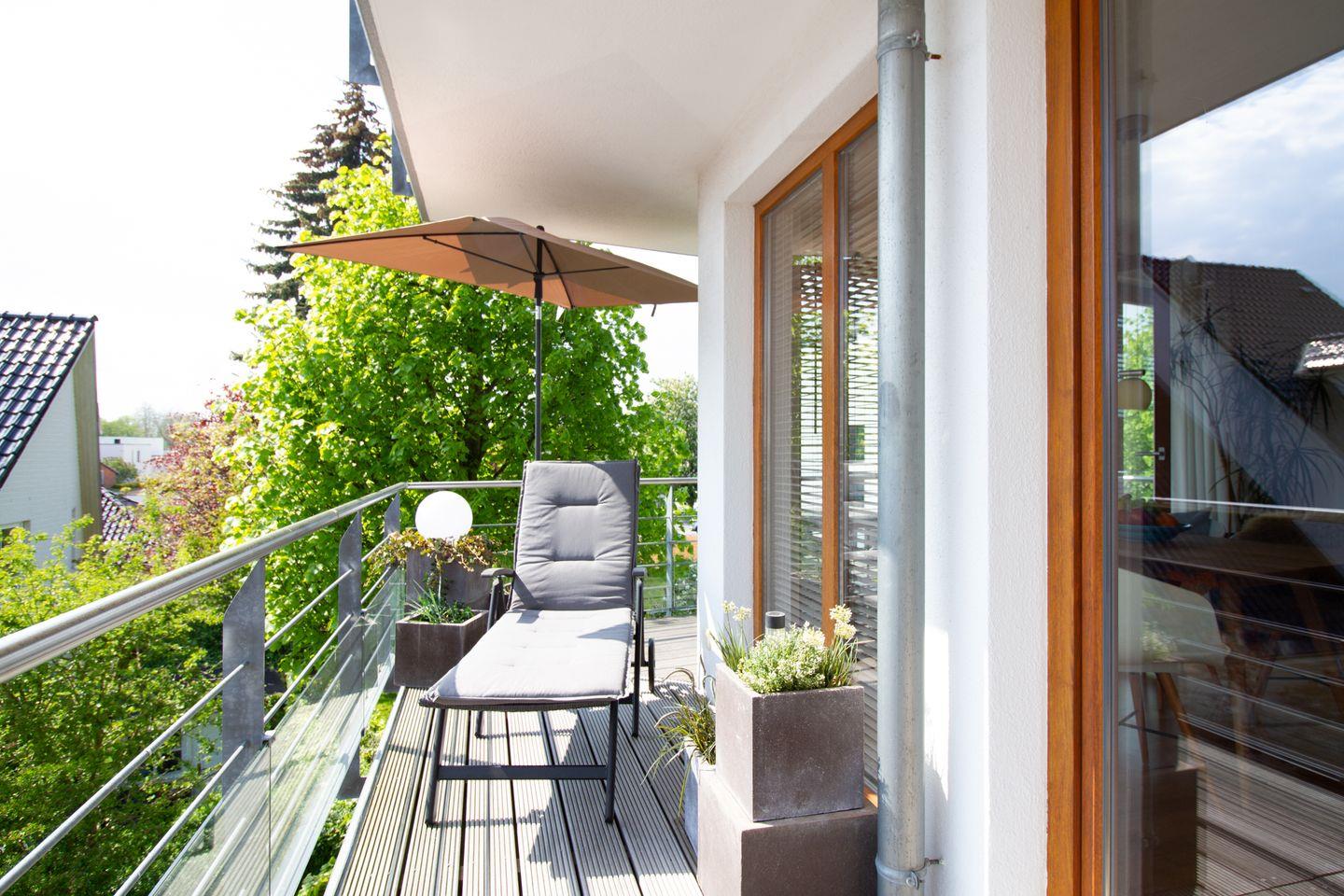 Der gartenseitige Südwestbalkon ist von Schlafzimmer und Wohnzimmer aus zugänglich und mit hochwertigen Holzmöbeln ausgestattet. Im Garten befindet sich ein abschließbarer Fahrradschuppen, in dem zwei Fahrradplätze zur Verfügung stehen. Ein reservierter Parkplatz befindet sich direkt am Haus, und gegen Gebühr kann je nach Verfügbarkeit ein Tiefgaragenparkplatz vermittelt werden.