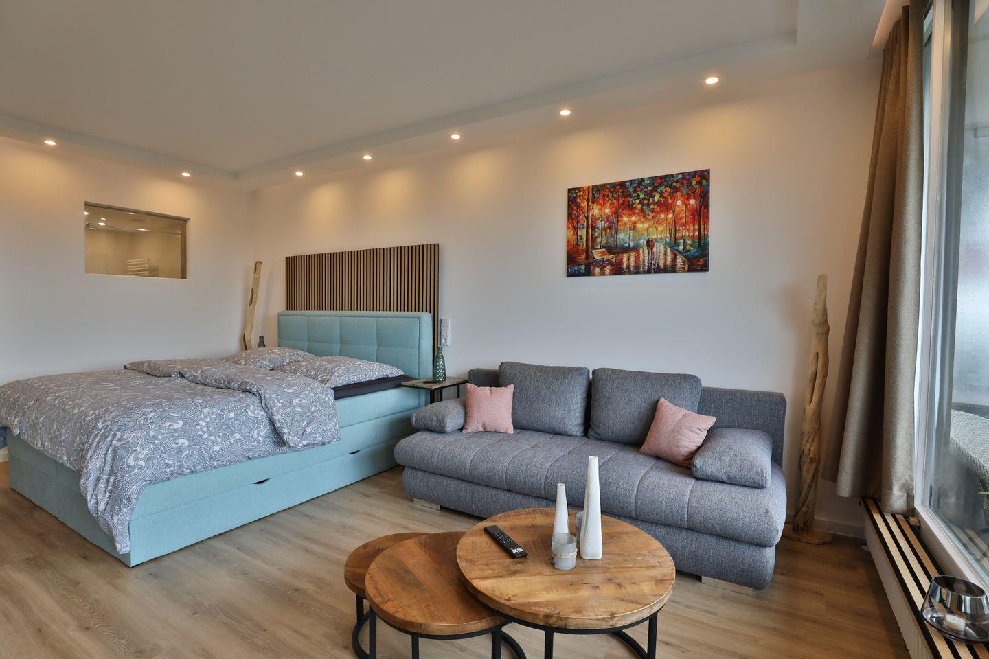Die barrierearm gestaltete und frisch sanierte Ferienwohnung ist bequem mit dem Fahrstuhl erreichbar. Ein exklusives und geschmackvolles Interieur erwartet Sie, darunter ein großes, gemütliches Boxspringbett, eine bequeme Sitzecke sowie ein kleiner Essbereich mit Bartisch und -stühlen. Im großzügigen Kleiderschrank finden Kleidung und Koffer problemlos Platz. Die voll ausgestattete Küchenzeile ermöglicht das Zubereiten leckerer Mahlzeiten.